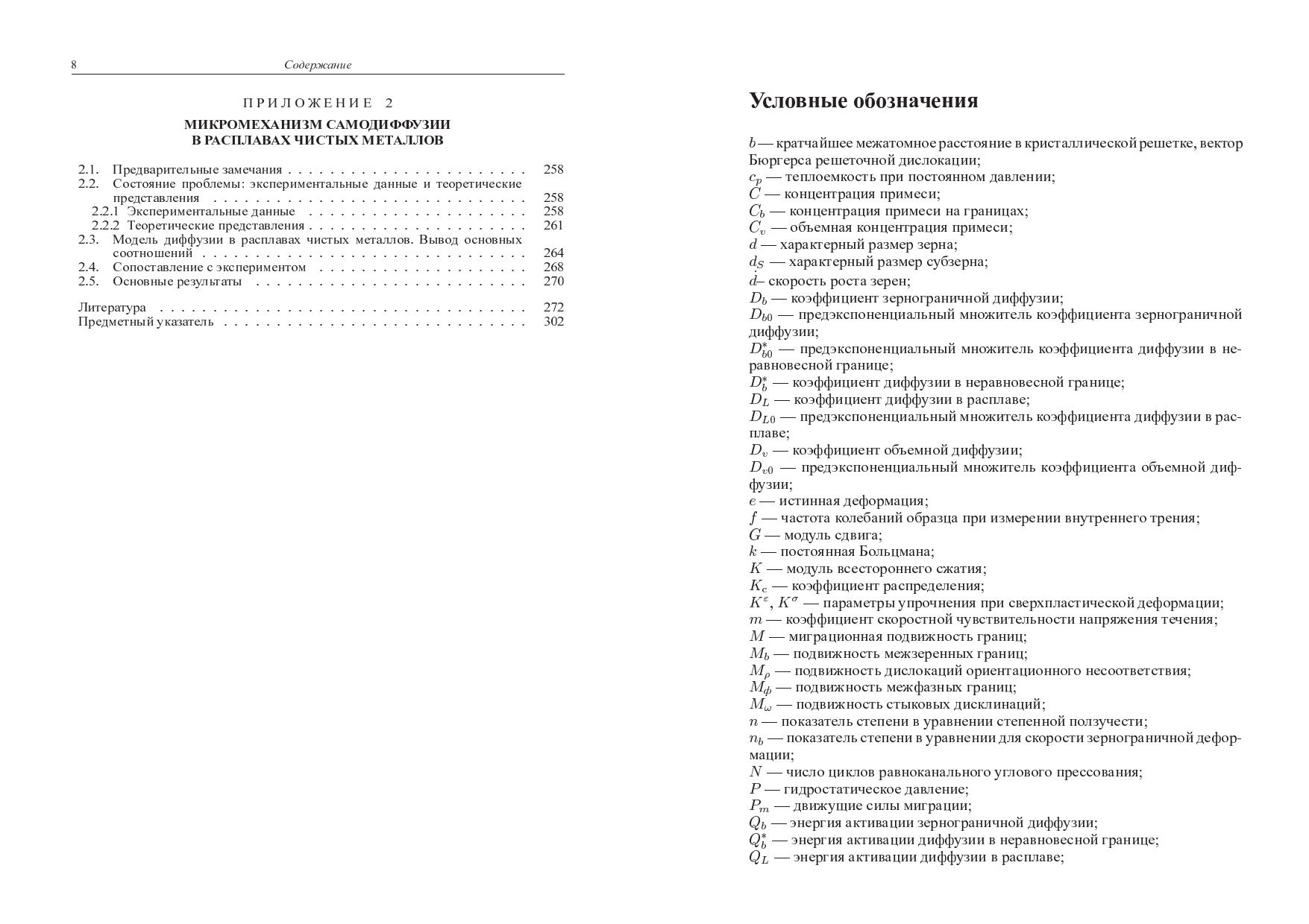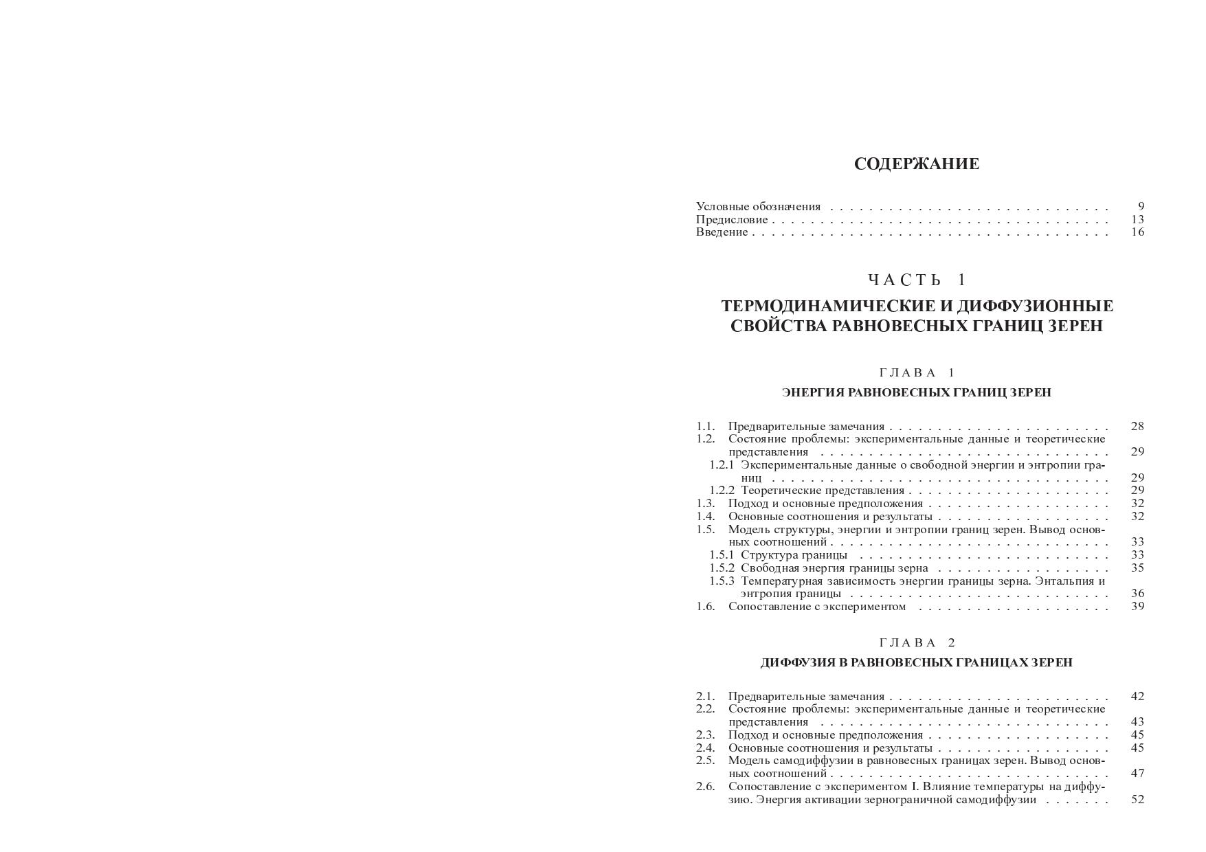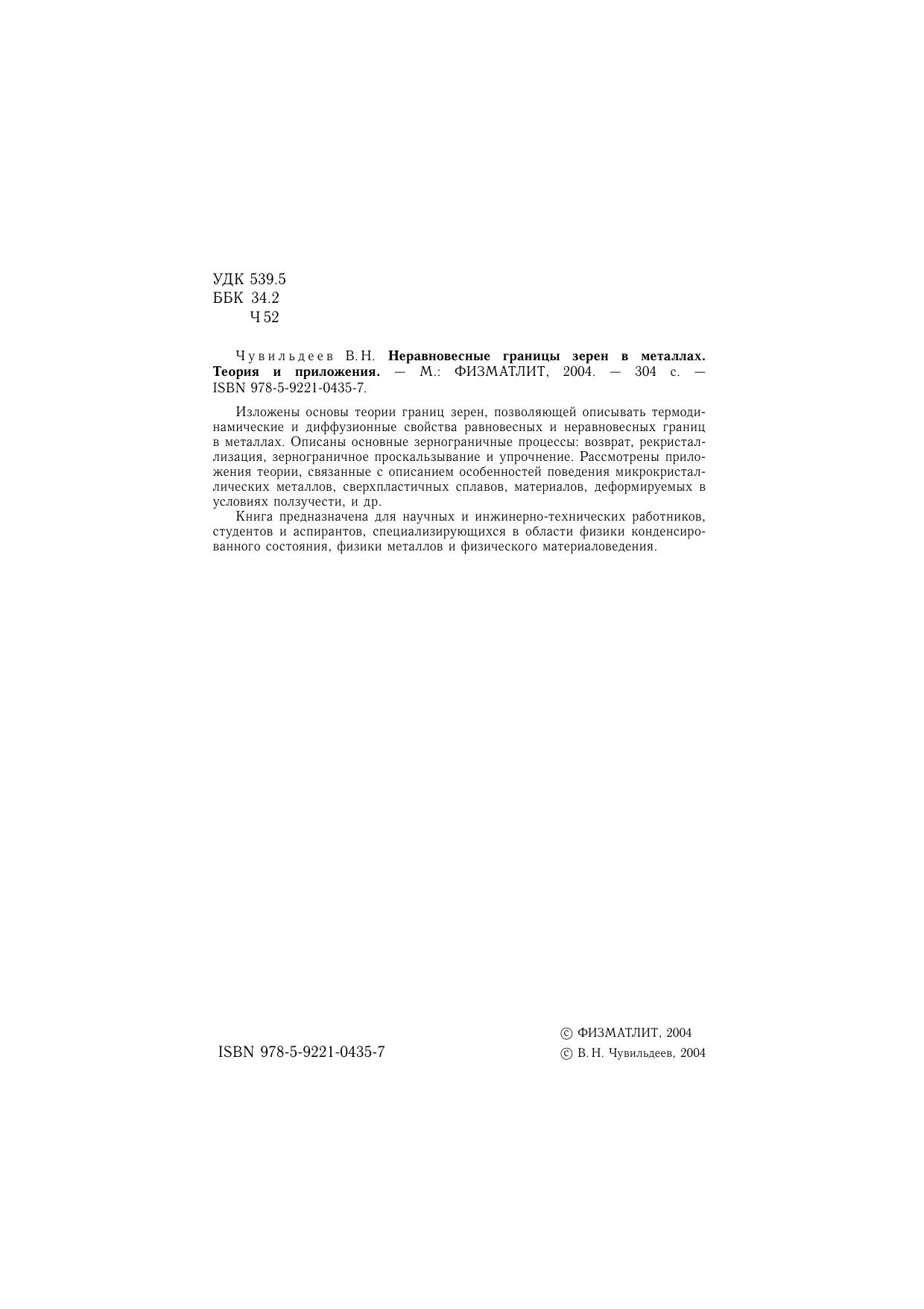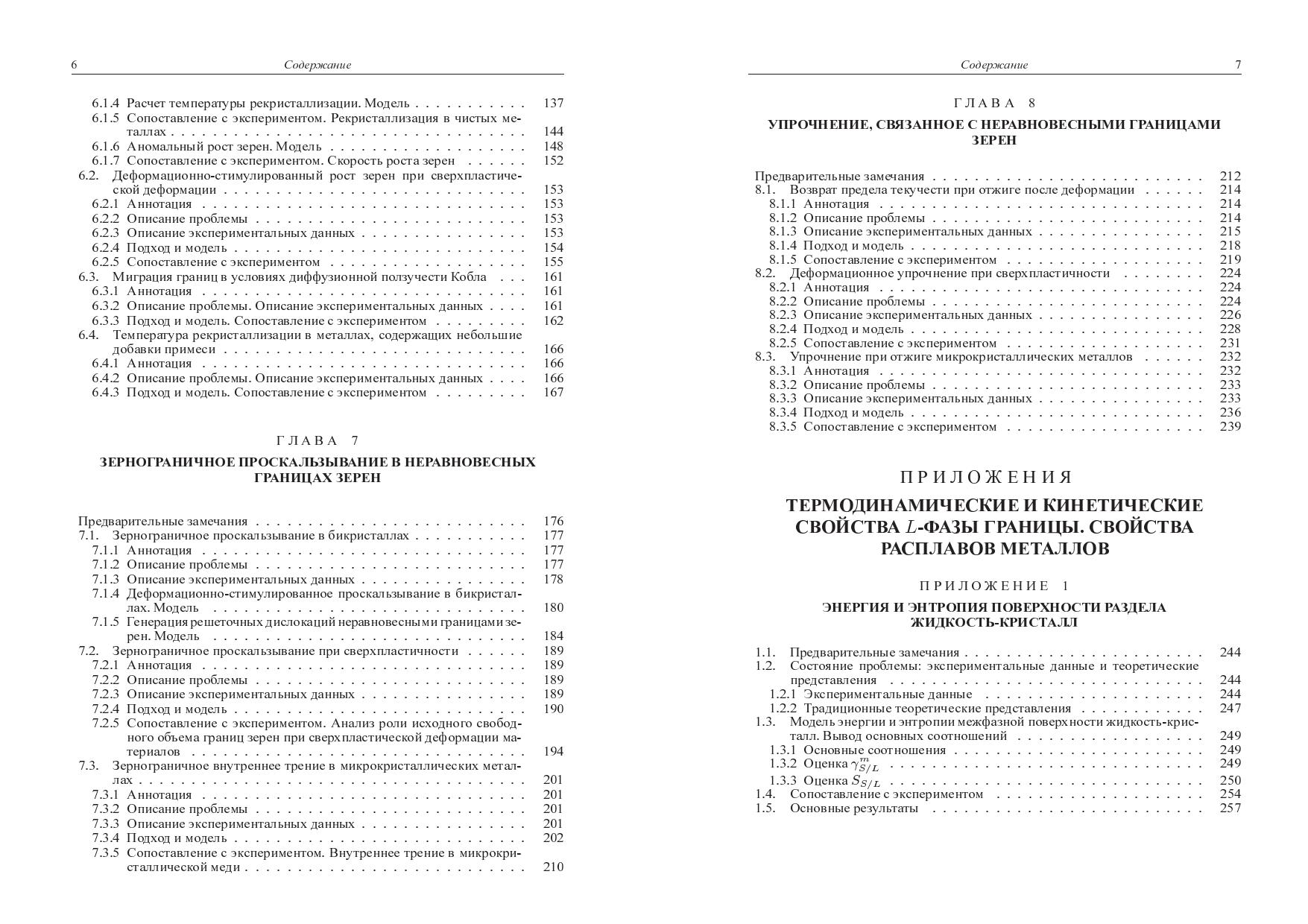 Изложены основы теории границ зерен, позволяющей описывать термодинамические и диффузионные свойства равновесных и неравновесных границ в металлах. Описаны основные зернограничные процессы: возврат, рекристаллизация, зернограничное проскальзывание и упрочнение. Рассмотрены приложения теории, связанные с описанием особенностей поведения микрокристаллических металлов, сверхпластичных сплавов, материалов, деформируемых в условиях ползучести, и др. Книга предназначена для научных и инжинерно-технических работников, студентов и аспирантов, специализирующихся в области физики конденсированного состояния, физики металлов и физического материаловедения