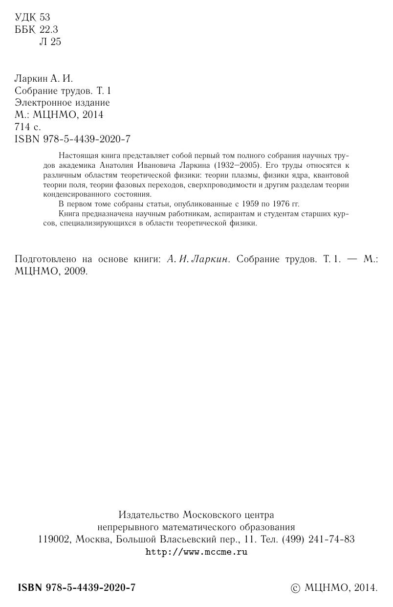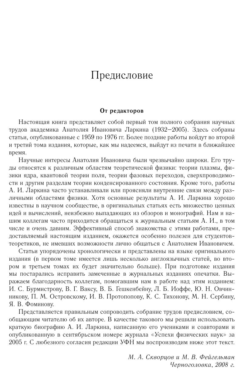 Настоящая книга представляет собой первый том полного собрания научных трудов академика Анатолия Ивановича Ларкина (1932–2005). Его труды относятся к различным областям теоретической физики: теории плазмы, физики ядра, квантовой теории поля, теории фазовых переходов, сверхпроводимости и другим разделам теории конденсированного состояния. В первом томе собраны статьи, опубликованные с 1959 по 1976 гг. Книга предназначена научным работникам, аспирантам и студентам старших курсов, специализирующихся в области теоретической физики.