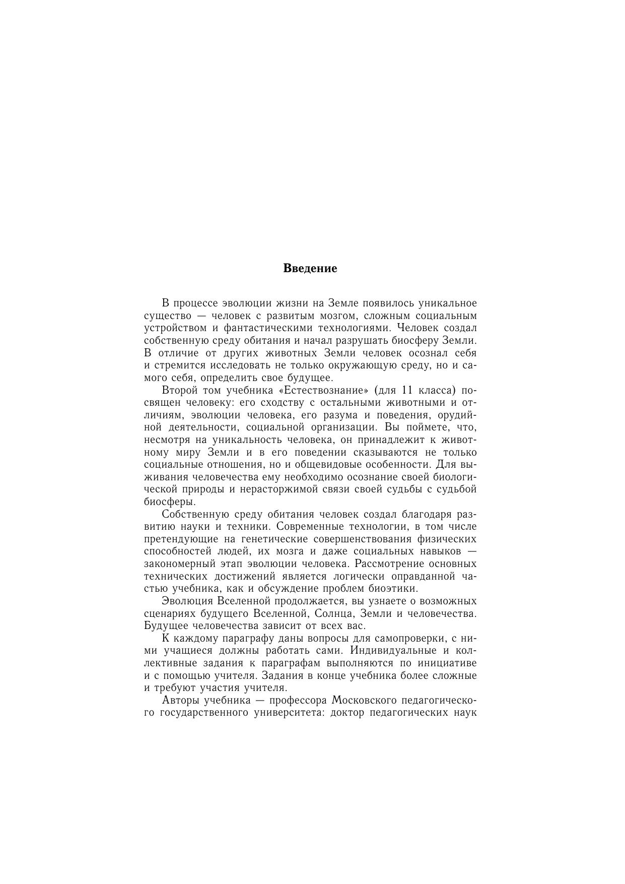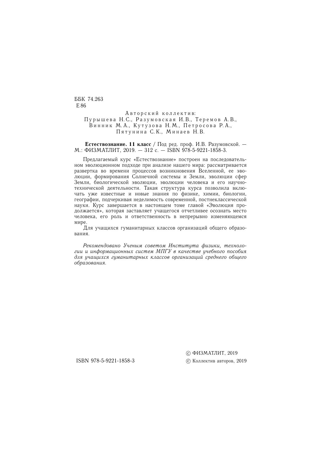 Предлагаемый курс «Естествознание» построен на последовательном эволюционном подходе при анализе нашего мира: рассматривается развертка во времени процессов возникновения Вселенной, ее эволюции, формирования Солнечной системы и Земли, эволюции сфер Земли, биологической эволюции, эволюции человека и его научно-технической деятельности. Такая структура курса позволила включать уже известные и новые знания по физике, химии, биологии, географии, подчеркивая неделимость современной, постнеклассической науки. Курс завершается в настоящем томе главой «Эволюция продолжается», которая заставляет учащегося отчетливее осознать место человека, его роль и ответственность в непрерывно изменяющемся мире. Для учащихся гуманитарных классов организаций общего образования.