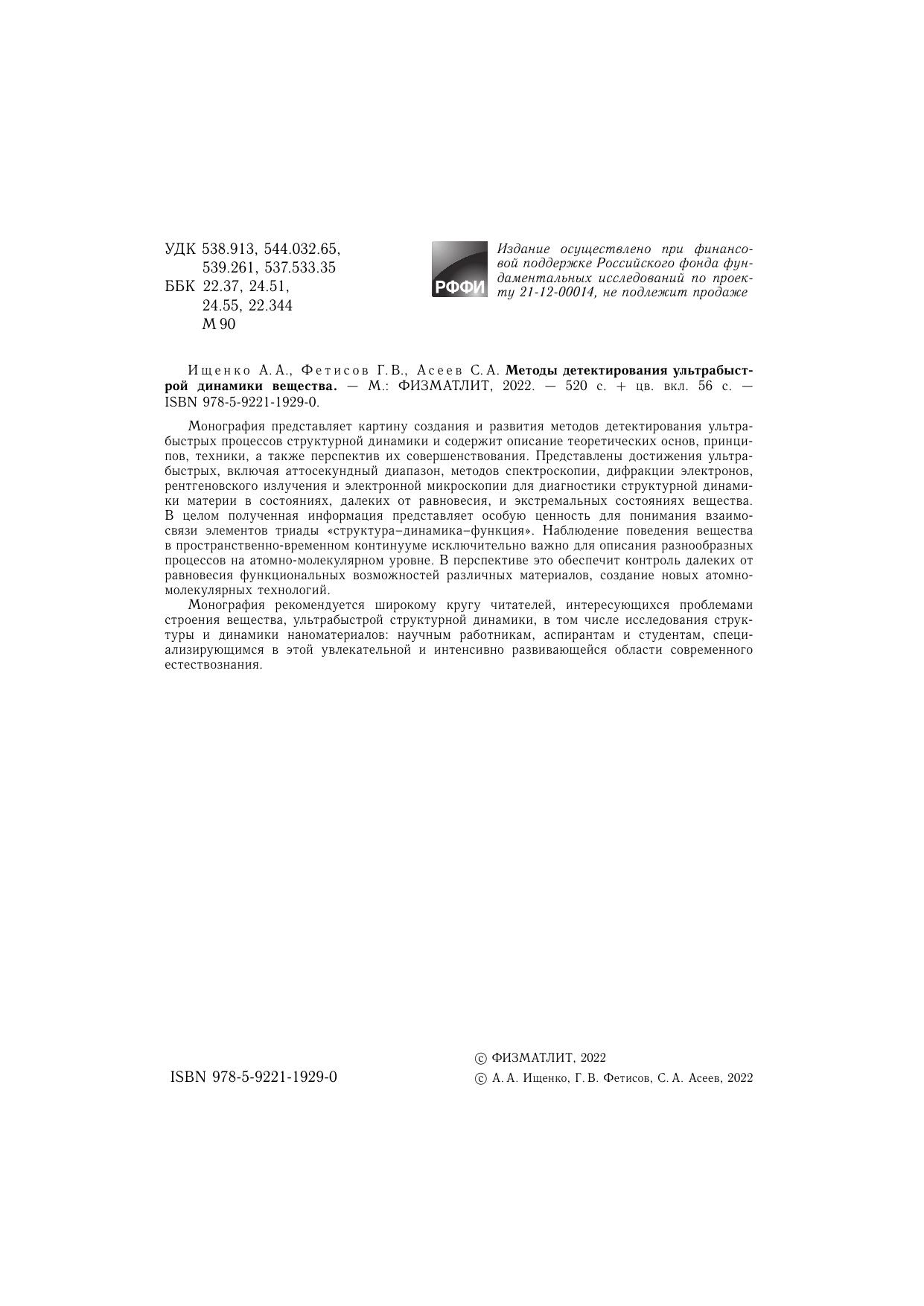 Монография представляет картину создания и развития методов детектирования ультрабыстрых процессов структурной динамики и содержит описание теоретических основ, принципов, техники, а также перспектив их совершенствования. Представлены достижения ультрабыстрых, включая аттосекундный диапазон, методов спектроскопии, дифракции электронов, рентгеновского излучения и электронной микроскопии для диагностики структурной динамики материи в состояниях, далеких от равновесия, и экстремальных состояниях вещества.