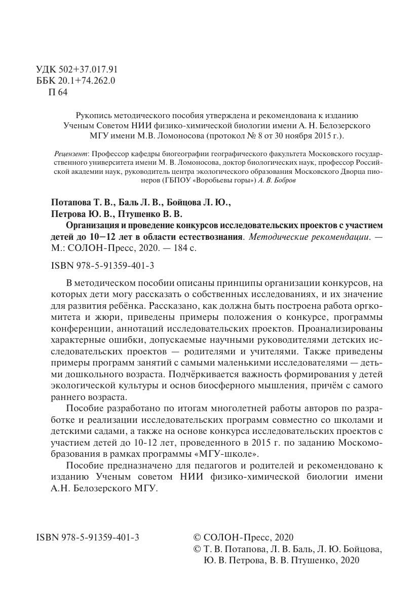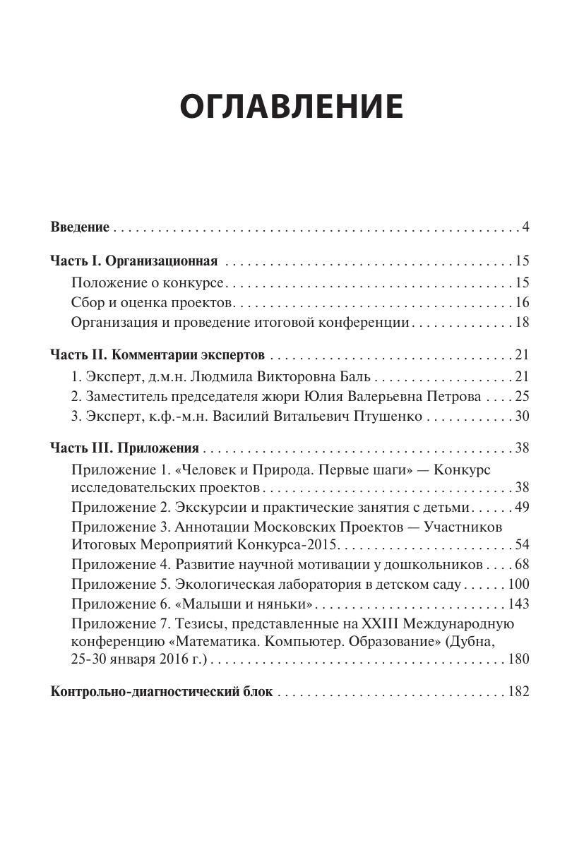 В методическом пособии описаны принципы организации конкурсов, на которых дети могу рассказать о собственных исследованиях, и их значение для развития ребёнка. Рассказано, как должна быть построена работа оргкомитета и жюри, приведены примеры положения о конкурсе, программы конференции, аннотаций исследовательских проектов. Проанализированы характерные ошибки, допускаемые научными руководителями детских исследовательских проектов — родителями и учителями. Также приведены примеры программ занятий с самыми маленькими исследователями — детьми дошкольного возраста. Подчёркивается важность формирования у детей экологической культуры и основ биосферного мышления, причём с самого раннего возраста.
