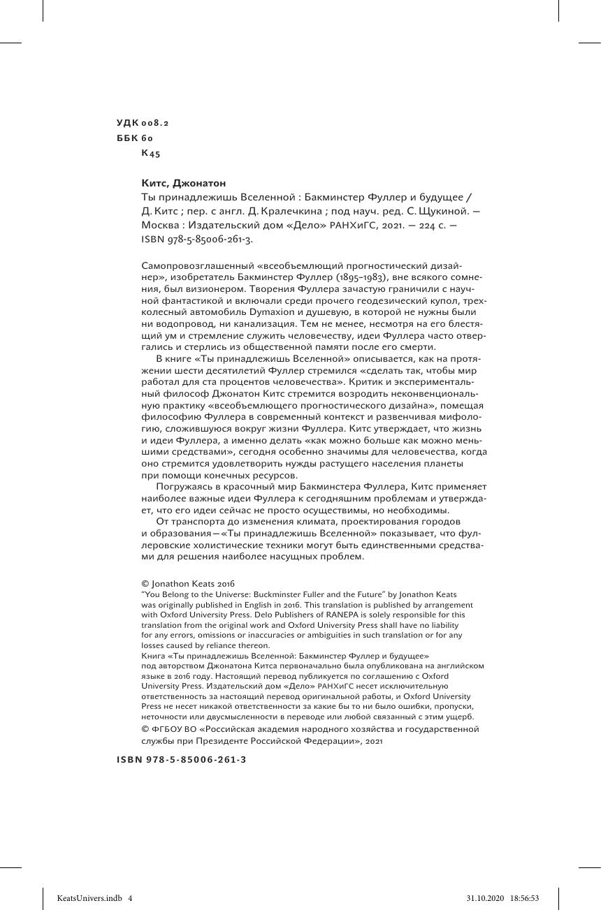 В книге «Ты принадлежишь Вселенной» описывается, как на протяжении шести десятилетий Фуллер стремился «сделать так, чтобы мир работал для ста процентов человечества». Критик и экспериментальный философ Джонатон Китс стремится возродить неконвенциональную практику «всеобъемлющего прогностического дизайна», помещая философию Фуллера в современный контекст и развенчивая мифологию, сложившуюся вокруг жизни Фуллера. Китс утверждает, что жизнь и идеи Фуллера, а именно делать «как можно больше как можно меньшими средствами», сегодня особенно значимы для человечества, когда оно стремится удовлетворить нужды растущего населения планеты при помощи конечных ресурсов.