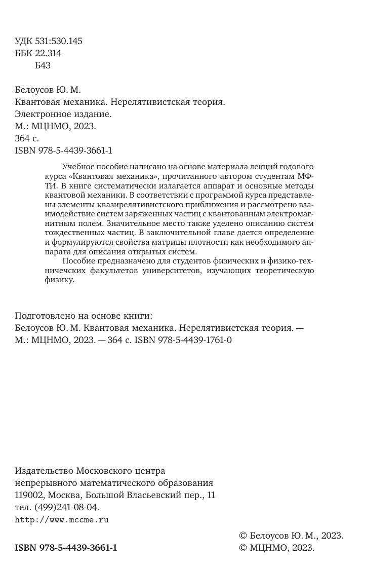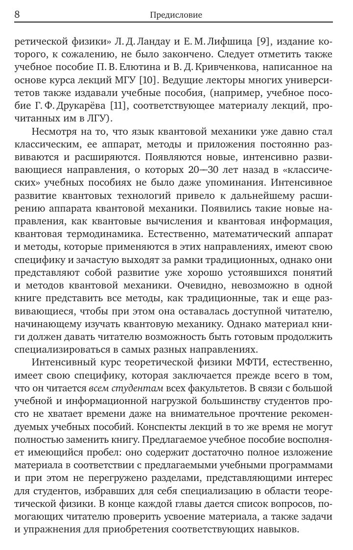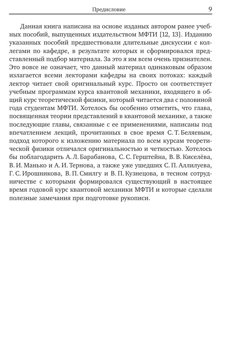 Учебное пособие написано на основе материала лекций годового курса «Квантовая механика», прочитанного автором студентам МФТИ. В книге систематически излагается аппарат и основные методы квантовой механики. В соответствии с программой курса представлены элементы квазирелятивистского приближения и рассмотрено взаимодействие систем заряженных частиц с квантованным электромагнитным полем. Значительное место также уделено описанию систем тождественных частиц. В заключительной главе дается определение и формулируются свойства матрицы плотности как необходимого аппарата для описания открытых систем. Пособие предназначено для студентов физических и физико-техничечских факультетов университетов, изучающих теоретическую физику.