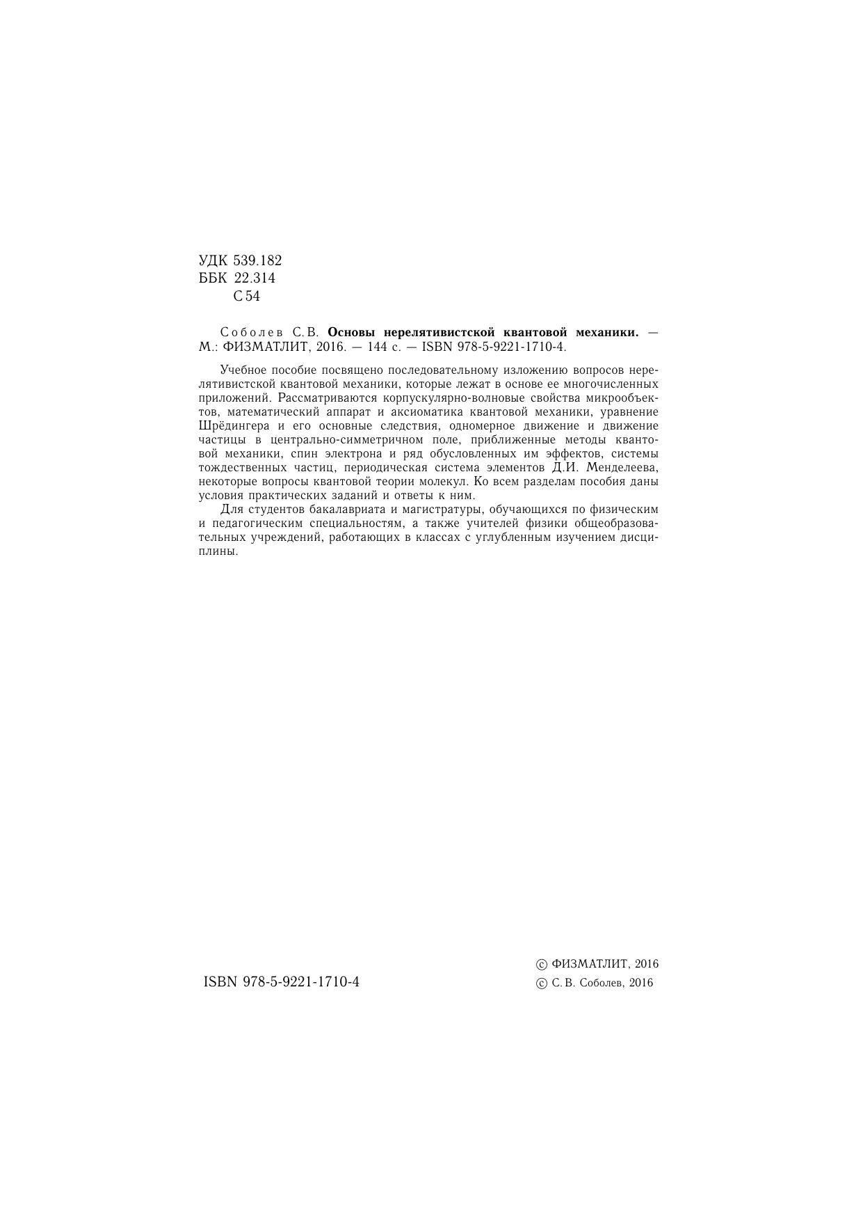 Учебное пособие посвящено последовательному изложению вопросов нерелятивистской квантовой механики, которые лежат в основе ее многочисленных приложений. Рассматриваются корпускулярно-волновые свойства микрообъектов, математический аппарат и аксиоматика квантовой механики, уравнение Шрёдингера и его основные следствия, одномерное движение и движение частицы в центрально-симметричном поле, приближенные методы квантовой механики, спин электрона и ряд обусловленных им эффектов, системы тождественных частиц, периодическая система элементов Д.И. Менделеева, некоторые вопросы квантовой теории молекул. Ко всем разделам пособия даны условия практических заданий и ответы к ним. Для студентов бакалавриата и магистратуры, обучающихся по физическим и педагогическим специальностям, а также учителей физики общеобразовательных учреждений, работающих в классах с углубленным изучением дисциплины.