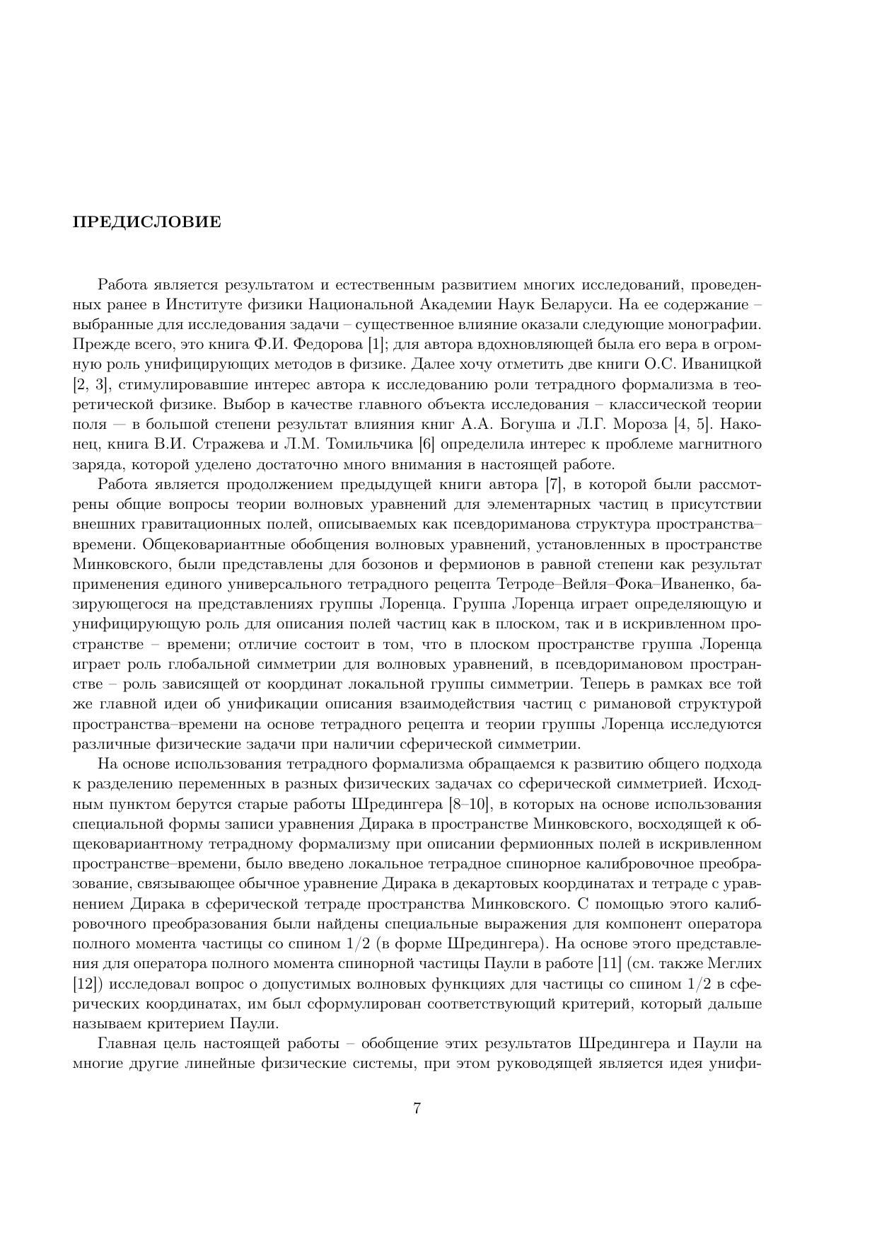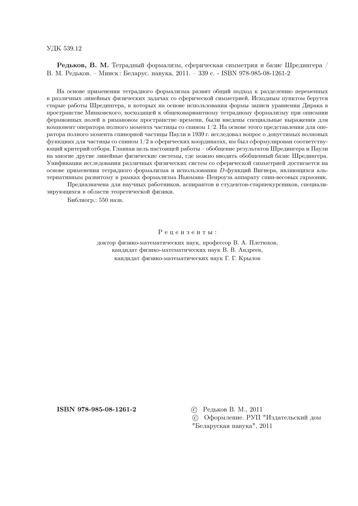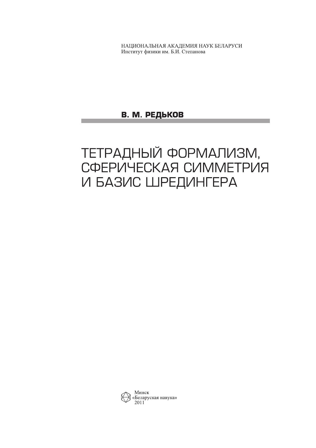 На основе применения тетрадного формализма развит общий подход к разделению переменных в различных линейных физических задачах со сферической симметрией. Исходным пунктом берутся старые работы Шредингера, в которых на основе использования формы записи уравнения Дирака в пространстве Минковского, восходящей к общековариантному тетрадному формализму при описании фермионных полей в римановом пространстве–времени, были введены специальные выражения для компонент оператора полного момента частицы со спином 1/2. На основе этого представления для оператора полного момента спинорной частицы Паули в 1939 г. исследовал вопрос о допустимых волновых функциях для частицы со спином 1/2 в сферических координатах, им был сформулирован соответствующий критерий отбора. Главная цель настоящей работы – обобщение результатов Шредингера и Паули на многие другие линейные физические системы, где можно вводить обобщенный базис Шредингера. Унификация исследования различных физических систем со сферической симметрией достигается на основе применения тетрадного формализма и использования D-функций Вигнера, являющихся альтернативным развитому в рамках формализма Ньюмана–Пенроуза аппарату спин-весовых гармоник. Предназначена для научных работников, аспирантов и студентов-старшекурсников, специализирующихся в области теоретической физики.