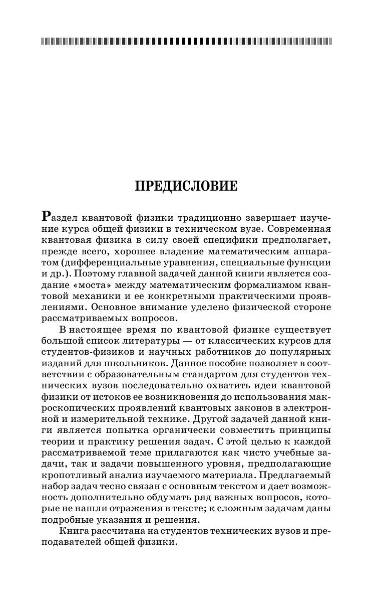 В пособии рассмотрены основные проблемы классической физики, решение которых привело к созданию современной квантовой физики. Изложены основные принципы и аппарат квантовой механики, физики твердого тела, рассмотрены макроскопические проявления квантовых законов проводимости твердых тел и их применение в электронной и измерительной технике. К каждой рассматриваемой теме прилагаются как чисто учебные задачи, так и задачи повышенного уровня сложности. Задачи тесно связаны с основным текстом и часто являются его развитием и дополнением. Предназначено для студентов технических специальностей технических вузов, а также для преподавателей общей физики.