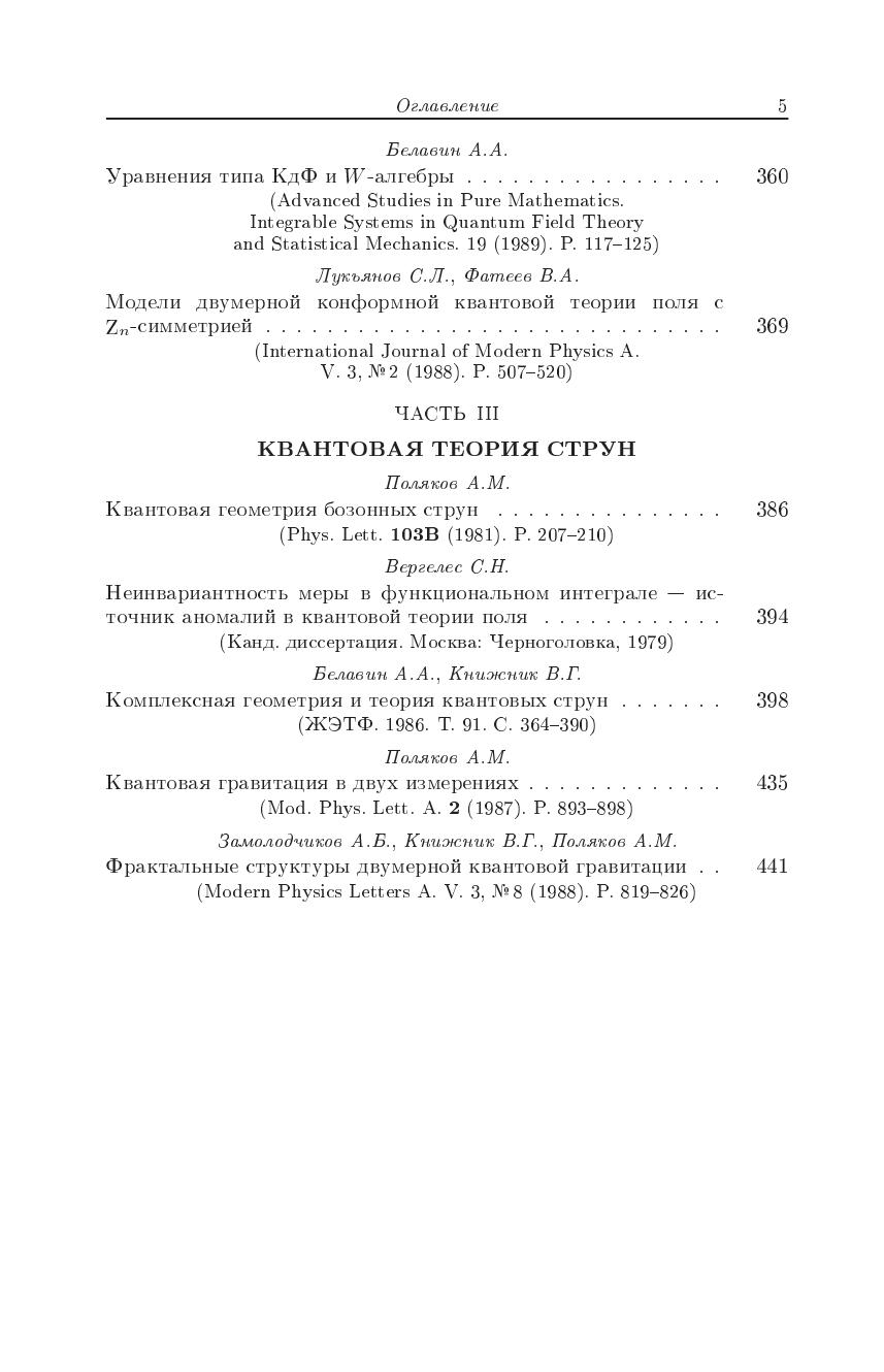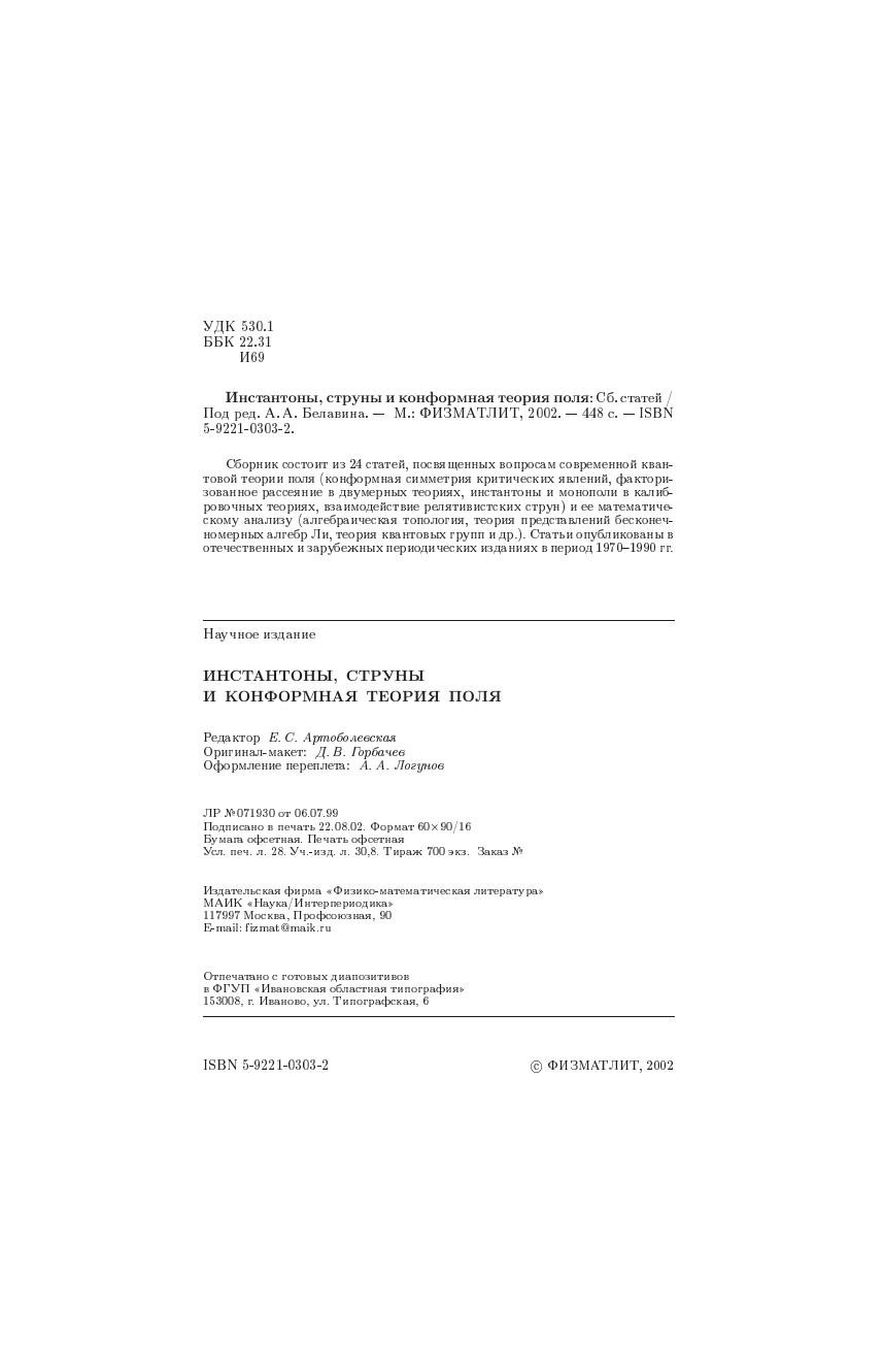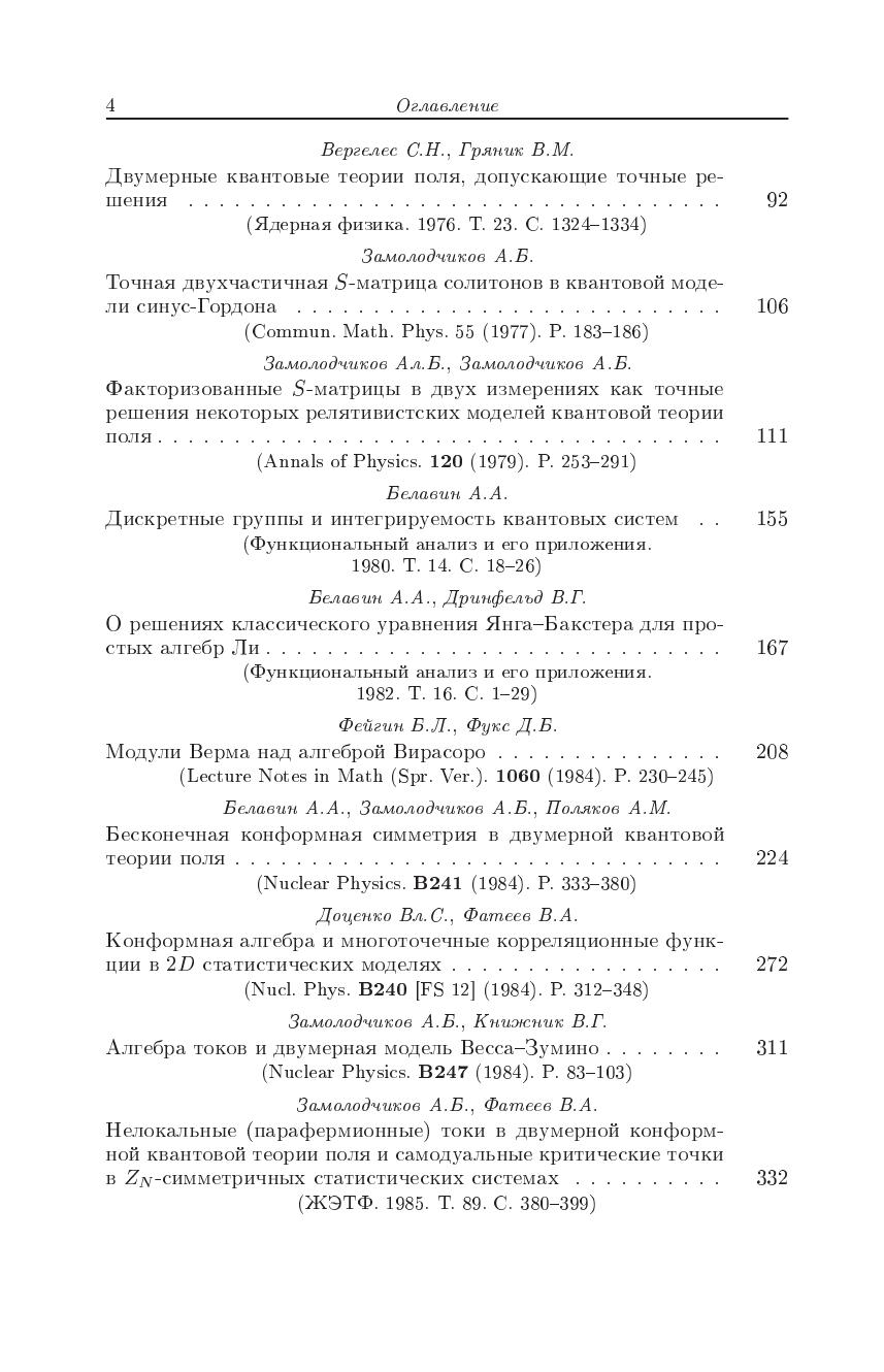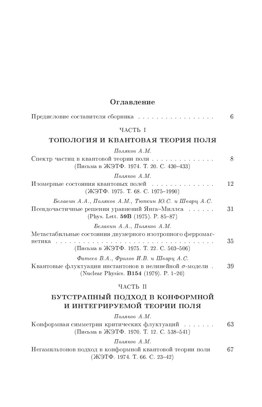 Сборник состоит из 24 статей, посвященных вопросам современной квантовой теории поля (конформная симметрия критических явлений, факторизованное рассеяние в двумерных теориях, инстантоны и монополи в калибровочных теориях, взаимодействие релятивистских струн) и ее математическому анализу (алгебраическая топология, теория представлений бесконечномерных алгебр Ли, теория квантовых групп и др.). статьи опубликованы в отечественных и зарубежных переодических изданиях в период 1970-1990 гг.