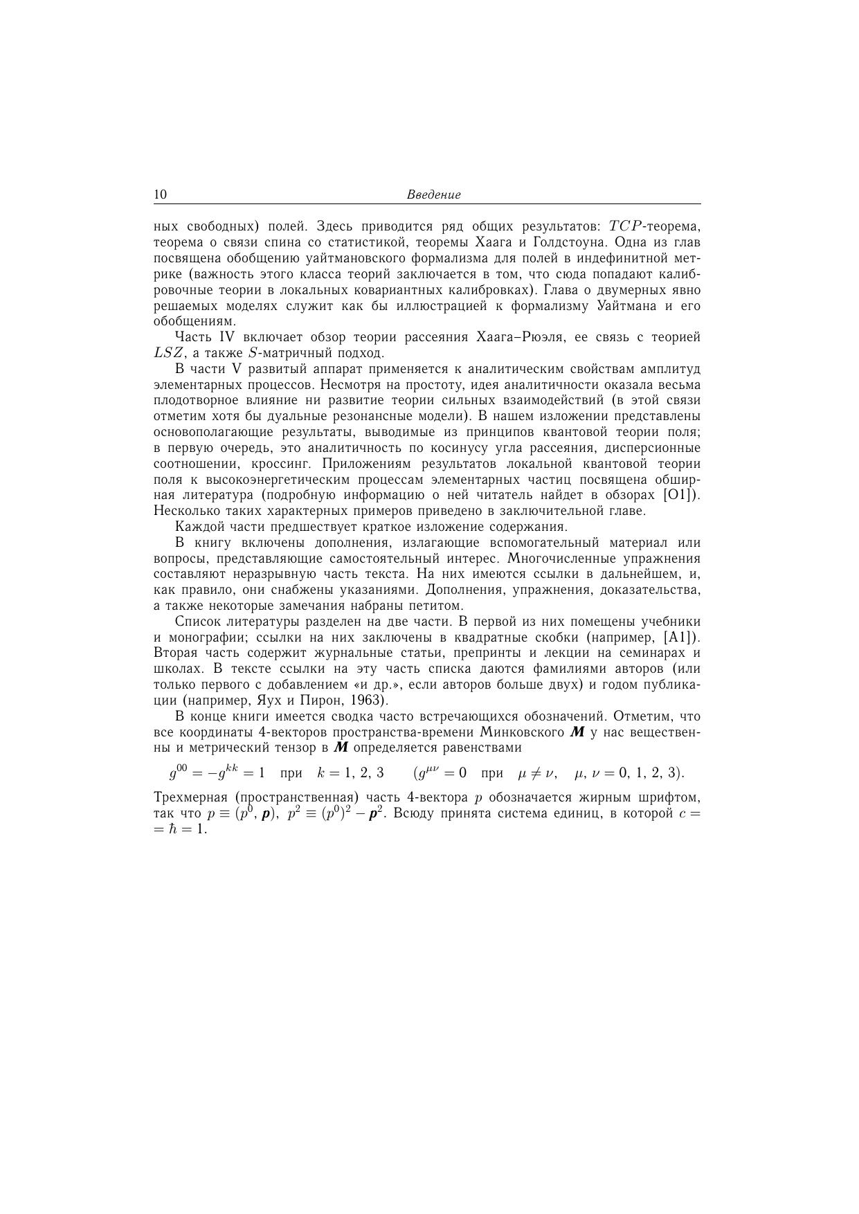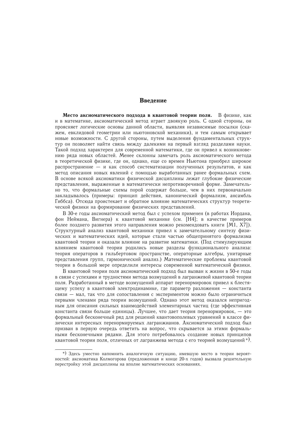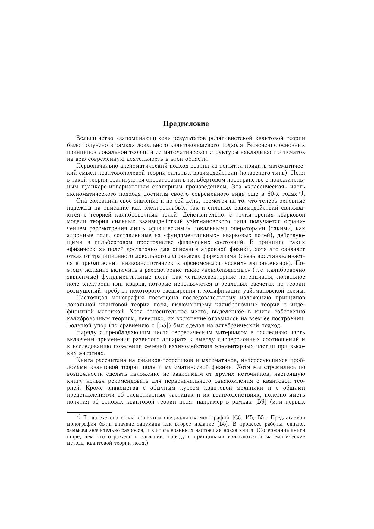 Посвящена систематическому изложению результатов аксиоматического направления в квантовой теории поля. Часть I содержит необходимые сведения из функционального анализа и теории обобщенных функций, а также элементы теории функций нескольких комплексных переменных. Центральное место (части II-IV) занимают различные подходы в аксиоматической квантовой теории поля - алгебраический подход, формализмы Уайтмана и Лемана-Симанзика-Циммермана, $S$-матричный метод. Здесь изложены фундаментальные результаты квантовой теории поля - $TCP$-теорема, связь спина со статистикой, теорема Хаага, теорема Голдстоуна и др. Включены разделы, посвященные теориям с индефинитной метрикой. Общая теория проиллюстрирована на явно решаемых двумерных моделях. Часть V содержит применения развитого аппарата к аналитическим свойствам амплитуд рассеяния и к теории взаимодействия элементарных частиц при высоких энергиях. Многочисленные упражнения составляют неразрывную часть текста. Для научных работников, аспирантов и студентов, специализирующихся по квантовой теории поля и математической физике.