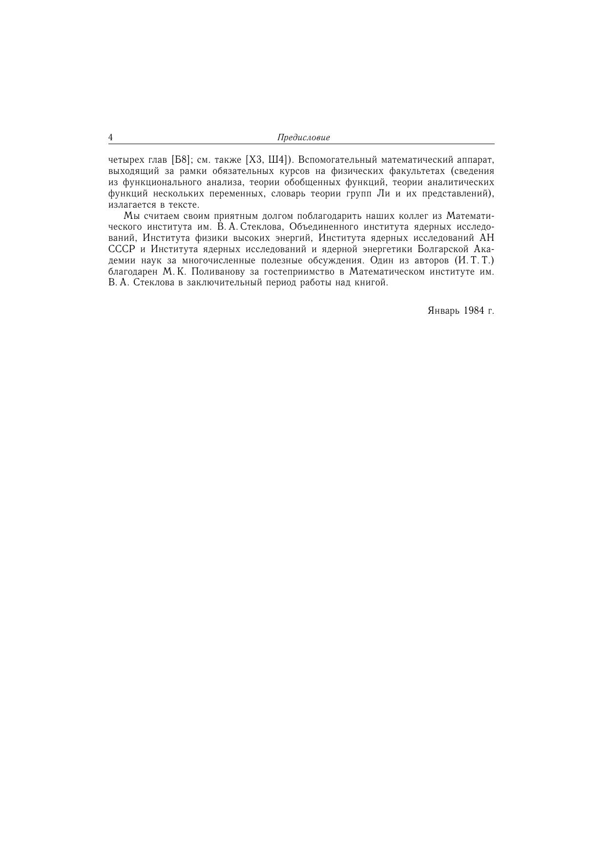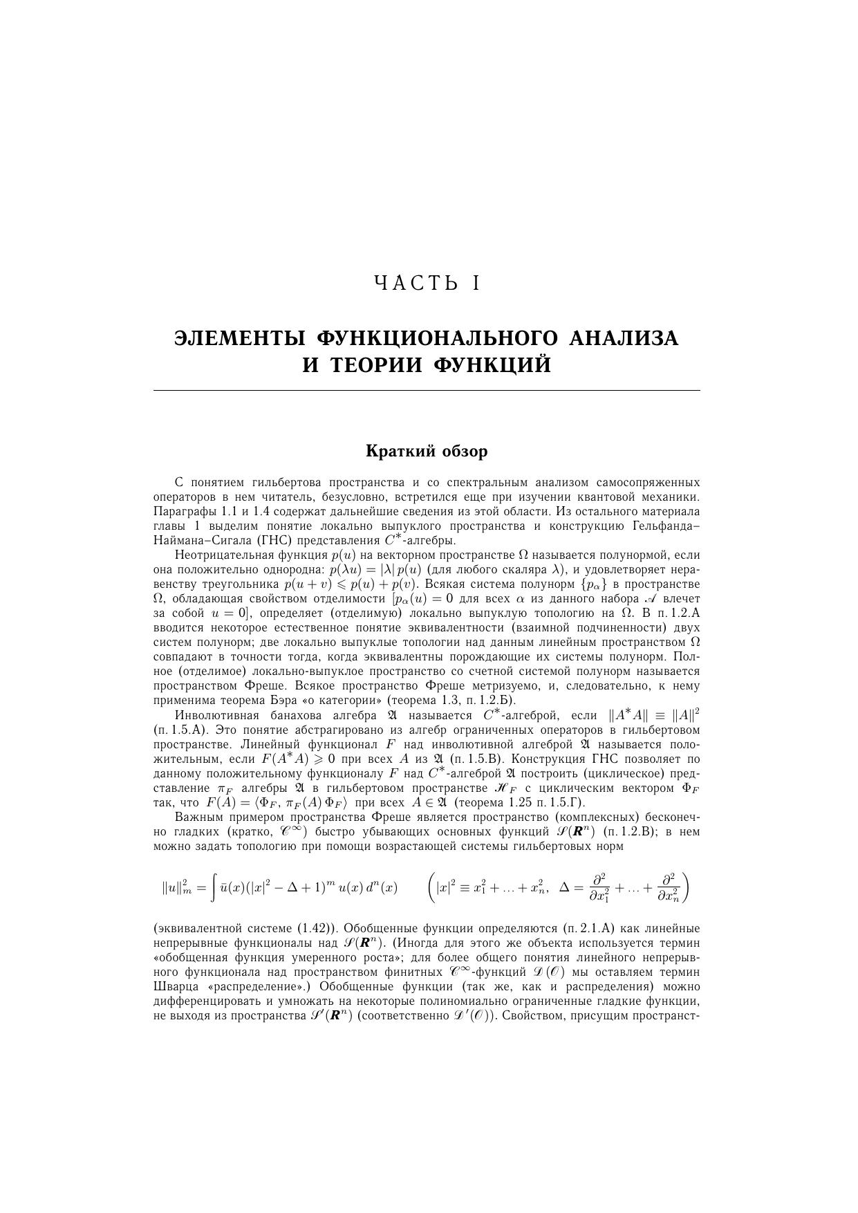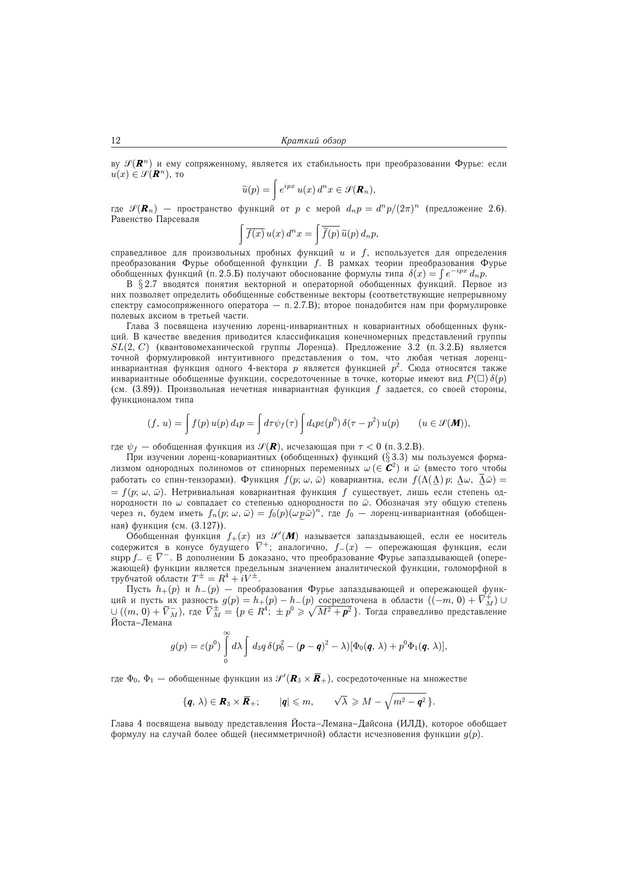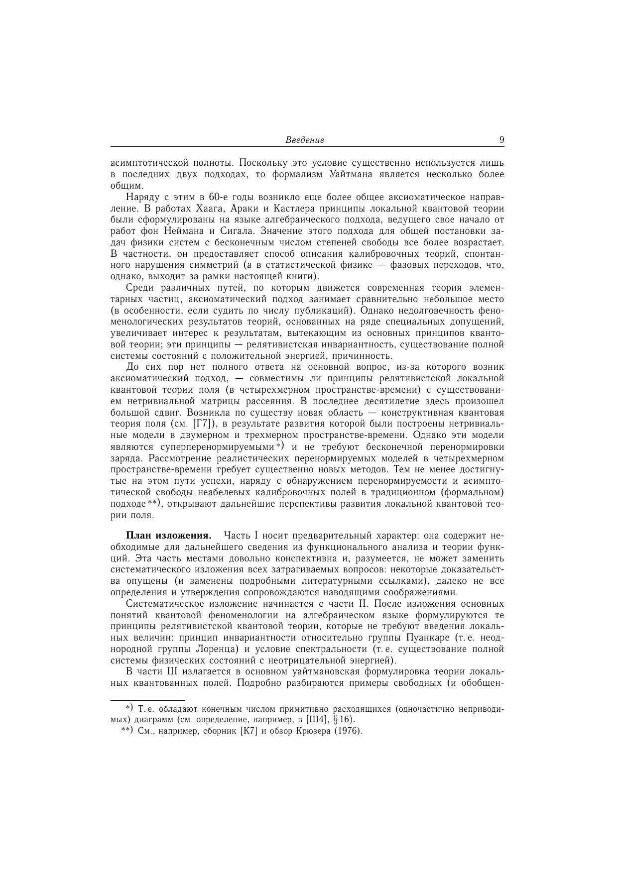 Посвящена систематическому изложению результатов аксиоматического направления в квантовой теории поля. Часть I содержит необходимые сведения из функционального анализа и теории обобщенных функций, а также элементы теории функций нескольких комплексных переменных. Центральное место (части II-IV) занимают различные подходы в аксиоматической квантовой теории поля - алгебраический подход, формализмы Уайтмана и Лемана-Симанзика-Циммермана, $S$-матричный метод. Здесь изложены фундаментальные результаты квантовой теории поля - $TCP$-теорема, связь спина со статистикой, теорема Хаага, теорема Голдстоуна и др. Включены разделы, посвященные теориям с индефинитной метрикой. Общая теория проиллюстрирована на явно решаемых двумерных моделях. Часть V содержит применения развитого аппарата к аналитическим свойствам амплитуд рассеяния и к теории взаимодействия элементарных частиц при высоких энергиях. Многочисленные упражнения составляют неразрывную часть текста. Для научных работников, аспирантов и студентов, специализирующихся по квантовой теории поля и математической физике.