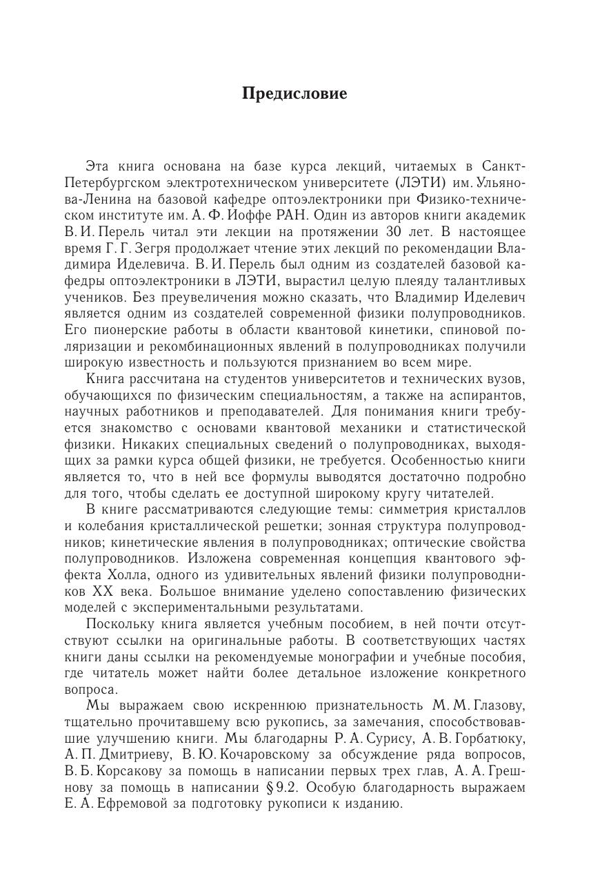 В данном учебном пособии рассмотрены следующие темы: симметрия кристаллов и колебания кристаллической решетки зонная структура полупроводников кинетические явления в полупроводниках оптические свойства полупроводников. Изложена современная концепция квантового эффекта Холла, одного из удивительных явлений физики полупроводников XX века. Большое внимание уделено сопоставлению физических моделей с экспериментальными результатами.Для студентов университетов и технических вузов, аспирантов, преподавателей и научных работников, знакомых с квантовой механикой и статистической физикой.