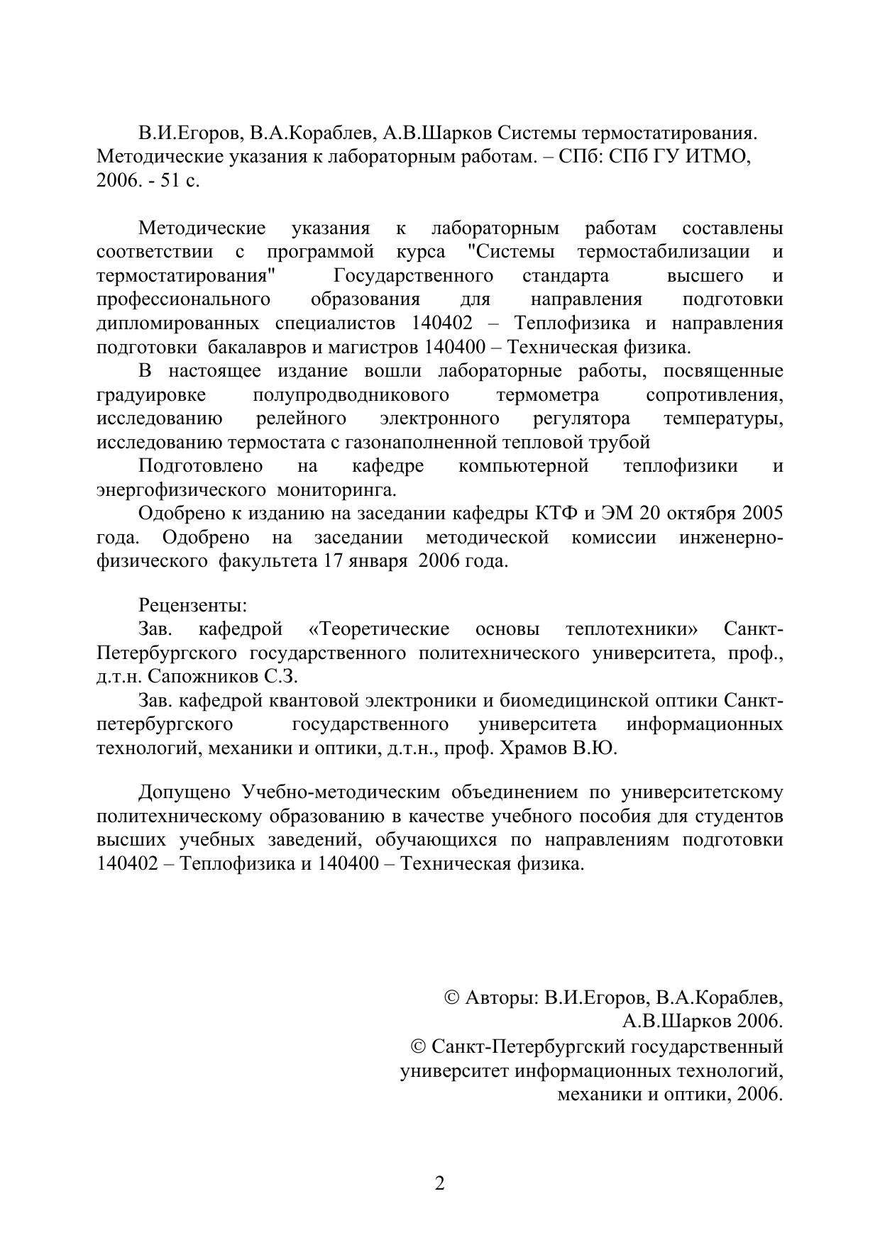 Методические указания к лабораторным работам составлены соответствии с программой курса "Системы термостабилизации и термостатирования" Государственного стандарта высшего и профессионального образования для направления подготовки дипломированных специалистов 140402 – Теплофизика и направления подготовки бакалавров и магистров 140400 – Техническая физика. В настоящее издание вошли лабораторные работы, посвященные градуировке полупродводникового термометра сопротивления, исследованию релейного электронного регулятора температуры, исследованию термостата с газонаполненной тепловой трубой.