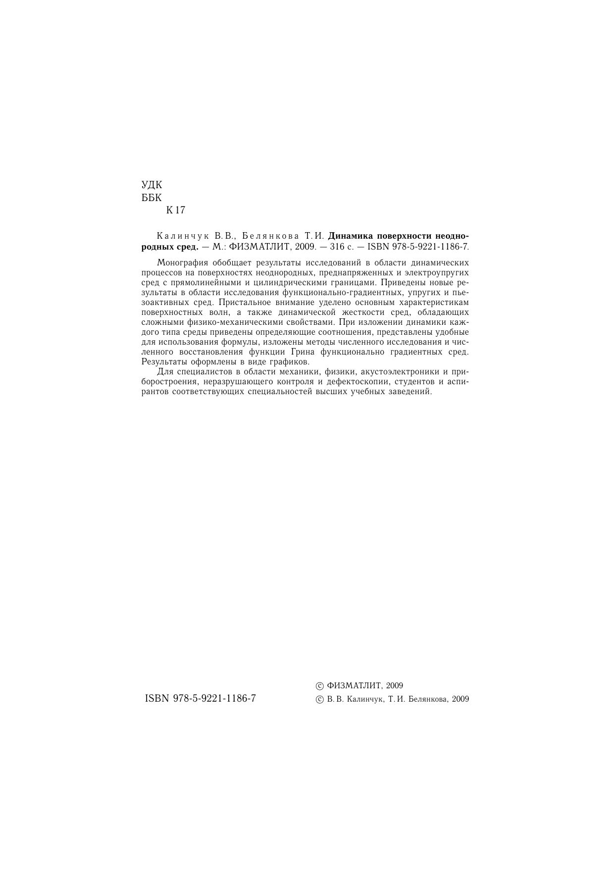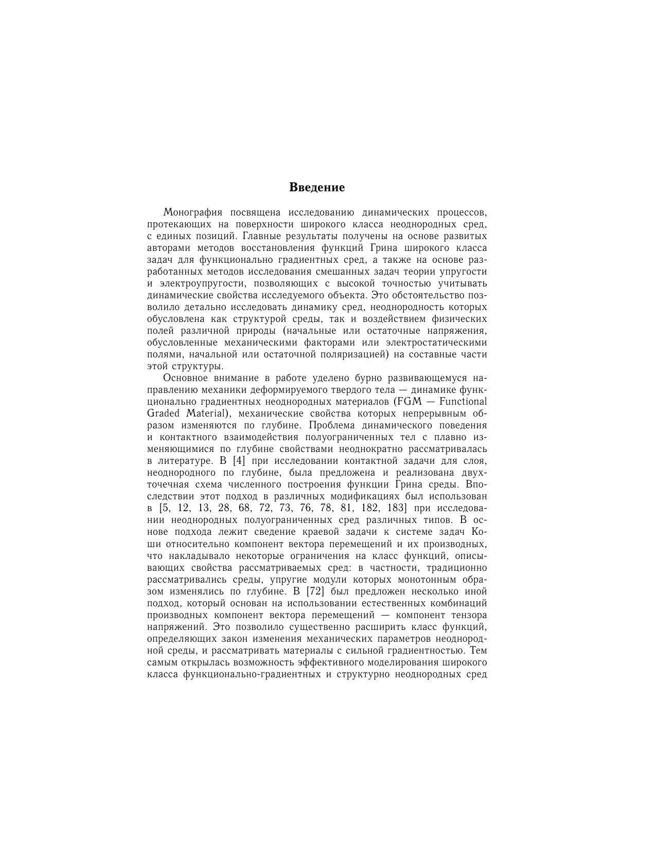 Монография обобщает результаты исследований в области динамических процессов на поверхностях неоднородных, преднапряженных и электроупругих сред с прямолинейными и цилиндрическими границами. Приведены новые результаты в области исследования функционально-градиентных, упругих и пьезоактивных сред. Пристальное внимание уделено основным характеристикам поверхностных волн, а также динамической жесткости сред, обладающих сложными физико-механическими свойствами. При изложении динамики каждого типа среды приведены определяющие соотношения, представлены удобные для использования формулы, изложены методы численного исследования и численного восстановления функции Грина функционально градиентных сред. Результаты оформлены в виде графиков. Для специалистов в области механики, физики, акустоэлектроники и приборостроения, неразрушающего контроля и дефектоскопии, студентов и аспирантов соответствующих специальностей высших учебных заведений.