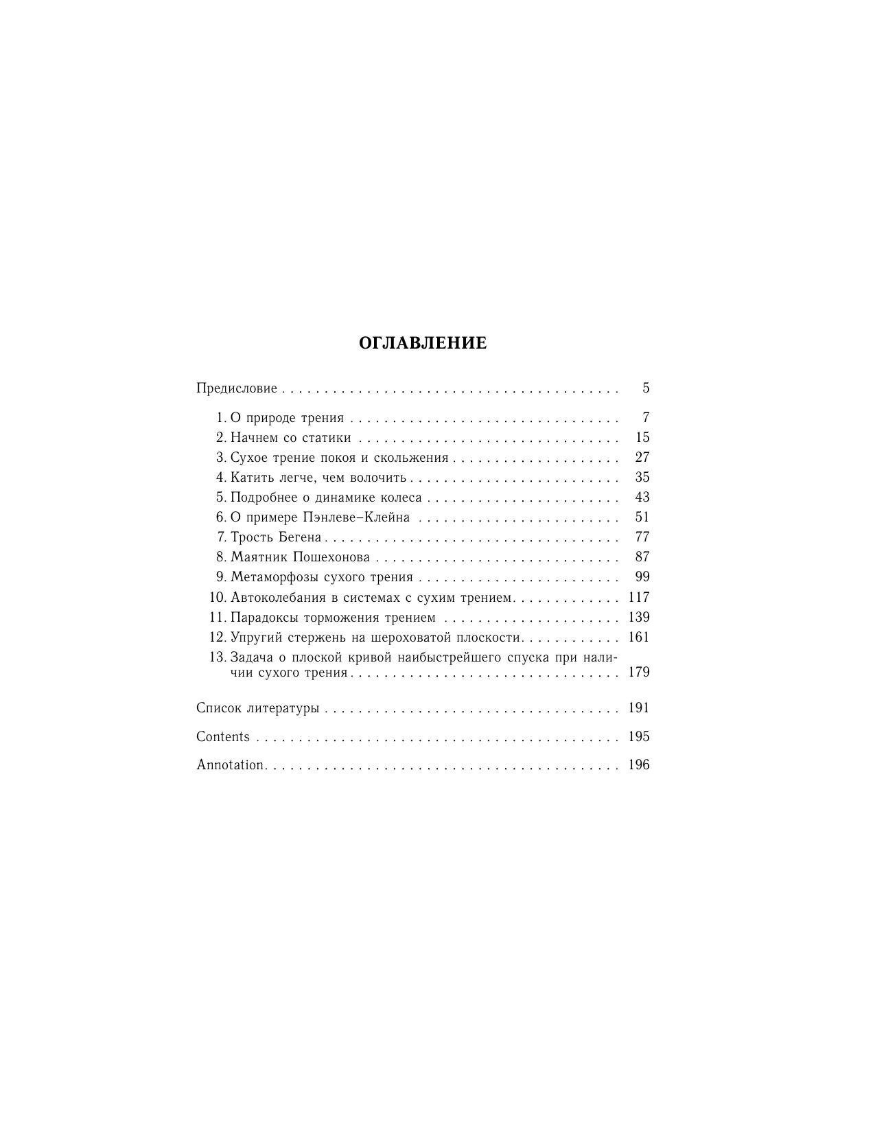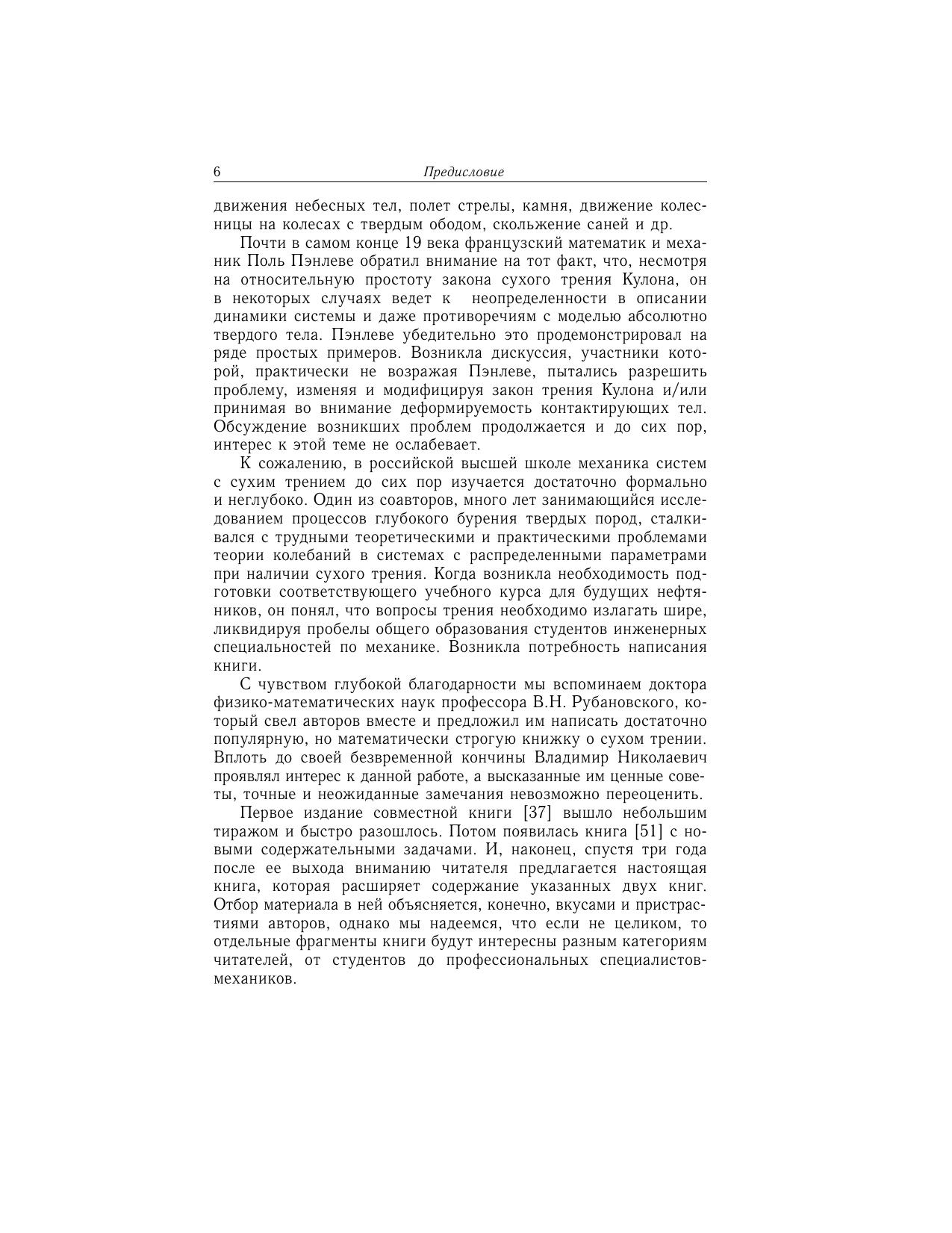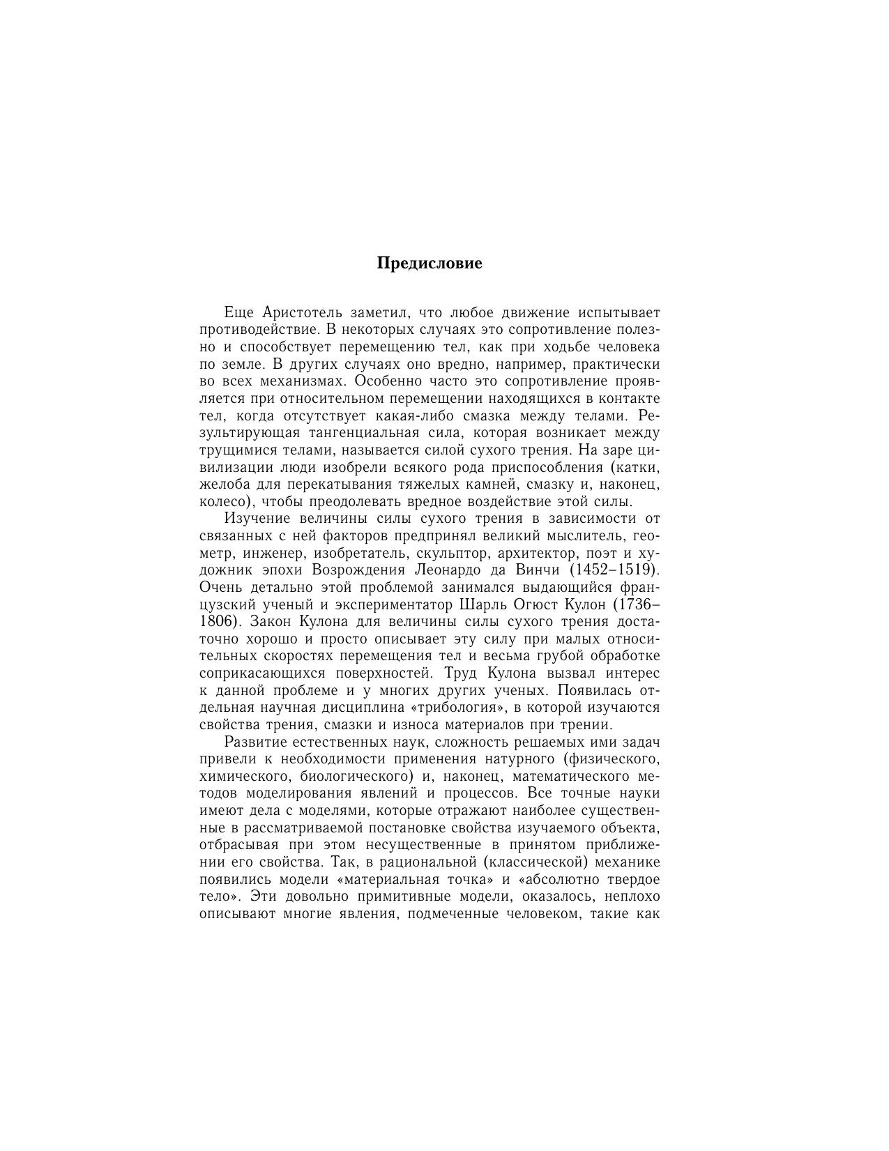 В монографии изложено несколько интересных примеров исследования механических систем с сухим трением — от задач статики до задачи о брахистохроне с сухим трением. Большое внимание уделено исследованиям по разрешению неоднозначности и противоречий, которые возникают иногда в системах абсолютно твердых тел с трением, описываемым законом Кулона. Надеемся, читателям будут интересны воззрения на эту проблему основоположника учения о сервосвязях А. Бегена и видного петербуржского механика П.А. Жилина. Разработан графический метод построения периодических решений в системах с фрикционными автоколебаниями. Изложен приближенный подход решения задачи о колебаниях упругого стержня на плоскости с трением (эта задача еще ждет своего решения).