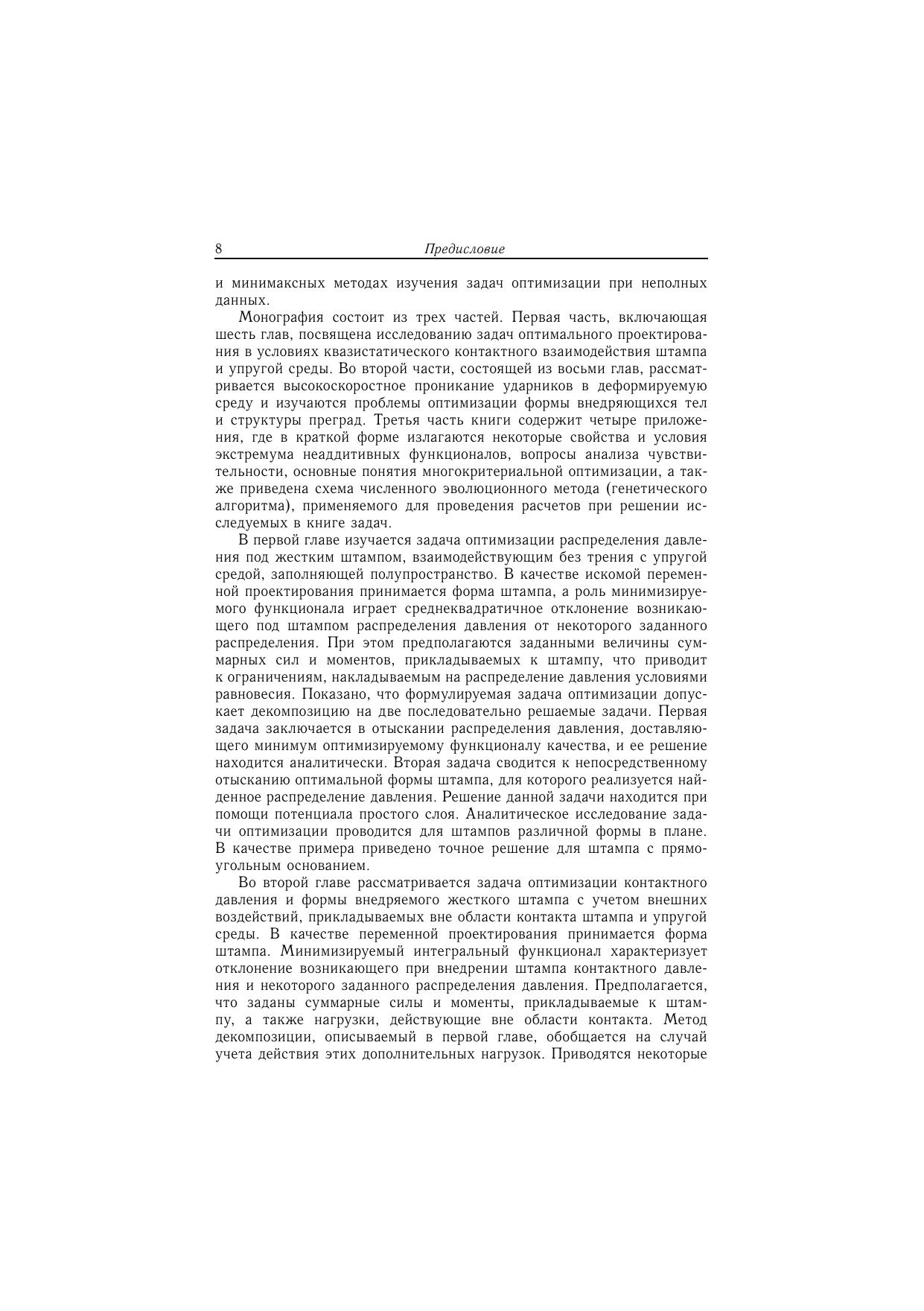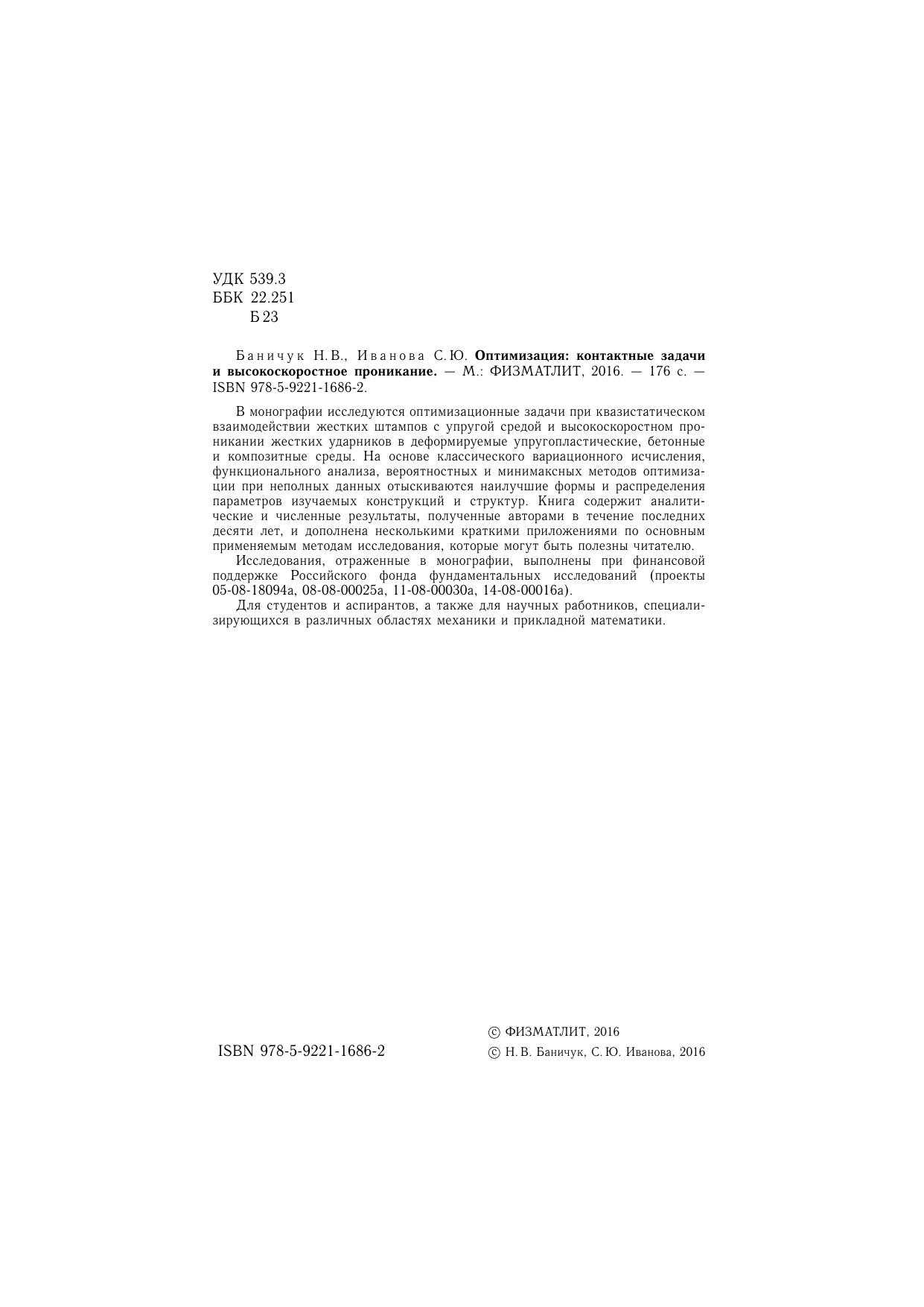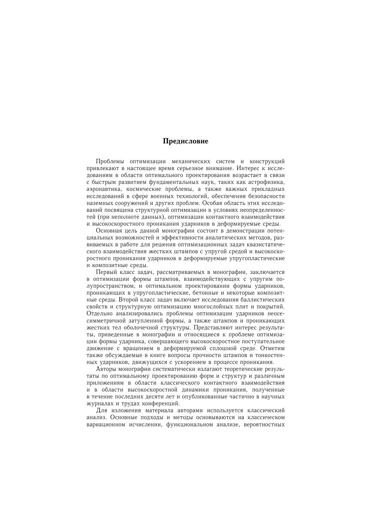 В монографии исследуются оптимизационные задачи при квазистатическом взаимодействии жестких штампов с упругой средой и высокоскоростном проникании жестких ударников в деформируемые упругопластические, бетонные и композитные среды. На основе классического вариационного исчисления, функционального анализа, вероятностных и минимаксных методов оптимизации при неполных данных отыскиваются наилучшие формы и распределения параметров изучаемых конструкций и структур. Книга содержит аналитические и численные результаты, полученные авторами в течение последних десяти лет, и дополнена несколькими краткими приложениями по основным применяемым методам исследования, которые могут быть полезны читателю.