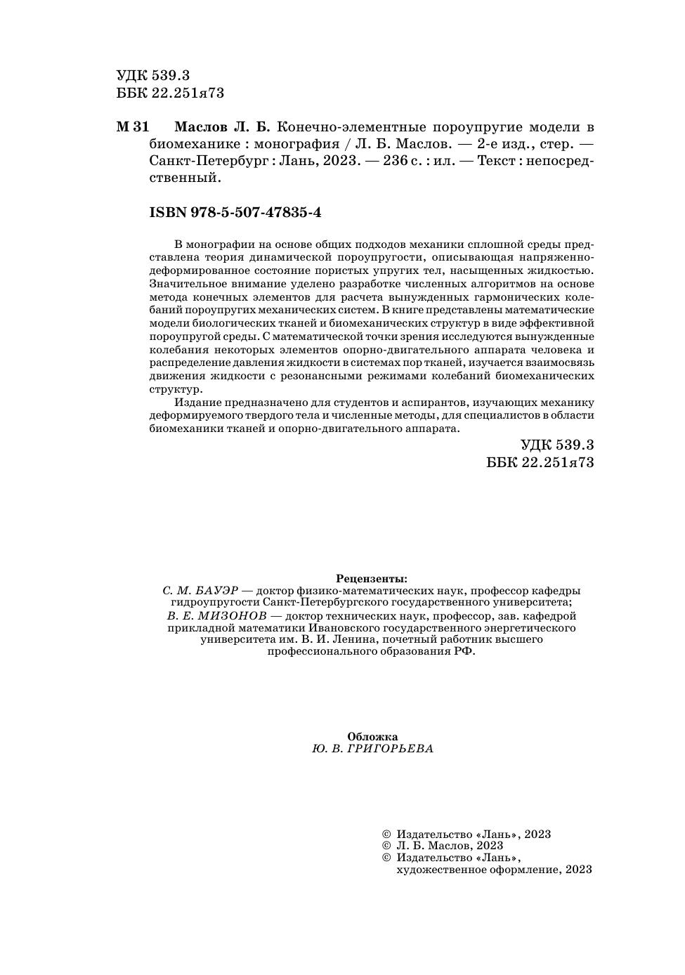 В монографии на основе общих подходов механики сплошной среды пред-ставлена теория динамической пороупругости, описывающая напряженно-деформированное состояние пористых упругих тел, насыщенных жидкостью. Значительное внимание уделено разработке численных алгоритмов на основе метода конечных элементов для расчета вынужденных гармонических коле-баний пороупругих механических систем. В книге представлены математические модели биологических тканей и биомеханических структур в виде эффективной пороупругой среды. С математической точки зрения исследуются вынужденные колебания некоторых элементов опорно-двигательного аппарата человека и распределение давления жидкости в системах пор тканей, изучается взаимосвязь движения жидкости с резонансными режимами колебаний биомеханических структур. Издание предназначено для студентов и аспирантов, изучающих механику деформируемого твердого тела и численные методы, для специалистов в области биомеханики тканей и опорно-двигательного аппарата.