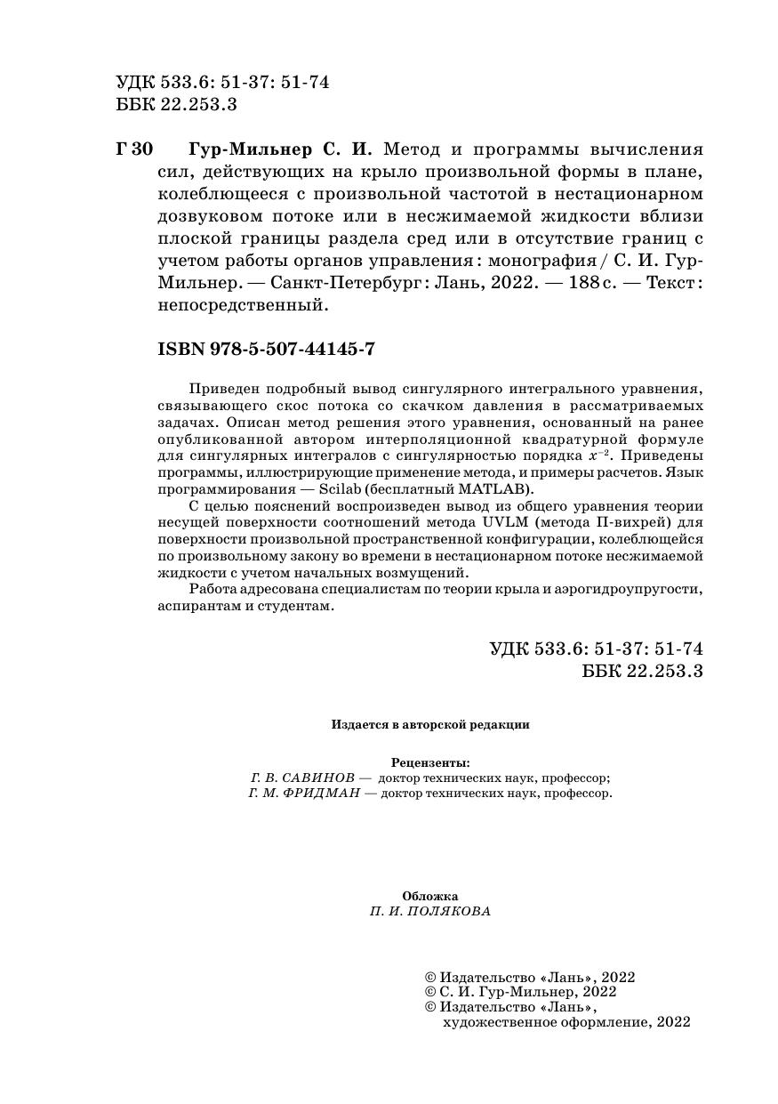 Приведен подробный вывод сингулярного интегрального уравнения, связывающего скос потока со скачком давления в рассматриваемых задачах. Описан метод решения этого уравнения, основанный на ранее опубликованной автором интерполяционной квадратурной формуле для сингулярных интегралов с сингулярностью порядка x−2. Приведены программы, иллюстрирующие применение метода, и примеры расчетов. Язык программирования – Scilab (бесплатный MATLAB). С целью пояснений воспроизведен вывод из общего уравнения теории несущей поверхности соотношений метода UVLM (метода П-вихрей) для поверхности произвольной пространственной конфигурации, колеблющейся по произвольному закону во времени в нестационарном потоке несжимаемой жидкости с учетом начальных возмущений. Работа адресована специалистам по теории крыла и аэрогидроупругости, аспирантам и студентам.