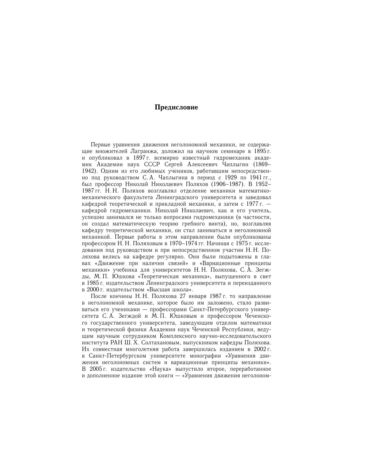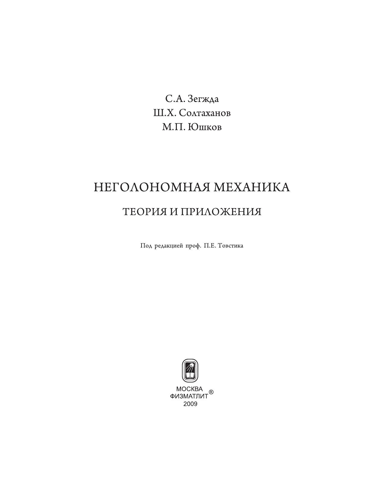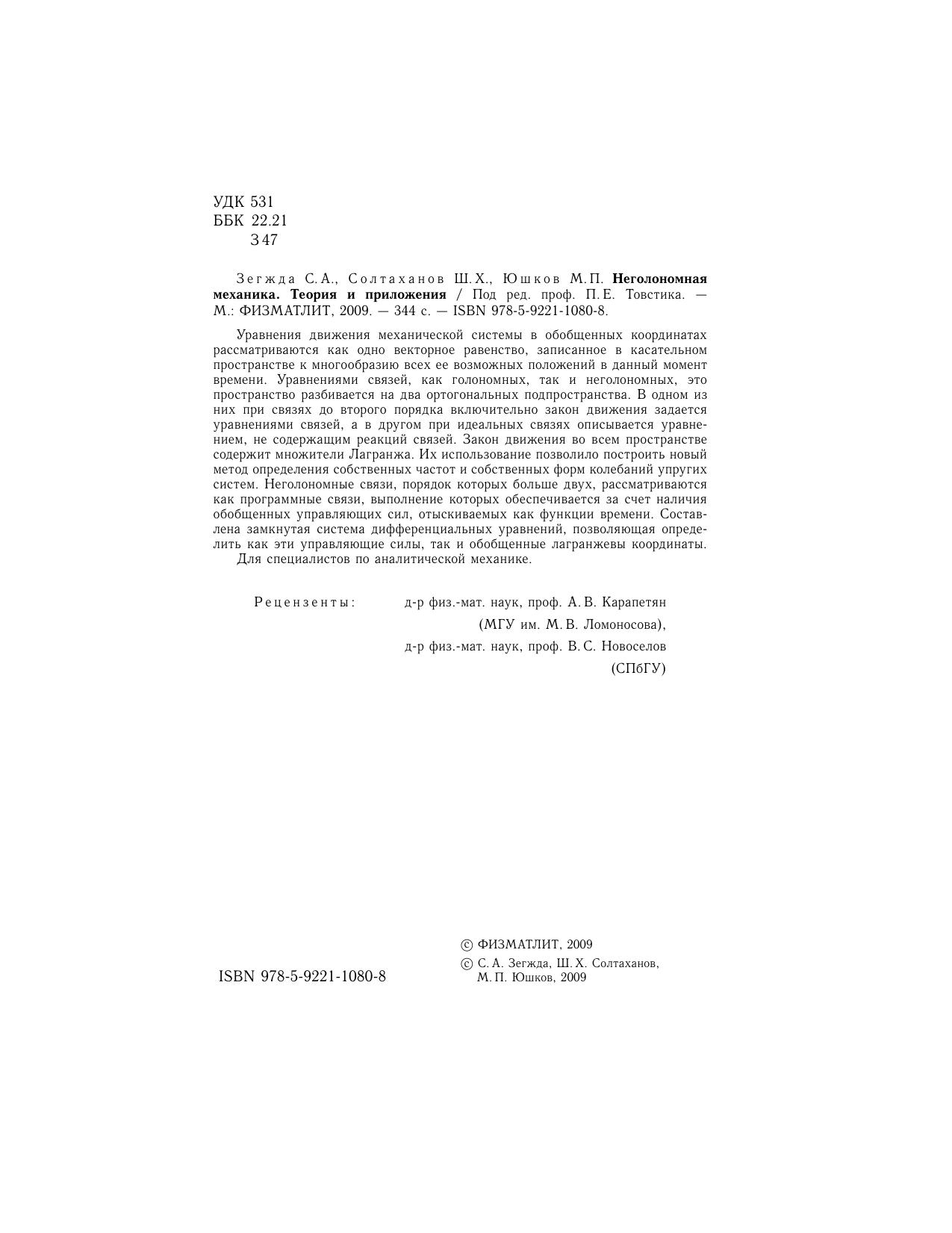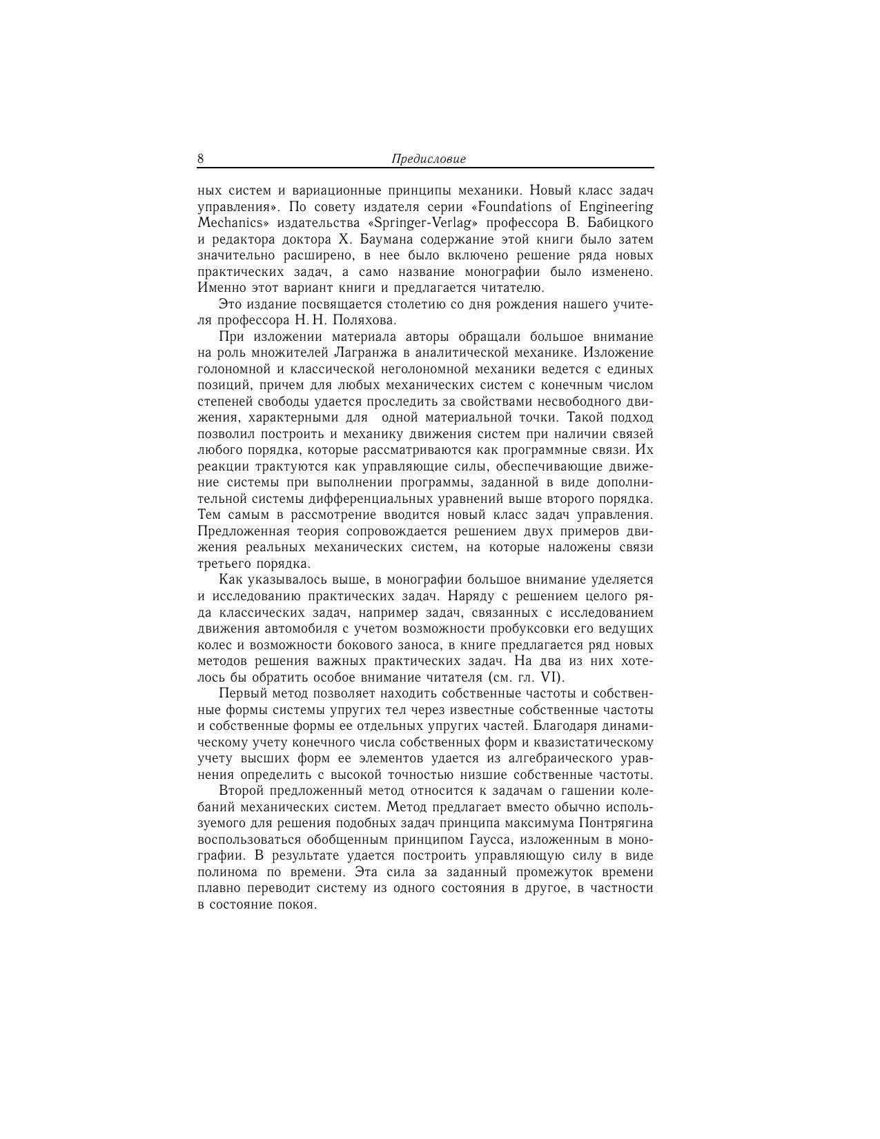 Уравнения движения механической системы в обобщенных координатах рассматриваются как одно векторное равенство, записанное в касательномпространстве к многообразию всех ее возможных положений в данный момент времени. Уравнениями связей, как голономных, так и неголономных, этопространство разбивается на два ортогональных подпространства. В одном из них при связях до второго порядка включительно закон движения задаетсяуравнениями связей, а в другом при идеальных связях описывается уравнением, не содержащим реакций связей. Закон движения во всем пространствесодержит множители Лагранжа. Их использование позволило построить новый метод определения собственных частот и собственных форм колебаний упругих систем. Неголономные связи, порядок которых больше двух, рассматриваются как программные связи, выполнение которых обеспечивается за счет наличия обобщенных управляющих сил, отыскиваемых как функции времени. Составлена замкнутая система дифференциальных уравнений, позволяющая определить как эти управляющие силы, так и обобщенные лагранжевы координаты. Для специалистов по аналитической механике.