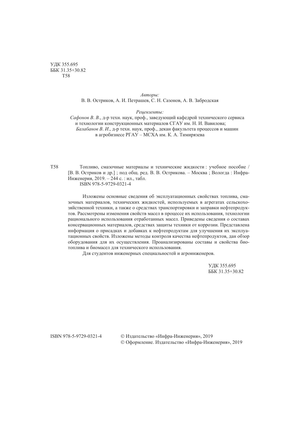 Изложены основные сведения об эксплуатационных свойствах топлива, смазочных материалов, технических жидкостей, используемых в агрегатах сельскохозяйственной техники, а также о средствах транспортировки и заправки нефтепродуктов. Рассмотрены изменения свойств масел в процессе их использования, технологии рационального использования отработанных масел. Приведены сведения о составах консервационных материалов, средствах защиты техники от коррозии. Представлена информация о присадках и добавках к нефтепродуктам для улучшения их эксплуатационных свойств. Изложены методы контроля качества нефтепродуктов, дан обзор оборудования для их осуществления. Проанализированы составы и свойства биотоплива и биомасел для технического использования.