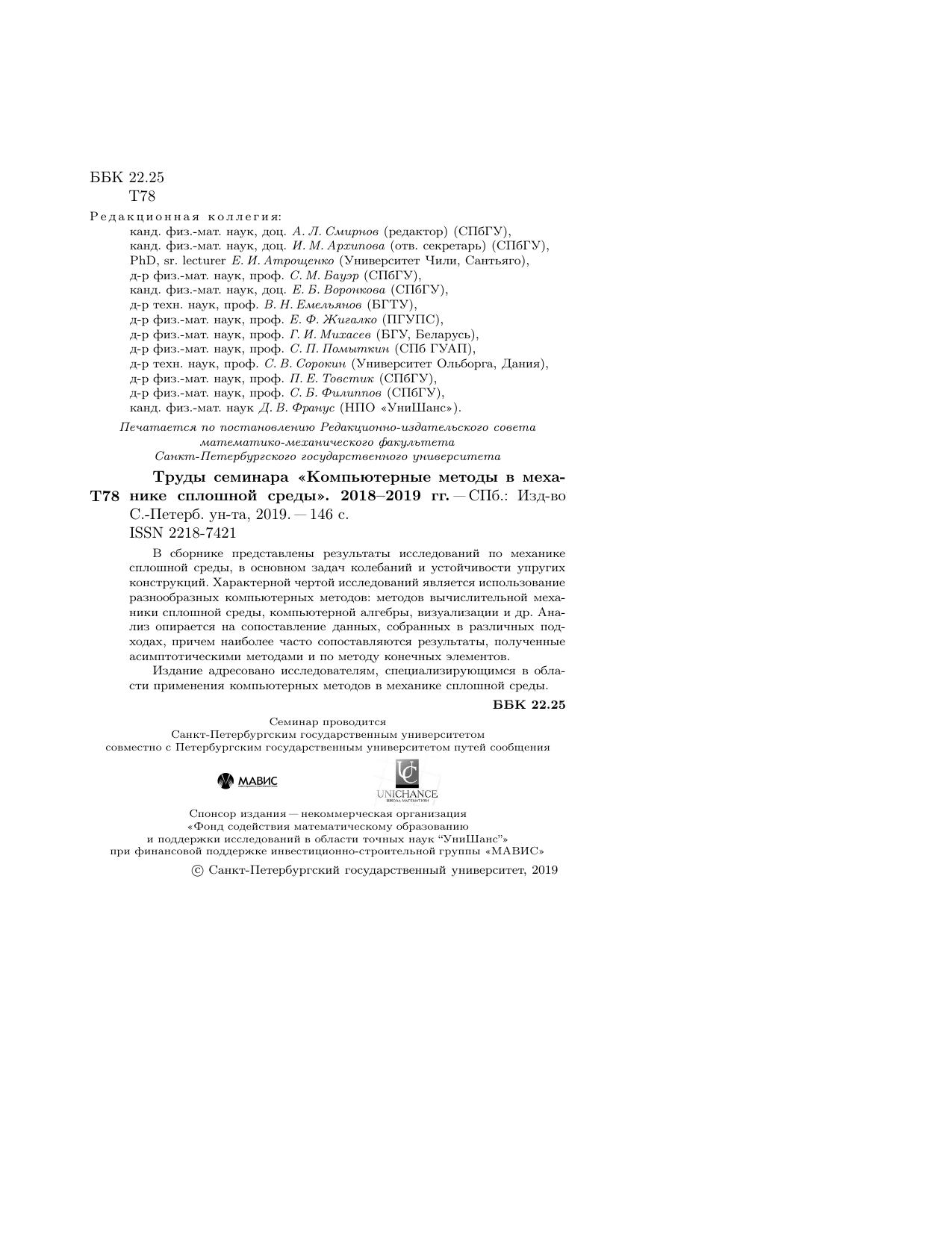 В сборнике представлены результаты исследований по механике сплошной среды, в основном задач колебаний и устойчивости упругих конструкций. Характерной чертой исследований является использование разнообразных компьютерных методов: методов вычислительной механики сплошной среды, компьютерной алгебры, визуализации и др. Анализ опирается на сопоставление данных, собранных в различных подходах, причем наиболее часто сопоставляются результаты, полученные асимптотическими методами и по методу конечных элементов.