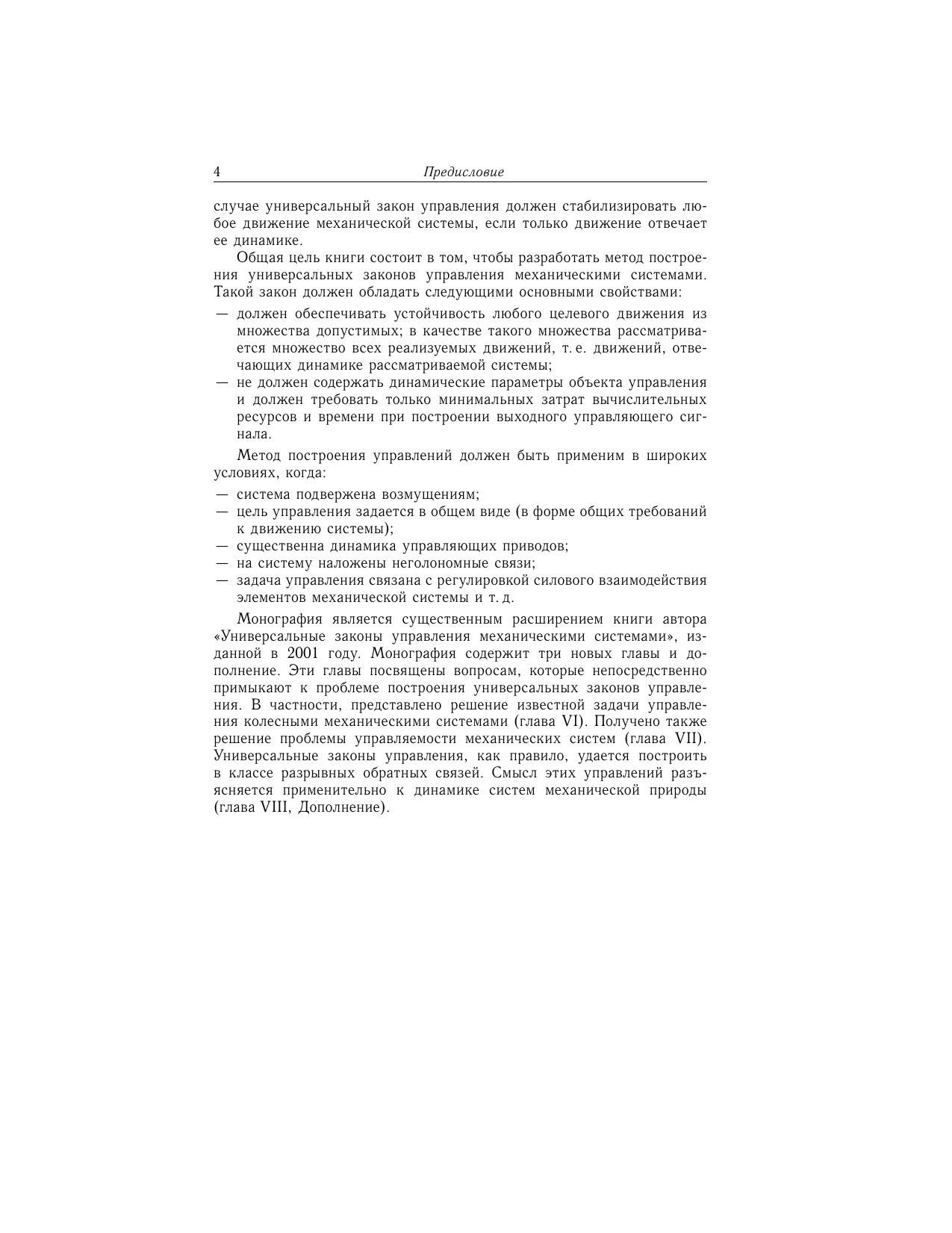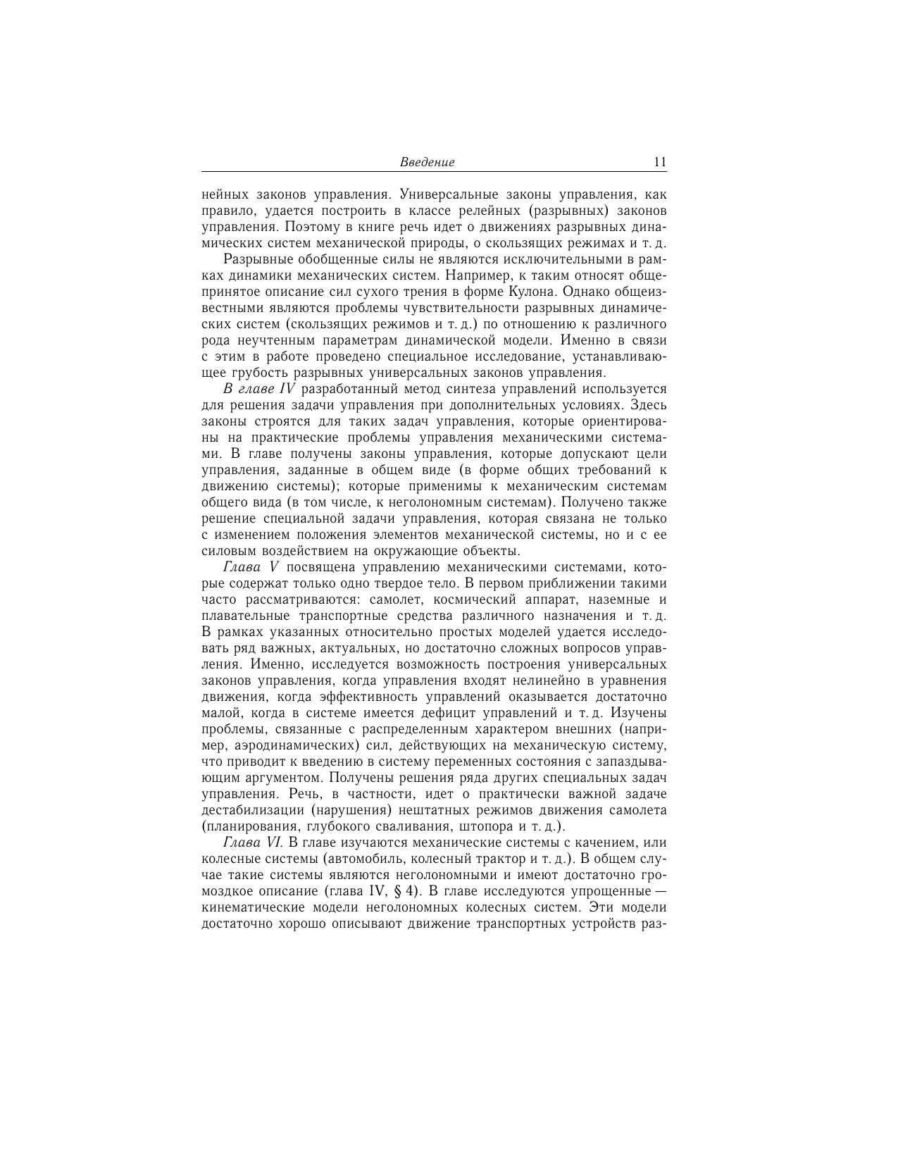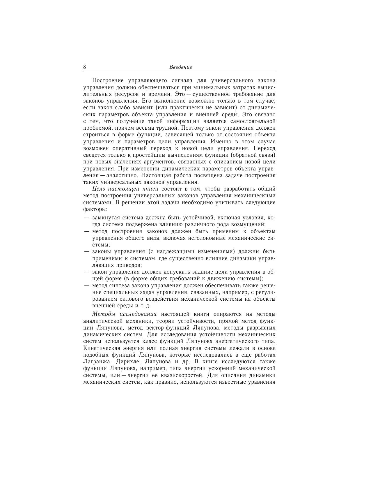 Монография развивает цикл исследований, связанных с решением общей задачи управления для механических систем (роботы, летательные аппараты и т.д.). Изучается предельная ситуация, когда требуется построить закон управления, стабилизирующий широкий спектр различных режимов движения системы при неизвестных динамических параметрах. Такие многорежимные (многоцелевые, универсальные) законы управления отвечают современным требованиям теории и практики управления. В частности, построение выходного управляющего сигнала требует только минимальных вычислительных затрат и времени. Эти законы обладают другими важными свойствами, связанными с устойчивостью замкнутой системы, ее грубостью и т.д. Представлена схема построения универсальных законов управления, разработан метод обоснования устойчивости, применимый когда система подвержена возмущениям цель управления задается в общем виде (в форме общих требований к движению системы) существенна динамика управляющих приводов на систему наложены неголономные связи задача управления связана с регулировкой силового взаимодействия элементов механической системы и т.д. Законы управления (в явной форме) получены для ряда известных задач управления. Специалистам в области теории управления и устойчивости, функций Ляпунова, разрывных динамических систем, аналитической механики.