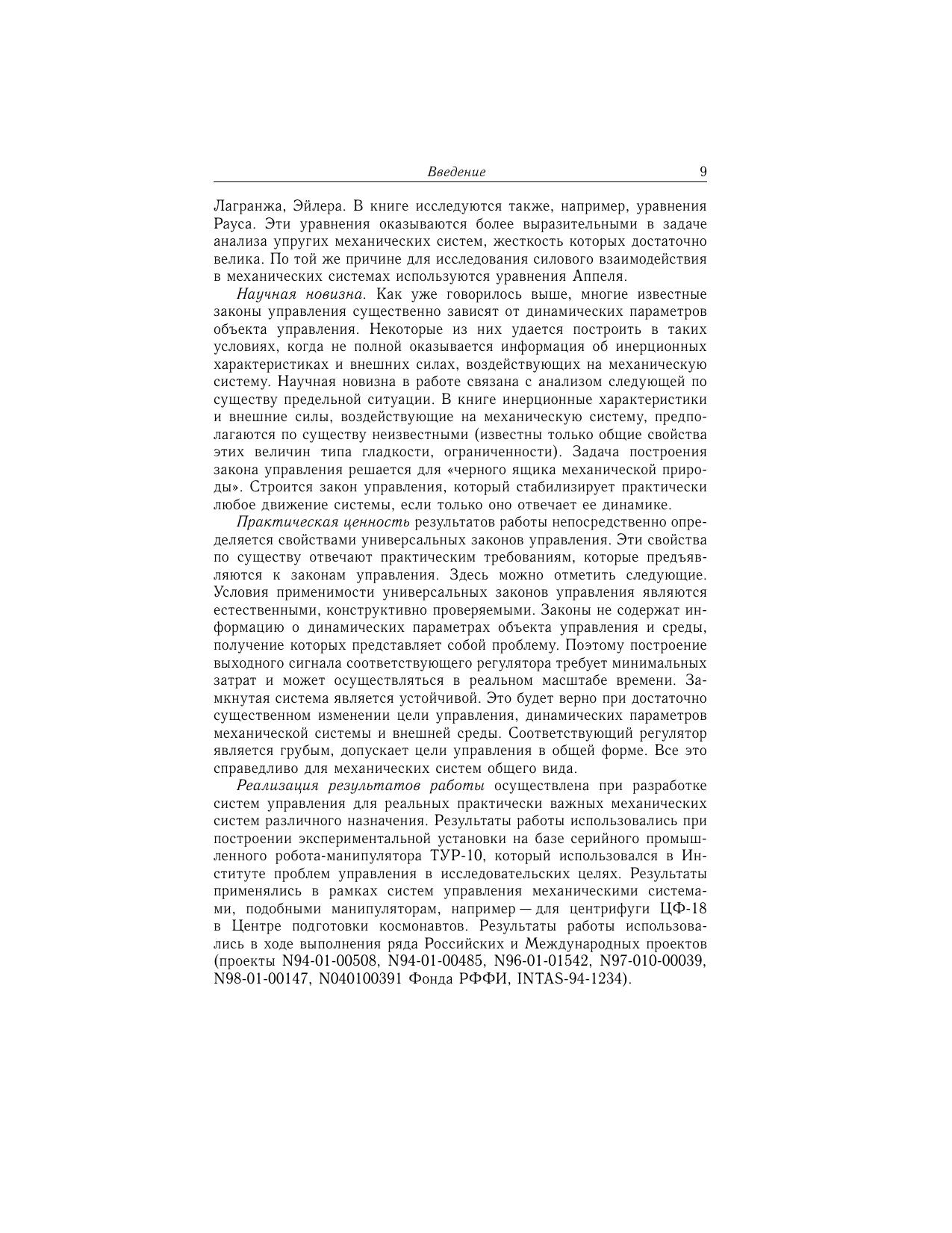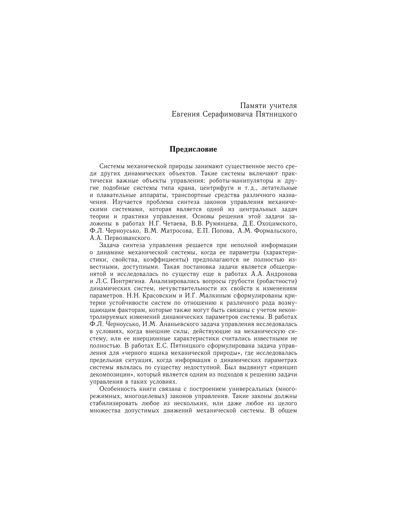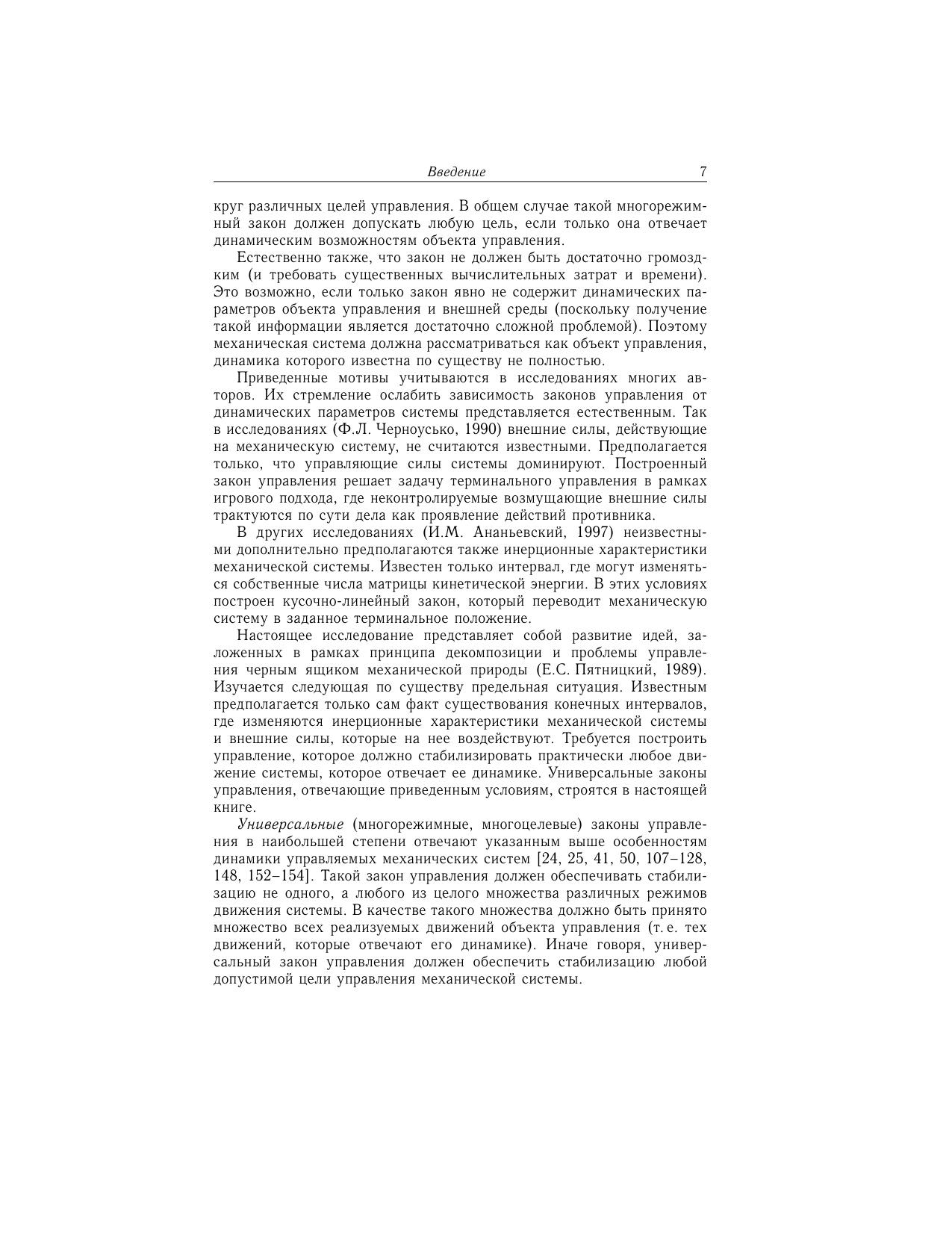 Монография развивает цикл исследований, связанных с решением общей задачи управления для механических систем (роботы, летательные аппараты и т.д.). Изучается предельная ситуация, когда требуется построить закон управления, стабилизирующий широкий спектр различных режимов движения системы при неизвестных динамических параметрах. Такие многорежимные (многоцелевые, универсальные) законы управления отвечают современным требованиям теории и практики управления. В частности, построение выходного управляющего сигнала требует только минимальных вычислительных затрат и времени. Эти законы обладают другими важными свойствами, связанными с устойчивостью замкнутой системы, ее грубостью и т.д. Представлена схема построения универсальных законов управления, разработан метод обоснования устойчивости, применимый когда система подвержена возмущениям цель управления задается в общем виде (в форме общих требований к движению системы) существенна динамика управляющих приводов на систему наложены неголономные связи задача управления связана с регулировкой силового взаимодействия элементов механической системы и т.д. Законы управления (в явной форме) получены для ряда известных задач управления. Специалистам в области теории управления и устойчивости, функций Ляпунова, разрывных динамических систем, аналитической механики.