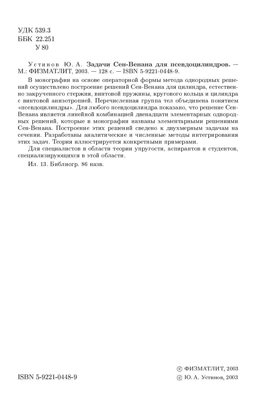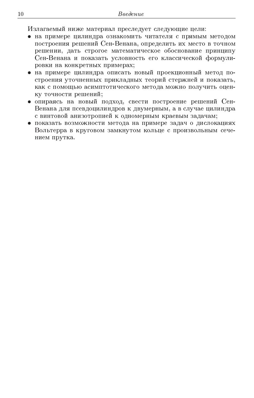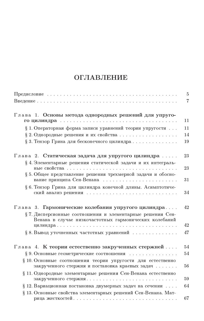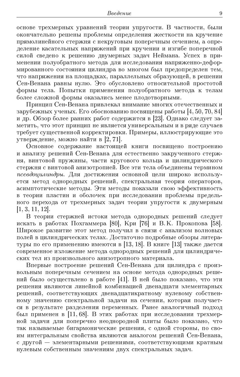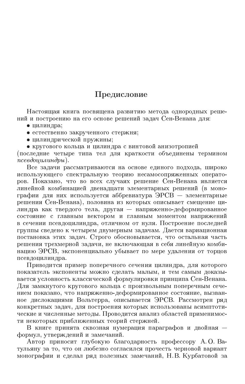 В монографии на основе операторной формы метода однородных решений осуществлено построение решений Сен-Венана для цилиндра, естественно закрученного стержня, винтовой пружины, крувового кольца и цилиндра с винтовой анизотропией. Перечисленная группа тел объединена понятием "псевдоцилиндры". Для любого псевдоцилиндра показано, что решение Сен-Венана является линейной комбинацией двенадцати элементарных однородных решений, которые в монографии названы элементарными решениями Сен-Венана. Построение этих решений сведено к двухмерным задачам на сечении. Разработаны аналитические и численные методы интегрирования этих задач. Теория иллюстрируются конкретными примерами.