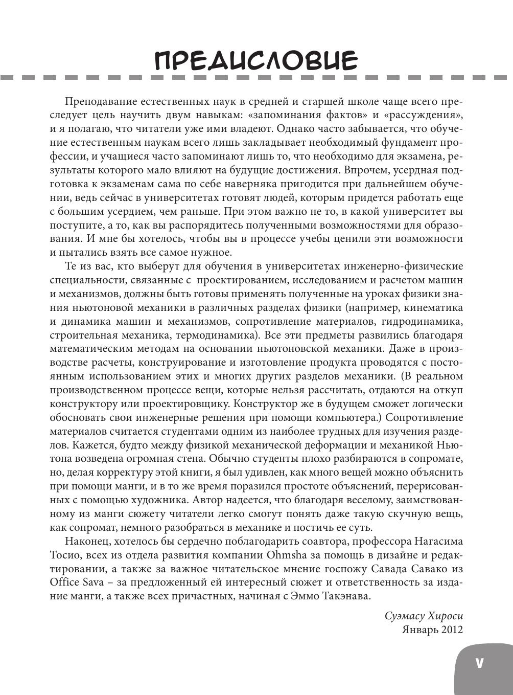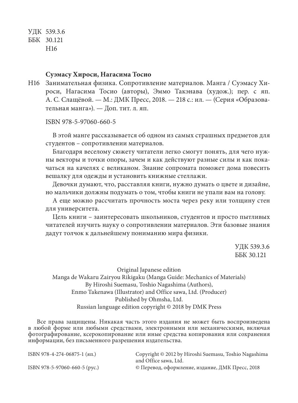 В этой манге рассказывается об одном из самых страшных предметов для студентов – сопротивлении материалов. Благодаря веселому сюжету читатели легко смогут понять, для чего нужны векторы и точки опоры, зачем и как действуют разные силы и как покачаться на качелях с великаном. Знание сопромата поможет дома повесить вешалку для одежды и установить книжные стеллажи. Девочки думают, что, расставляя книги, нужно думать о цвете и дизайне, но мальчики должны подумать о том, чтобы книги не упали вам на голову. А еще можно рассчитать прочность моста через реку или толщину стен для университета. Цель книги – заинтересовать школьников, студентов и просто пытливых читателей изучить науку о сопротивлении материалов. Эти базовые знания дадут толчок к дальнейшему пониманию мира физики.