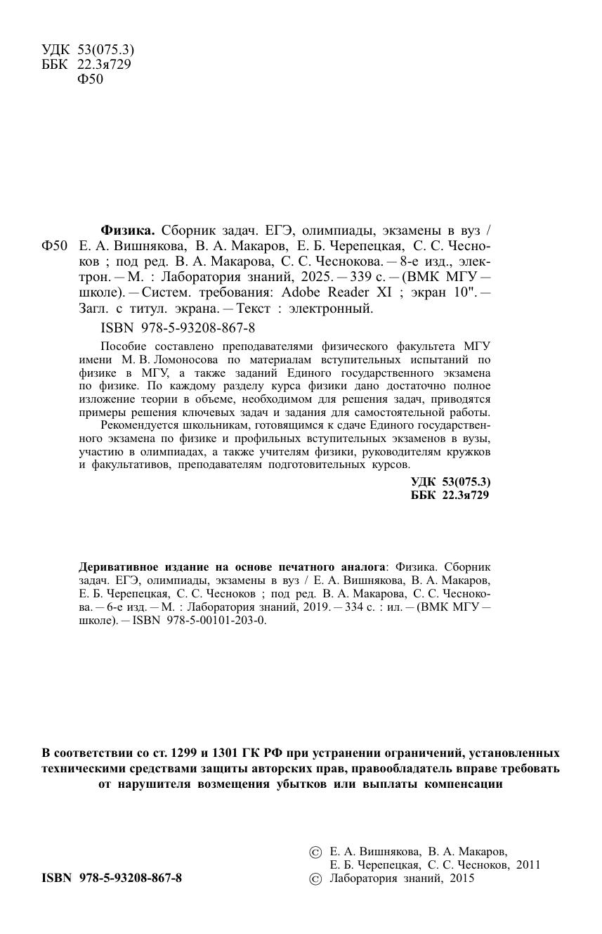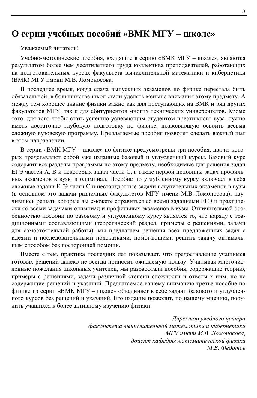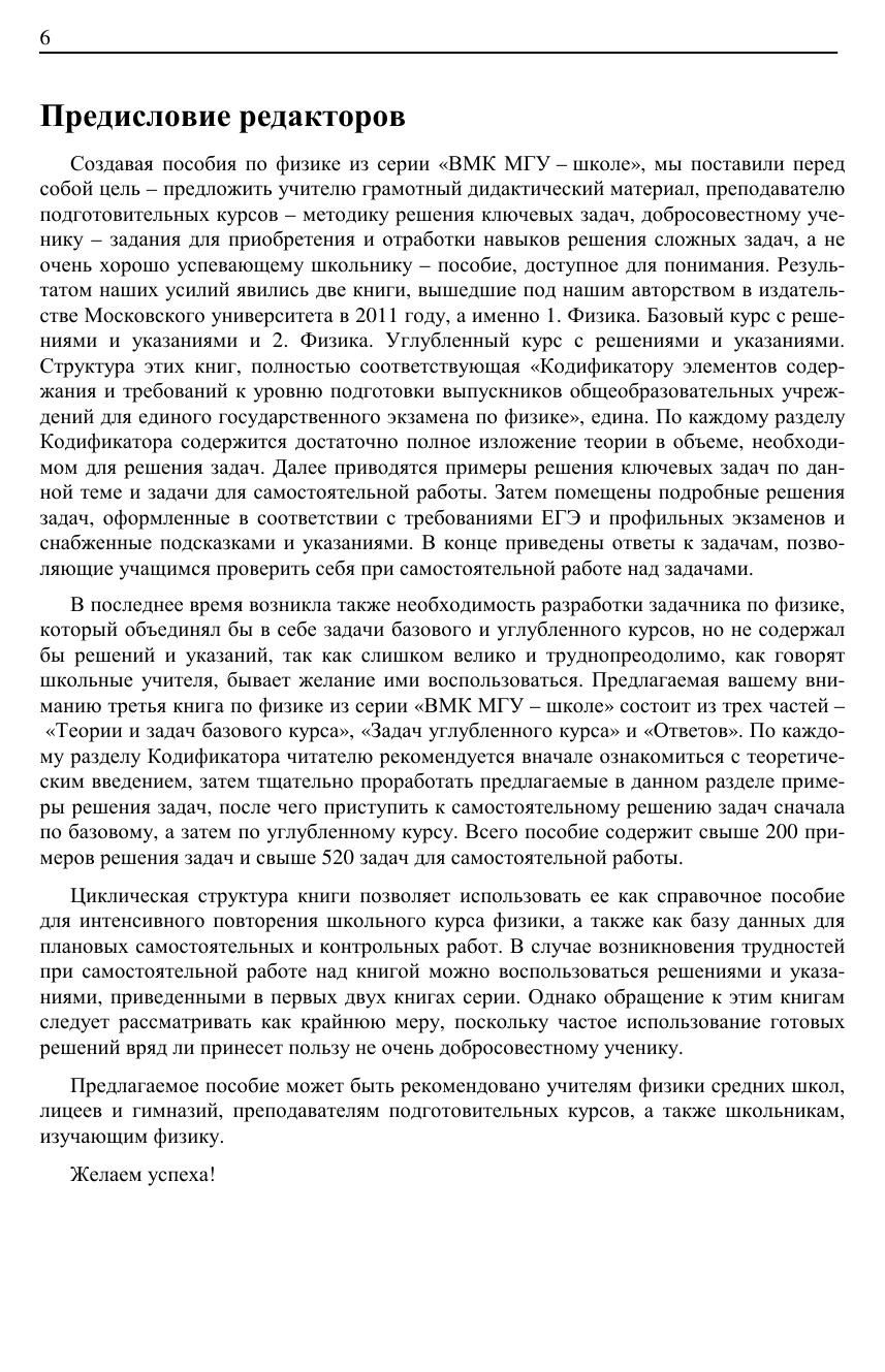 Пособие составлено преподавателями физического факультета МГУ имени М. В. Ломоносова по материалам вступительных испытаний по физике в МГУ, а также заданий Единого государственного экзамена по физике. По каждому разделу курса физики дано достаточно полное изложение теории в объеме, необходимом для решения задач, приводятся примеры решения ключевых задач и задания для самостоятельной работы. Рекомендуется школьникам, готовящимся к сдаче Единого государственного экзамена по физике и профильных вступительных экзаменов в вузы, участию в олимпиадах, а также учителям физики, руководителям кружков и факультативов, преподавателям подготовительных курсов.