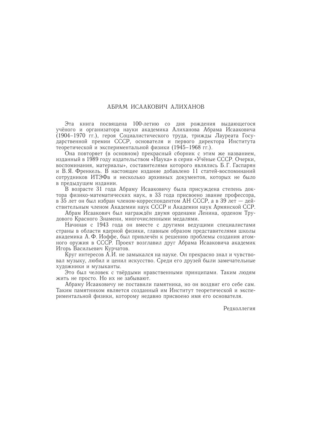 Этот сборник посвящён 100-летию со дня рождения Героя Социалистического труда, лауреата Ленинской и Государственных премий, академика Абрама Исааковича Алиханова- Института теоретической и экспериментальной физики. Книга содержит более тридцати статей-воспоминаний друзей, учеников, коллег и родных выдающегося физика, а также научно-популярные статьи А.И. Алиханова, относящиеся преимущественно к вопросам физики ядра, письма А.И. Алиханова и к нему и некоторые другие материалы о его жизни и деятельности, взятые из различных архивов. Справочный материал включает основные даты жизни и деятельности А.И. Алиханова, именной указатель, библиографию трудов А.И. Алиханова и рубрику . Для читателей, интересующихся историей развития отечественной атомной науки и техники.
