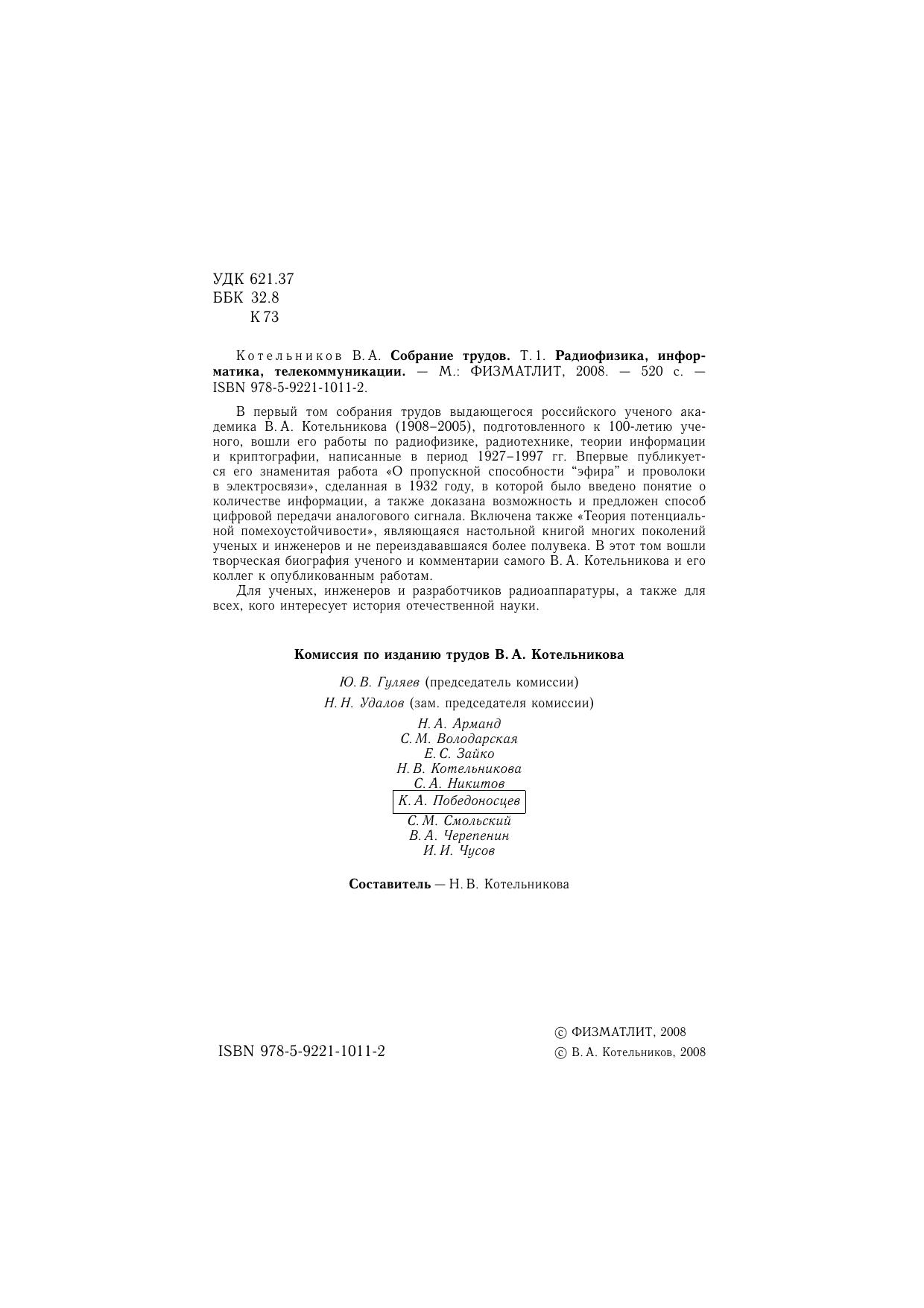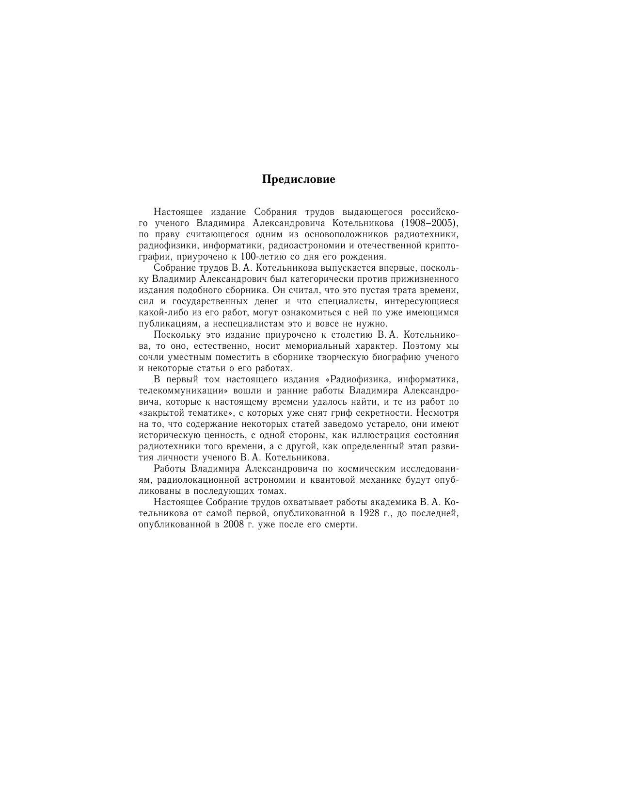 В первый том собрания трудов выдающегося российского ученого академика В.А. Котельникова (1908–2005), подготовленного к 100-летию ученого, вошли его работы по радиофизике, радиотехнике, теории информации и криптографии, написанные в период 1927–1997 гг. Впервые публикуется его знаменитая работа «О пропускной способности “эфира” и проволоки в электросвязи», сделанная в 1932 году, в которой было введено понятие о количестве информации, а также доказана возможность и предложен способ цифровой передачи аналогового сигнала. Включена также «Теория потенциальной помехоустойчивости», являющаяся настольной книгой многих поколений ученых и инженеров и не переиздававшаяся более полувека. В этот том вошли творческая биография ученого и комментарии самого В.А. Котельникова и его коллег к опубликованным работам.