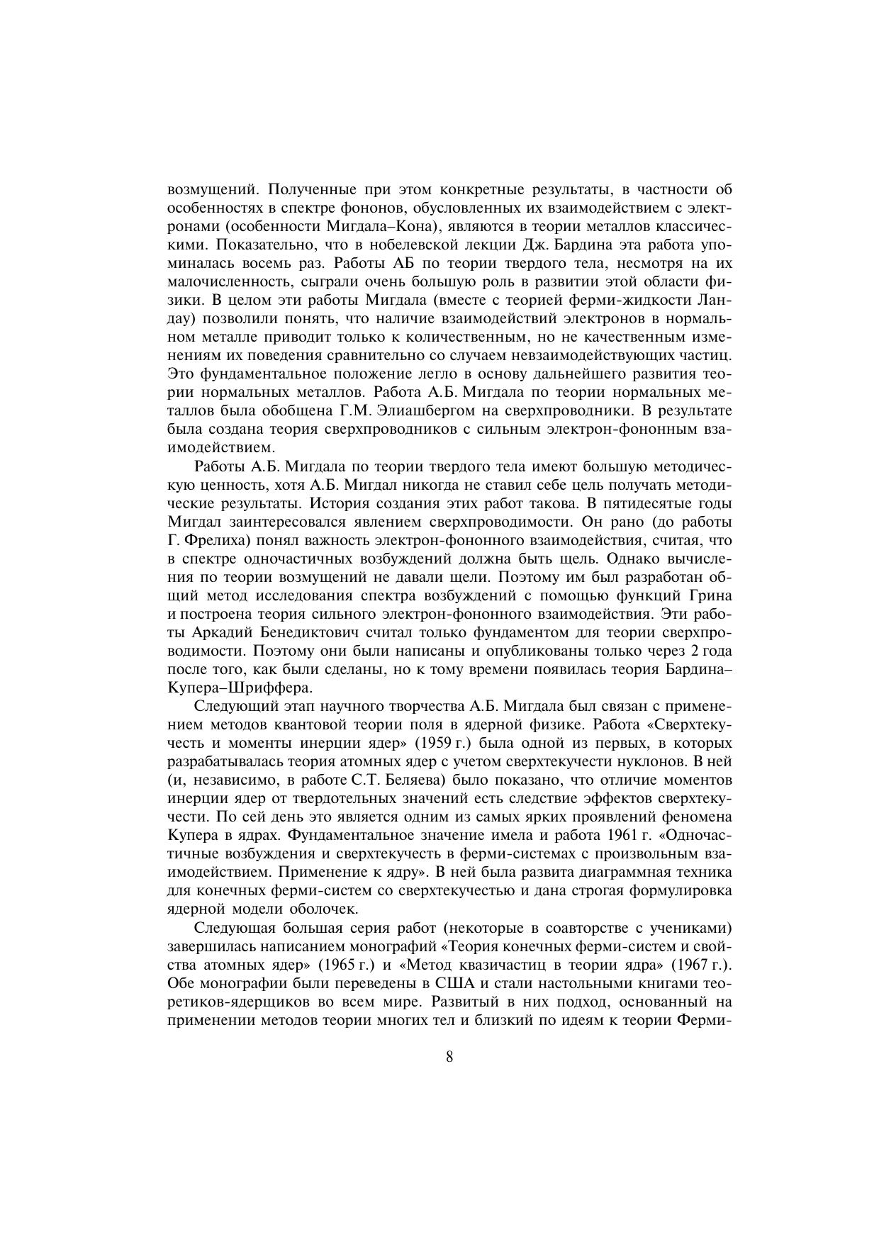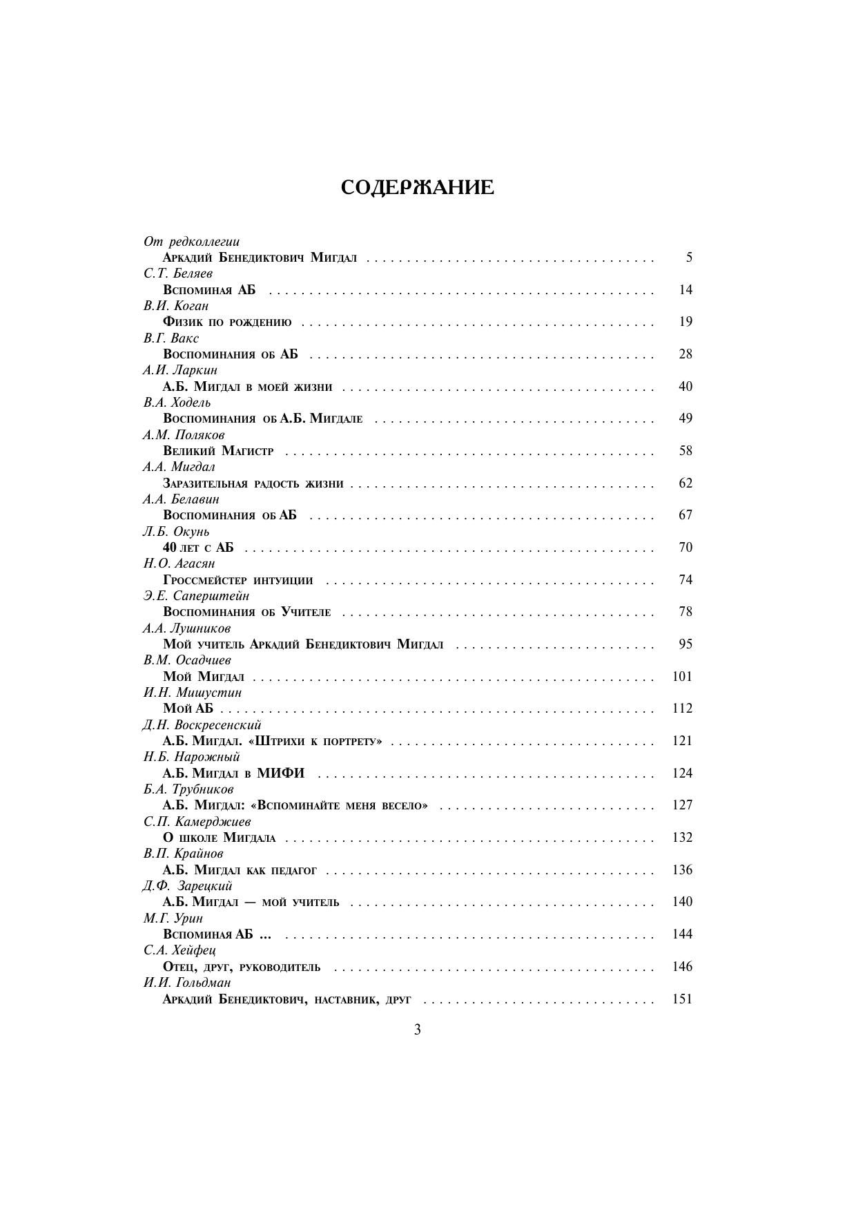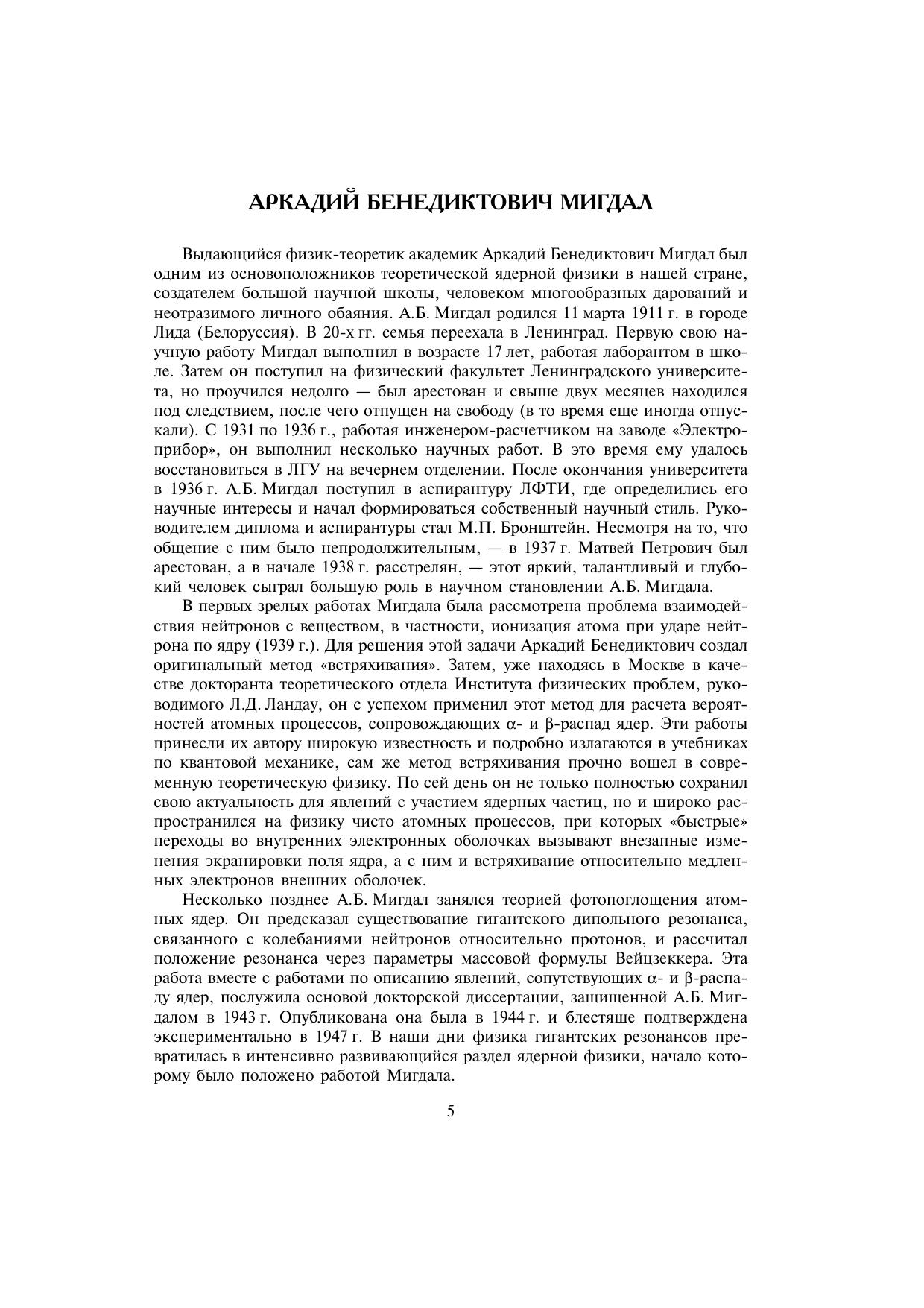 В этом сборнике публикуются воспоминания примерно пятидесяти авторов - друзей и учеников выдающегося физика, академика А.Б. Мигдала, которые охватывают сорокалетний период от начала 1950-х до 1991 г. Каждое из них в какой-то мере несет отпечаток и личности автора и особенностей его памяти. Не удивительно, что иногда одни и те же события в разных статьях выглядят несколько по-разному. Авторские тексты редактировались только в случае явных фактических ошибок. Небольшие же отклонения от , порой даже помогают взглянуть с разных сторон на такого неординарного человека, каким был Мигдал, и способствуют воссозданию многомерной картины той среды, в которой он жил и которую он сам в значительной мере формировал.