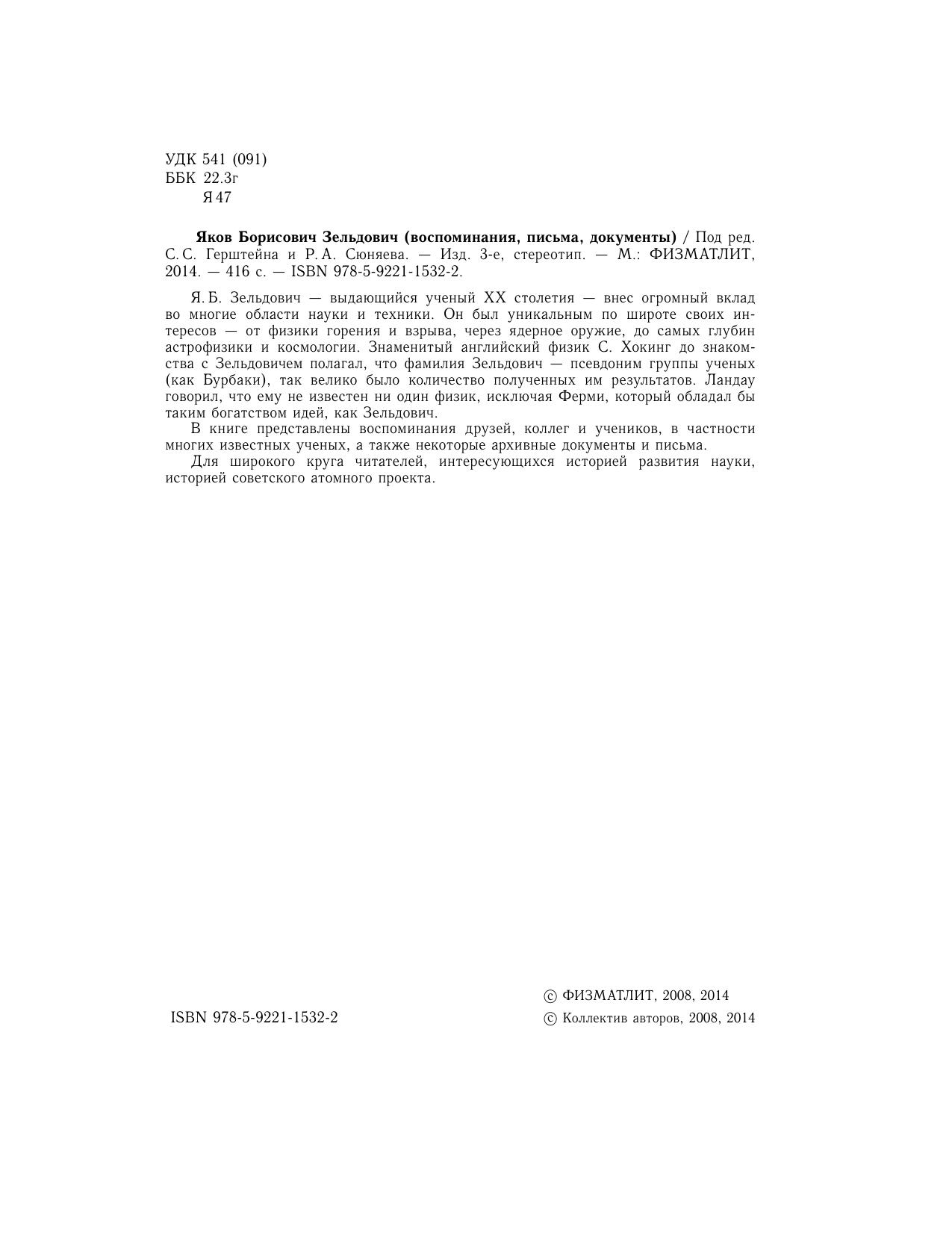 Я.Б. Зельдович — выдающийся ученый ХХ столетия — внес огромный вклад во многие области науки и техники. Он был уникальным по широте своих интересов — от физики горения и взрыва, через ядерное оружие, до самых глубин астрофизики и космологии. Знаменитый английский физик С. Хокинг до знакомства с Зельдовичем полагал, что фамилия Зельдович — псевдоним группы ученых (как Бурбаки), так велико было количество полученных им результатов. Ландау говорил, что ему не известен ни один физик, исключая Ферми, который обладал бы таким богатством идей, как Зельдович. В книге представлены воспоминания друзей, коллег и учеников, в частности многих известных ученых, а также некоторые архивные документы и письма. Для широкого круга читателей, интересующихся историей развития науки, историей советского атомного проекта.