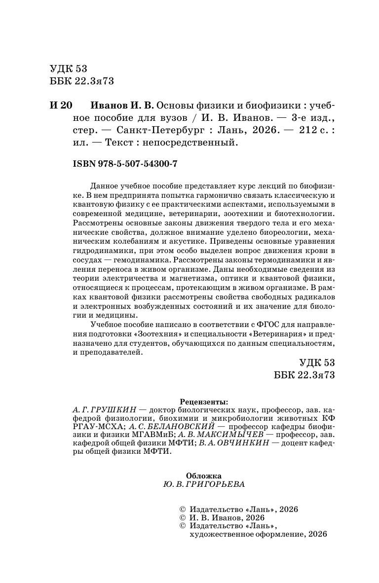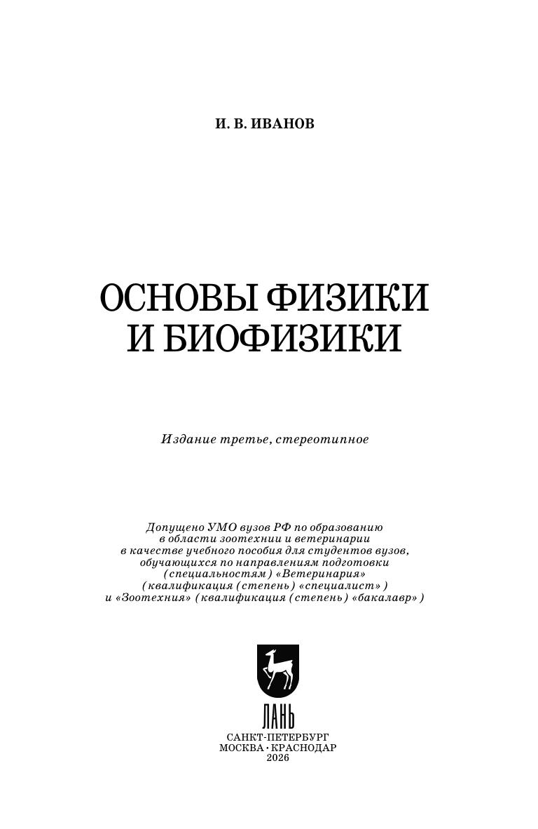 Данное учебное пособие представляет курс лекций по биофизике. В нем предпринята попытка гармонично связать классическую и квантовую физику с ее практическими аспектами, используемыми в современной медицине, ветеринарии, зоотехнии и биотехнологии. Рассмотрены основные законы движения твердого тела и его механические свойства, должное внимание уделено биореологии, механическим колебаниям и акустике. Приведены основные уравнения гидродинамики, при этом особо выделен вопрос движения крови в сосудах - гемодинамика. Рассмотрены законы термодинамики и явления переноса в живом организме. Даны необходимые сведения из теории электричества и магнетизма, оптики и квантовой физики, относящиеся к процессам, протекающим в живом организме. В рамках квантовой физики рассмотрены свойства свободных радикалов и электронных возбужденных состояний и их значение для биологии и медицины. Учебное пособие написано в соответствии с ФГОС для направления подготовки "Зоотехния" и специальности "Ветеринария" и предназначено для студентов, обучающихся по данным специальностям, и преподавателей.