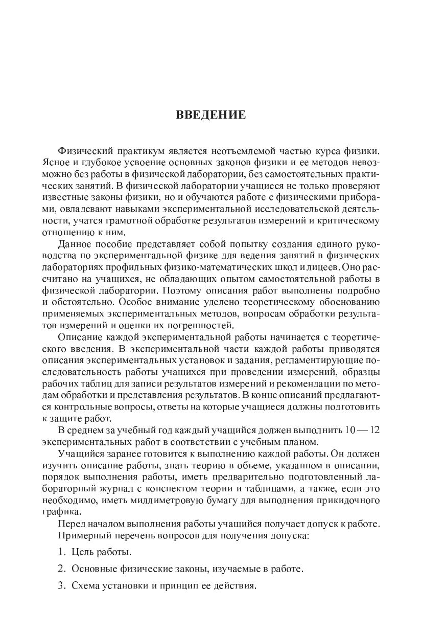 В книке описаны экспериментальные работы, входящие в программу физико-математического лицея г.Сергиев Посад в рамках физического практимума. Она представляет собой попытку создания единого руководства для проведения практических занятий в классах и школах с угрубленным изучением физики, а также для подготовки экспериментальным турам олимпиад высокого уровня. Вводнвй материал прадиционно посвящен методам обработки экспериментальных данных. Описание каждой экспериментальной работы начинаетсяс теоретического введения. В экспериментальной части приводятся описания экпериментальных установак и задания, регламентирующие последовательностьработы учащихся при проведении измерений. Приводятся образцы рабочих таблиц для записи результатов измерений, рекомендации по методам оработки и представления результатов и требования к оформлению отчетов. В конце описаний предлагаются контрольные вопросы, ответы на которые учащиеся должны подготовить к защите работ.Для школ и классов с углубленным изучением физики.