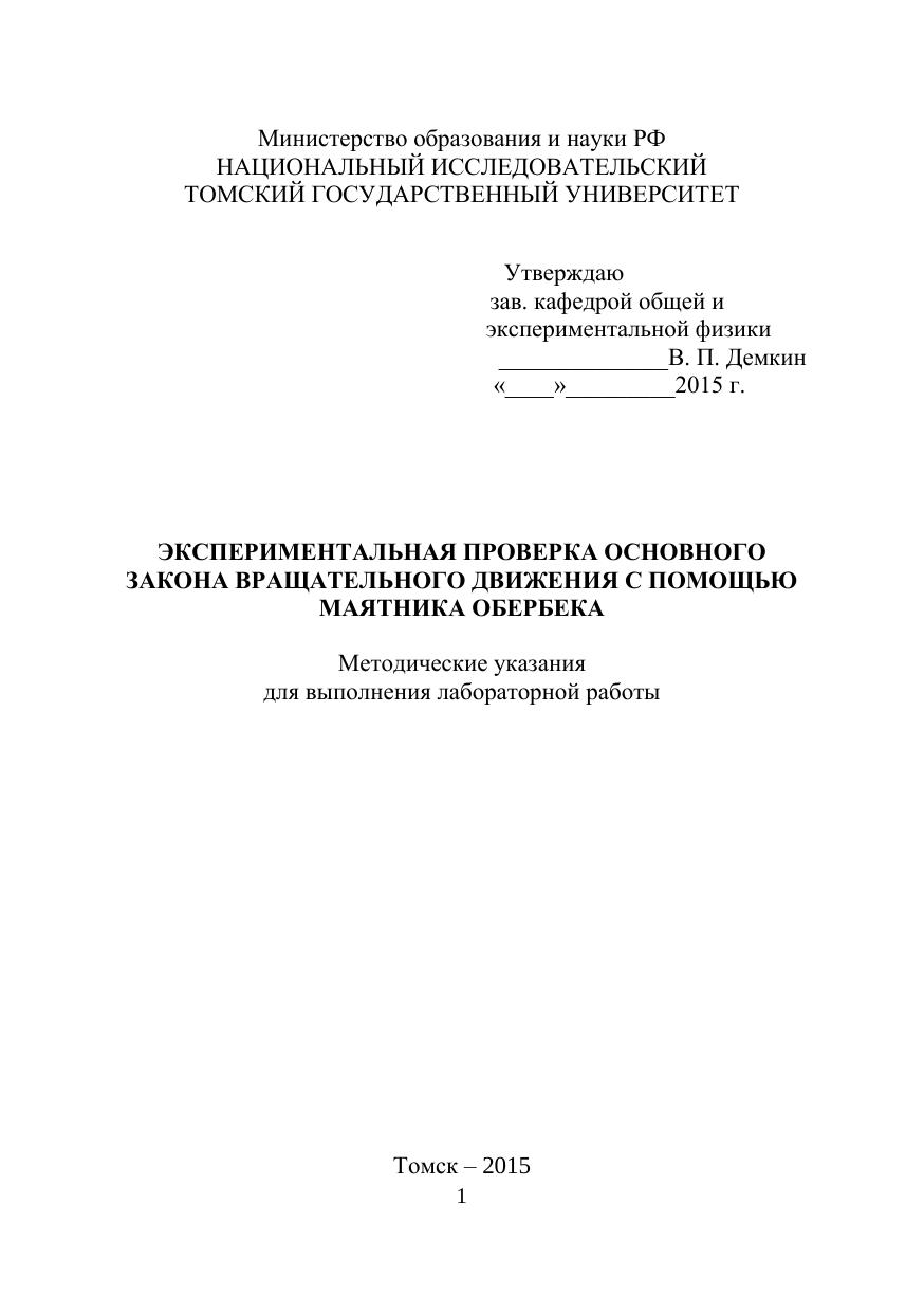 Экспериментальная проверка основного закона вращательного движения с помощью маятника обербека. Методические указания для выполнения лабораторной работы