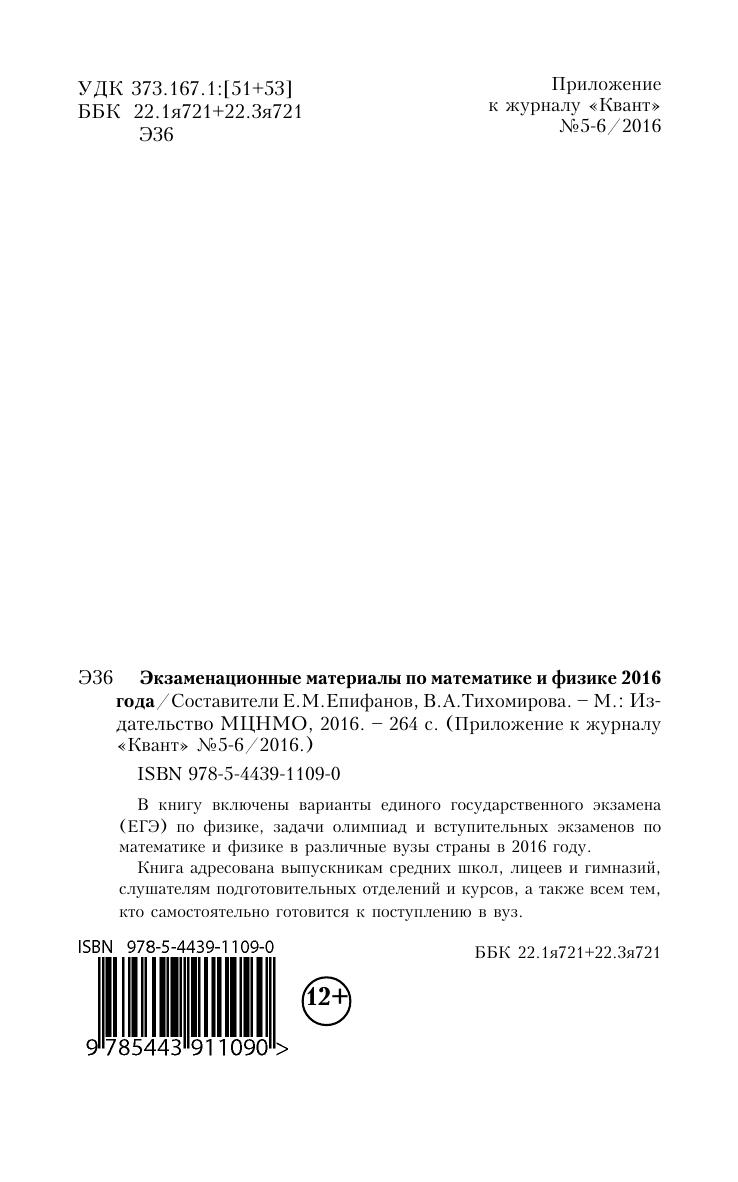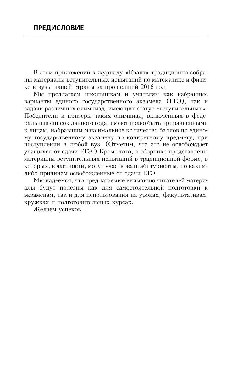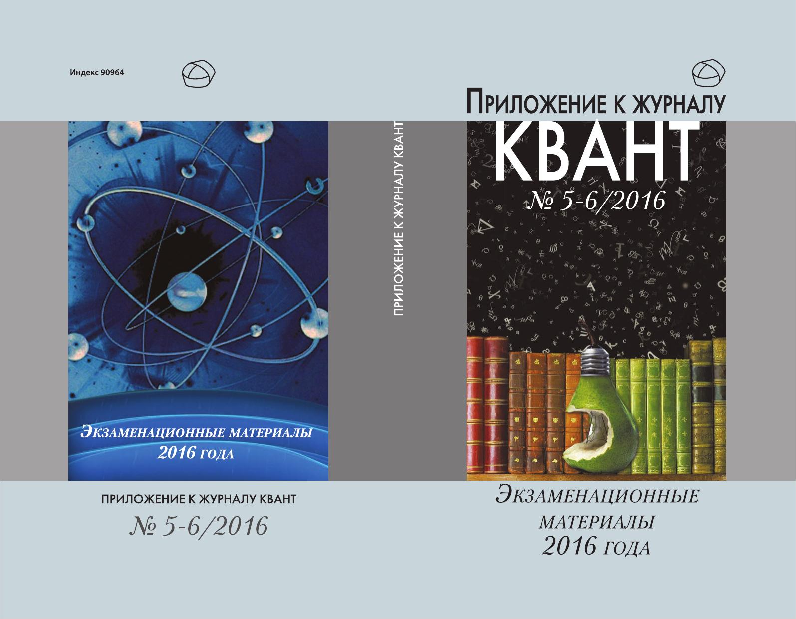 Экзаменационные материалы по математике и физике 2016 года. Приложение к журналу "Квант" № 5-6/2016