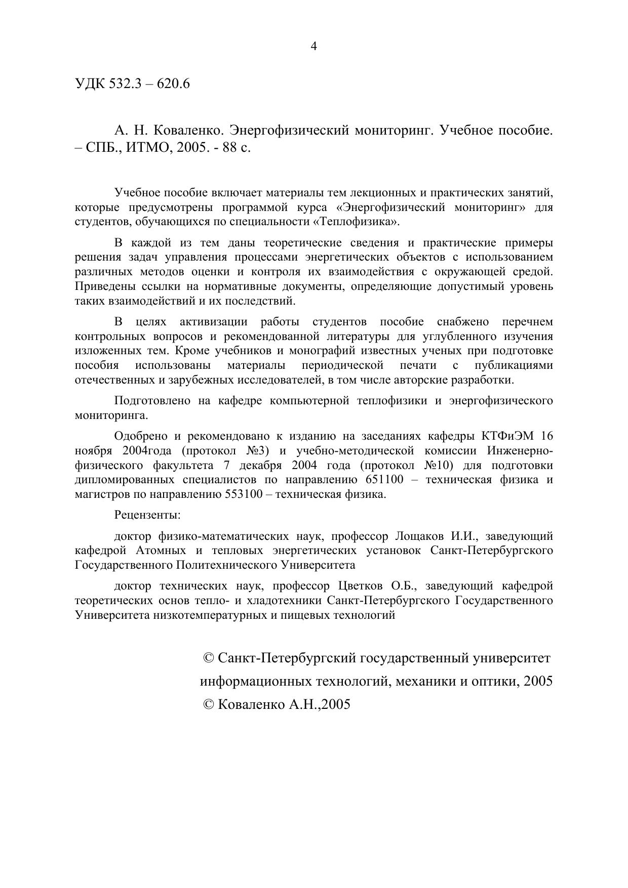 Учебное пособие включает материалы тем лекционных и практических занятий, которые предусмотрены программой курса «Энергофизический мониторинг» для студентов, обучающихся по специальности «Теплофизика». В каждой из тем даны теоретические сведения и практические примеры решения задач управления процессами энергетических объектов с использованием различных методов оценки и контроля их взаимодействия с окружающей средой. Приведены ссылки на нормативные документы, определяющие допустимый уровень таких взаимодействий и их последствий. В целях активизации работы студентов пособие снабжено перечнем контрольных вопросов и рекомендованной литературы для углубленного изучения изложенных тем. Кроме учебников и монографий известных ученых при подготовке пособия использованы материалы периодической печати с публикациями отечественных и зарубежных исследователей, в том числе авторские разработки.