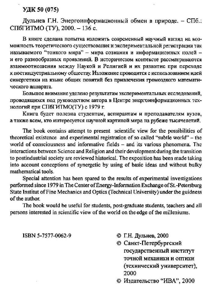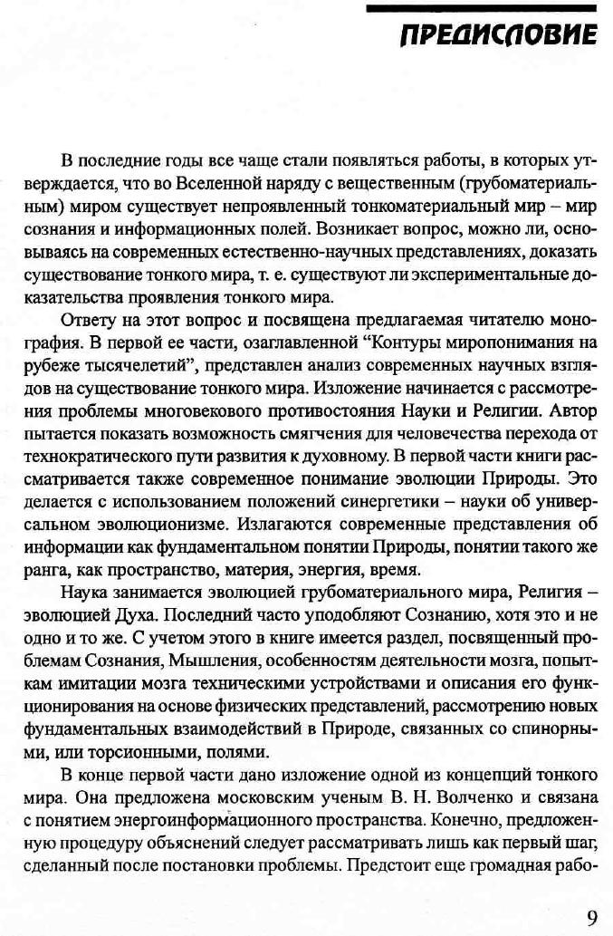 В книге сделана попытка изложить современный научный взгляд на возможность теоретического существования и экспериментальной регистрации так называемого "тонкого мира" — мира сознания и информационных полей -и его разнообразных проявлений. В историческом контексте рассматриваются взаимоотношения между Наукой и Религией и их развитие при переходе к постиндустриальному обществу. Изложение проводится с использованием идей синергетики на языке общих понятий без привлечения громоздкого математического аппарата.