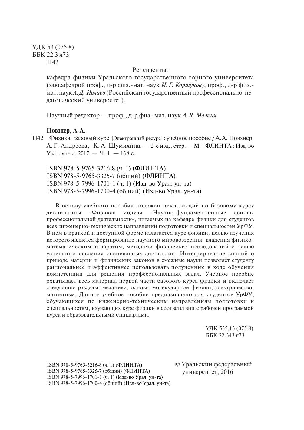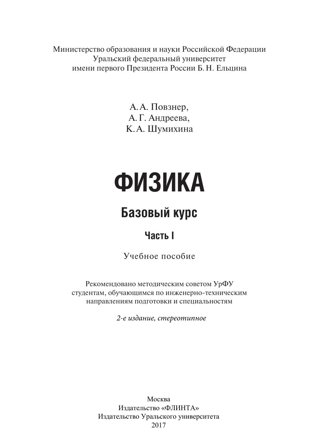 В основу учебного пособия положен цикл лекций по базовому курсу дисциплины «Физика» модуля «Научно-фундаментальные основы профессиональной деятельности», читаемых на кафедре физики для студентов всех инженерно-технических направлений подготовки и специальностей УрФУ. В нем в краткой и доступной форме излагается курс физики, целью изучения которого является формирование научного мировоззрения, владения физико-математическим аппаратом, методами физических исследований с целью успешного освоения специальных дисциплин. Интегрирование знаний о природе материи и физических законов в смежные науки позволяет студенту рациональнее и эффективнее использовать полученные в ходе обучения компетенции для решения профессиональных задач. Учебное пособие охватывает весь материал первой части базового курса физики и включает следующие разделы: механика, основы молекулярной физики, электричество, магнетизм. Данное учебное пособие предназначено для студентов УрФУ, обучающихся по инженерно-техническим направлениям подготовки и специальностям, изучающих курс физики в соответствии с рабочей программой курса и образовательными стандартами.