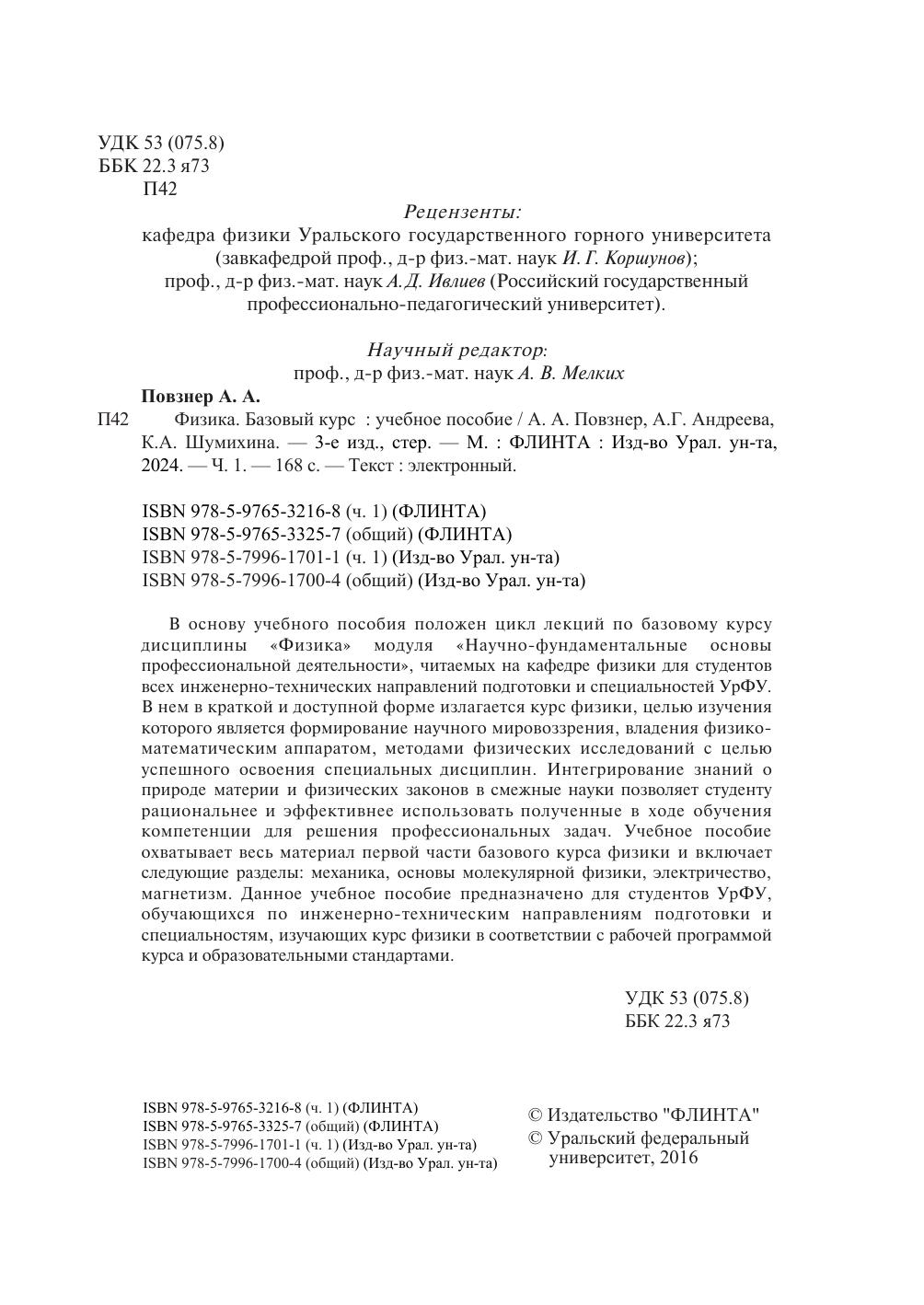 охватывает весь материал первой части базового курса физики и включает следующие разделы: механика, основы молекулярной физики, электричество, магнетизм. Данное учебное пособие предназначено для студентов УрФУ, обучающихся по инженерно-техническим направлениям подготовки и специальностям, изучающих курс физики в соответствии с рабочей программой курса и образовательными стандартами.