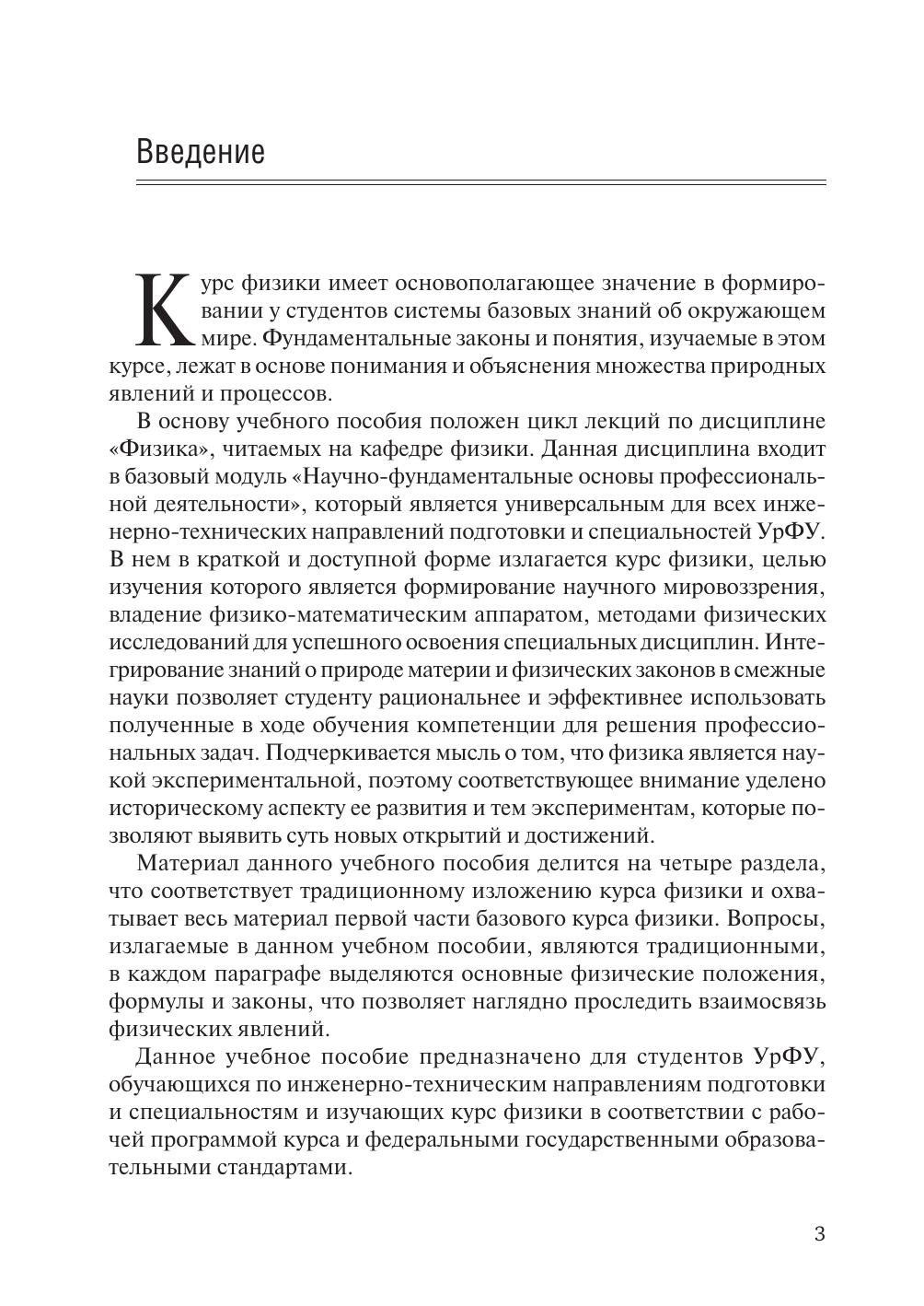 В основу учебного пособия положен цикл лекций по базовому курсу дисциплины «Физика» модуля «Научно-фундаментальные основы профессиональной деятельности», читаемых на кафедре физики для студентов всех инженерно-технических направлений подготовки и специальностей УрФУ. В нем в краткой и доступной форме излагается курс физики, целью изучения которого является формирование научного мировоззрения, владения физико-математическим аппаратом, методами физических исследований с целью успешного освоения специальных дисциплин. Интегрирование знаний о природе материи и физических законов в смежные науки позволяет студенту рациональнее и эффективнее использовать полученные в ходе обучениякомпетенции для решения профессиональных задач. Учебное пособие