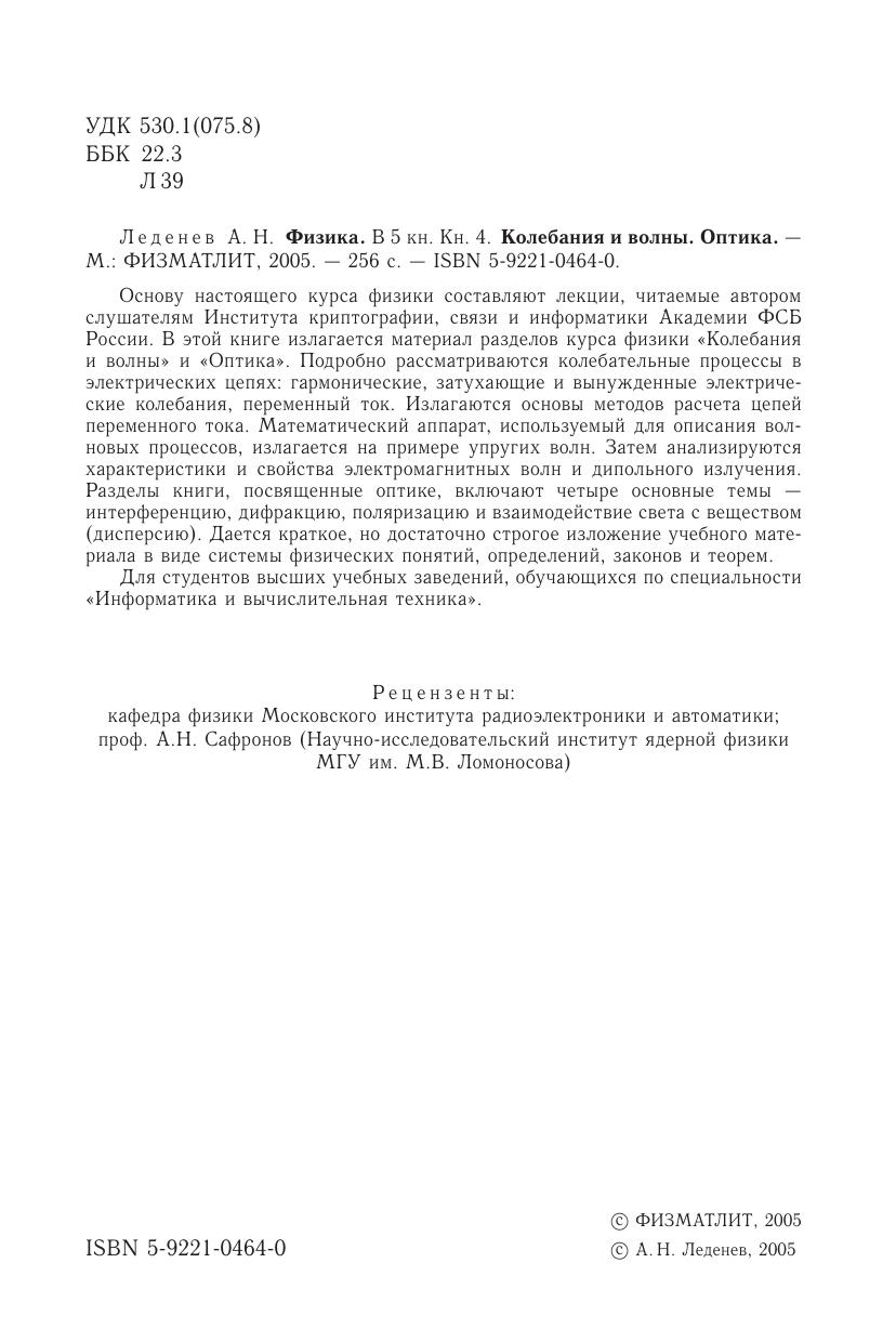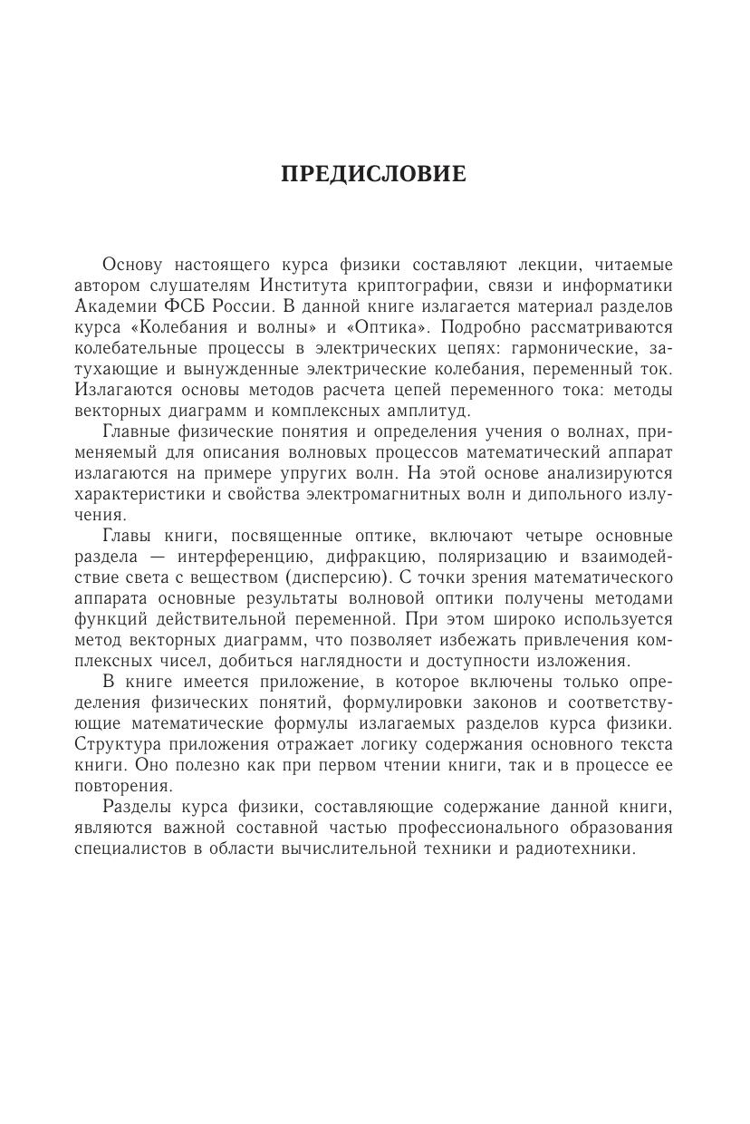 Основу настоящего курса физики составляют лекции, читаемые автором слушателям Института криптографии, связи и информатики Академии ФСБ России. В этой книге излагается материал разделов курса физики «Колебания и волны» и «Оптика». Подробно рассматриваются колебательные процессы в электрических цепях: гармонические, затухающие и вынужденные электрические колебания, переменный ток. Излагаются основы методов расчета цепей переменного тока. Математический аппарат, используемый для описания волновых процессов, излагается на примере упругих волн. Затем анализируются характеристики и свойства электромагнитных волн и дипольного излучения. Разделы книги, посвященные оптике, включают четыре основные темы — интерференцию, дифракцию, поляризацию и взаимодействие света с веществом (дисперсию). Дается краткое, но достаточно строгое изложение учебного материала в виде системы физических понятий, определений, законов и теорем. Для студентов высших учебных заведений, обучающихся по специальности «Информатика и вычислительная техника».