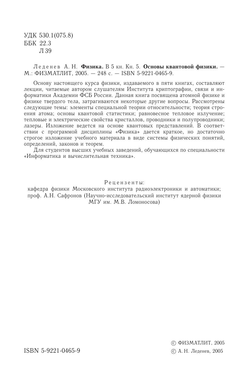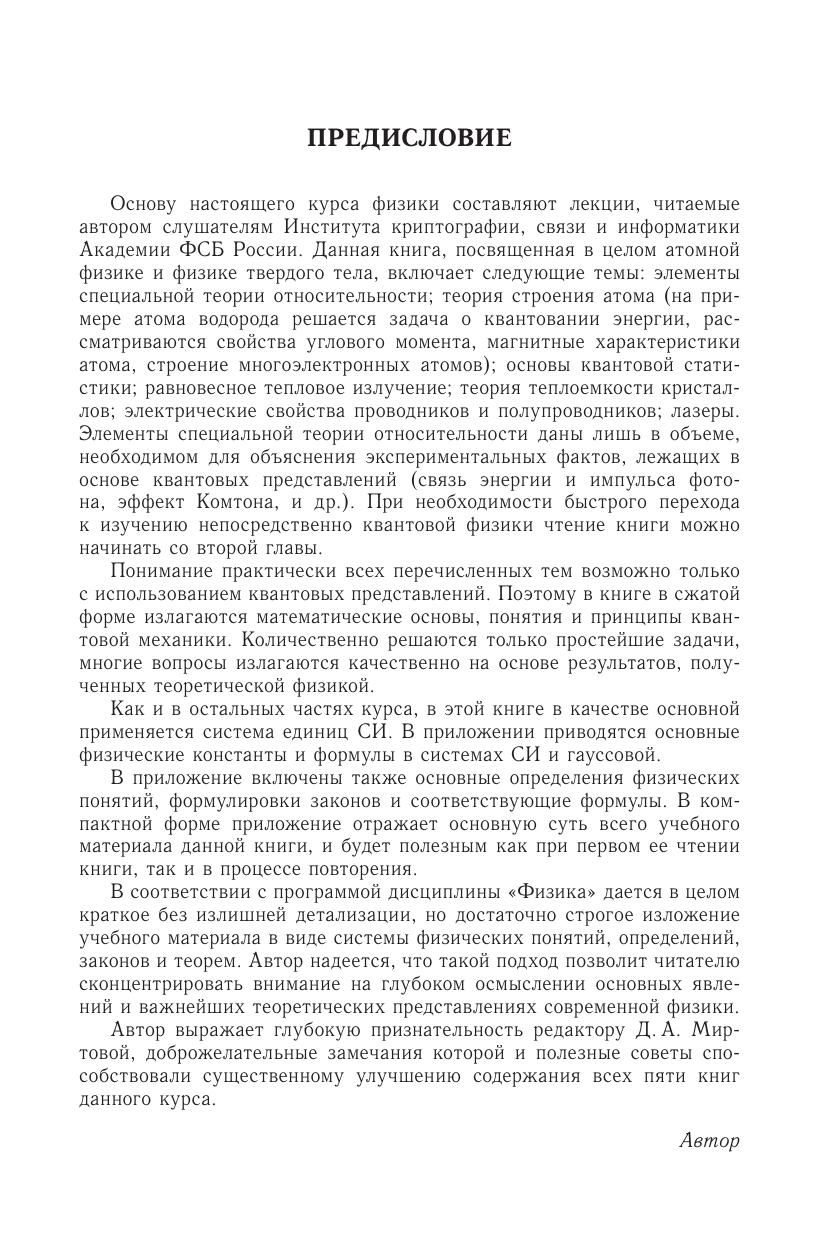 Основу настоящего курса физики, издаваемого в пяти книгах, составляют лекции, читаемые автором слушателям Института криптографии, связи и информатики Академии ФСБ России. Данная книга посвящена атомной физике и физике твердого тела, затрагиваются некоторые другие вопросы. Рассмотрены следующие темы: элементы специальной теории относительности теория строения атома основы квантовой статистики равновесное тепловое излучение тепловые и электрические свойства кристаллов, проводники и полупроводники лазеры. Изложение ведется на основе квантовых представлений. В соответствии с программой дисциплины «Физика» дается краткое, но достаточно строгое изложение учебного материала в виде системы физических понятий, определений, законов и теорем. Для студентов высших учебных заведений, обучающихся по специальности «Информатика и вычислительная техника».