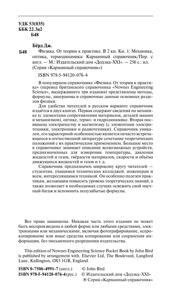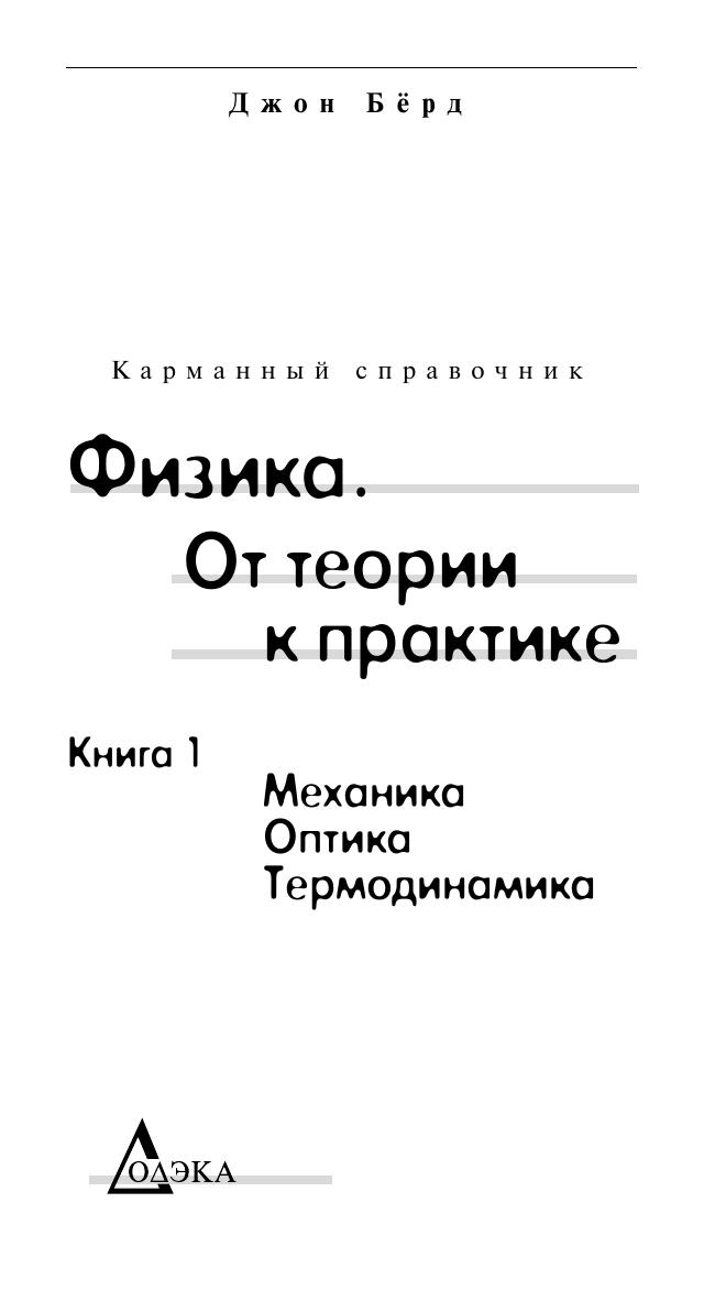 В популярном справочнике «Физика. От теории к практике» (перевод британского справочника «Newnes Engineering Science», выдержавшего три издания) представлены методы, формулы, диаграммы и справочные данные основных разделов физики.Для удобства читателей в русском варианте справочник издаётся в двух книгах. Первая содержит сведения по механике (с элементами сопротивления материалов, деталей машин и механизмов), оптике, термо и гидродинамике. Вторая посвящена электричеству и магнетизму (с элементами электротехники, электроники и радиотехники). Справочник уникален, его характерной особенностью является нечасто встречающееся в отечественной литературе сочетание теоретических положений с их практическим применением. Большое местов справочнике занимает описание всевозможных устройств, предназначенных для измерения температуры, давления жидкостей и газов, твёрдости материалов, скорости и объёма движущихся жидкостей и газов и т. д. Справочник предназначен широкому кругу читателей — студентам, учащимся технических колледжей, инженерам и всем, интересующимся техникой. Он особенно полезен практикам, желающим повысить уровень теоретических знаний, атакже позволяет в необходимых случаях освежить свой научный багаж и вспомнить полузабытые формулы.