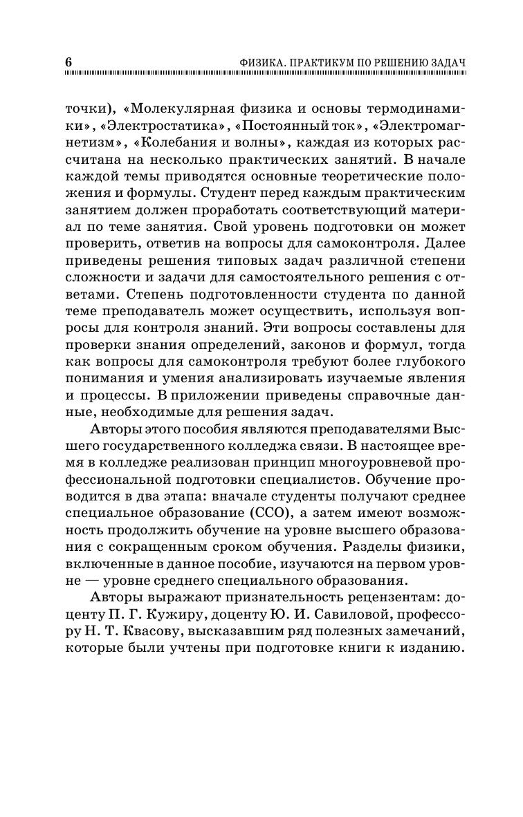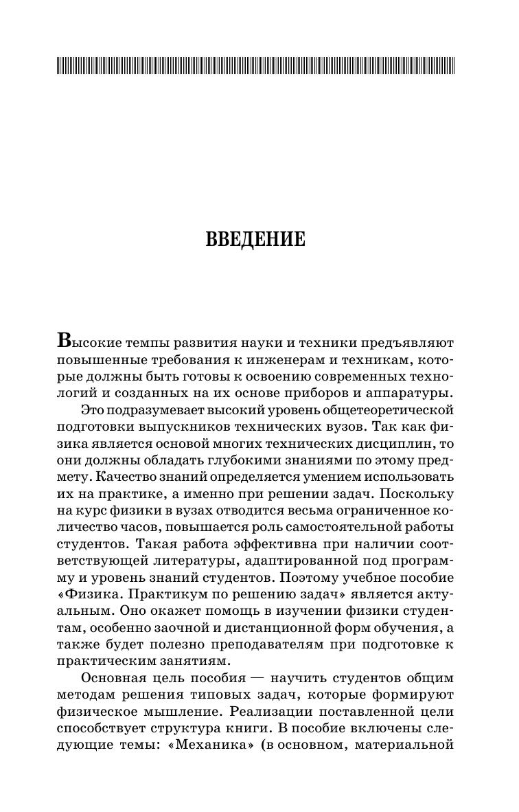 Основная цель пособия — научить студентов общим методам решения типовых задач, которые формируют физическое мышление. В пособие включены следующие разделы: «Механика», «Молекулярная физика и основы термодинамики», «Электростатика», «Постоянный ток», «Электромагнетизм», «Колебания и волны». В начале каждого раздела приводятся основные теоретические положения и формулы. Каждое практическое занятие начинается с вопросов для контроля, далее приведено решение типовых задач различной степени сложности, задачи для самостоятельного решения с ответами и вопросы для самоконтроля. Пособие предназначено студентам технических вузов, особенно заочной и дистанционной форм обучения, и преподавателям при подготовке к практическим занятиям.