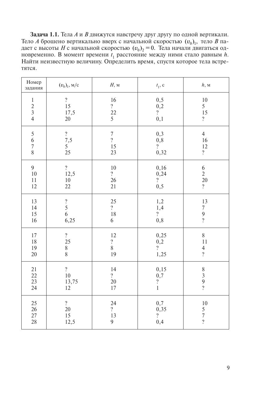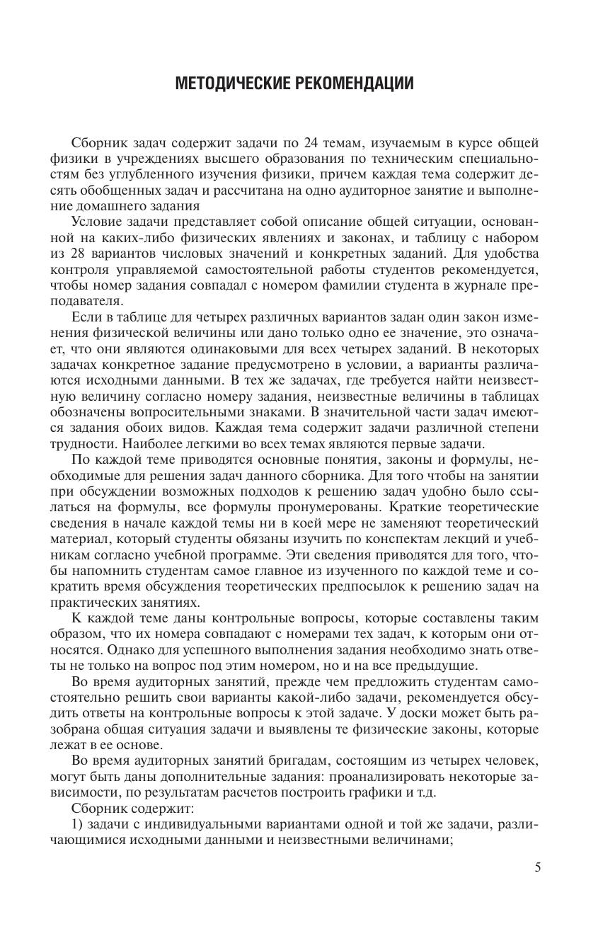 Содержатся задачи по всему курсу общей физики. Отличительной особенностью сборника является то, что вместо условия задачи дается описание общей ситуации, на основании которой по приведенным в таблицах данным можно сформулировать большое количество конкретных задач. По каждой теме приводятся основные понятия, формулы и контрольные вопросы.