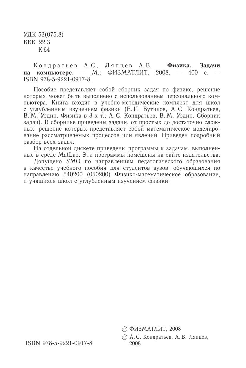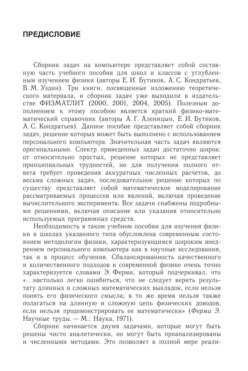 Пособие представляет собойс борник задач по физике, решение которых может быть выполнено с использованием персонального компьютера. Книга входит в учебно-методические комплект для школ с углубленным изучением физики (Е.И. Бутиков, А.С. Кондратьев, В. М. Уздин. Физика в 3-х т. А.С. Кондратьев, В. М. Уздин. Сборникзадач). В сборнике приведены задачи, от простых до достаточно сложных, решение которых представляет собойм атематическое моделирование рассматриваемых процессов или явлений. Приведен подробный разбор всех задач. На отдельнойд искете приведены программы к задачам, выполненные в среде MatLab. Эти программы помещены на сайте издательства.