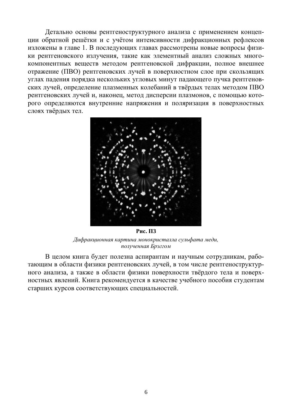 В первой главе рассмотрены принципы рентгеноструктурного анализа и связанные с ними некоторые вопросы кристаллографии. Во второй главе изложены теоретические принципы элементного анализа многокомпонентных веществ, примененные к анализу природных алюмосиликатов (глин) и диоксида титана. Показано, что метод элементного анализа в пределах десятых долей процента не зависит от полиморфизма исследуемого материала. В третьей главе рассмотрено явление полного внешнего отражения (ПВО) рентгеновских лучей от металлов и показано, что метод ПВО имеет чисто поверхностный характер и в сочетании с рентгеновской дифракцией установлен закон обратной зависимости показателя преломления рентгеновских лучей от межплоскостного расстояния. В следующей главе рассмотрено определение в твердых телах плазменных колебаний, возбужденных рентгеновскими лучами. Показана возможность измерения энергии плазмонов, концентрации плазменных локализованных электронов и энергии Ферми в металлах. Существенное расширение возможностей определения плазмонов методом ПВО обеспечил метод исследования дисперсии плазмонов в твердых телах. Показано, что этот метод позволяет определять внутренние механические напряжения и поляризацию в поверхностных слоях аморфных и кристаллических диэлектриков и полупроводников толщиной несколько нанометров.