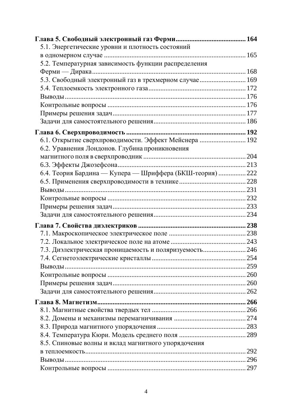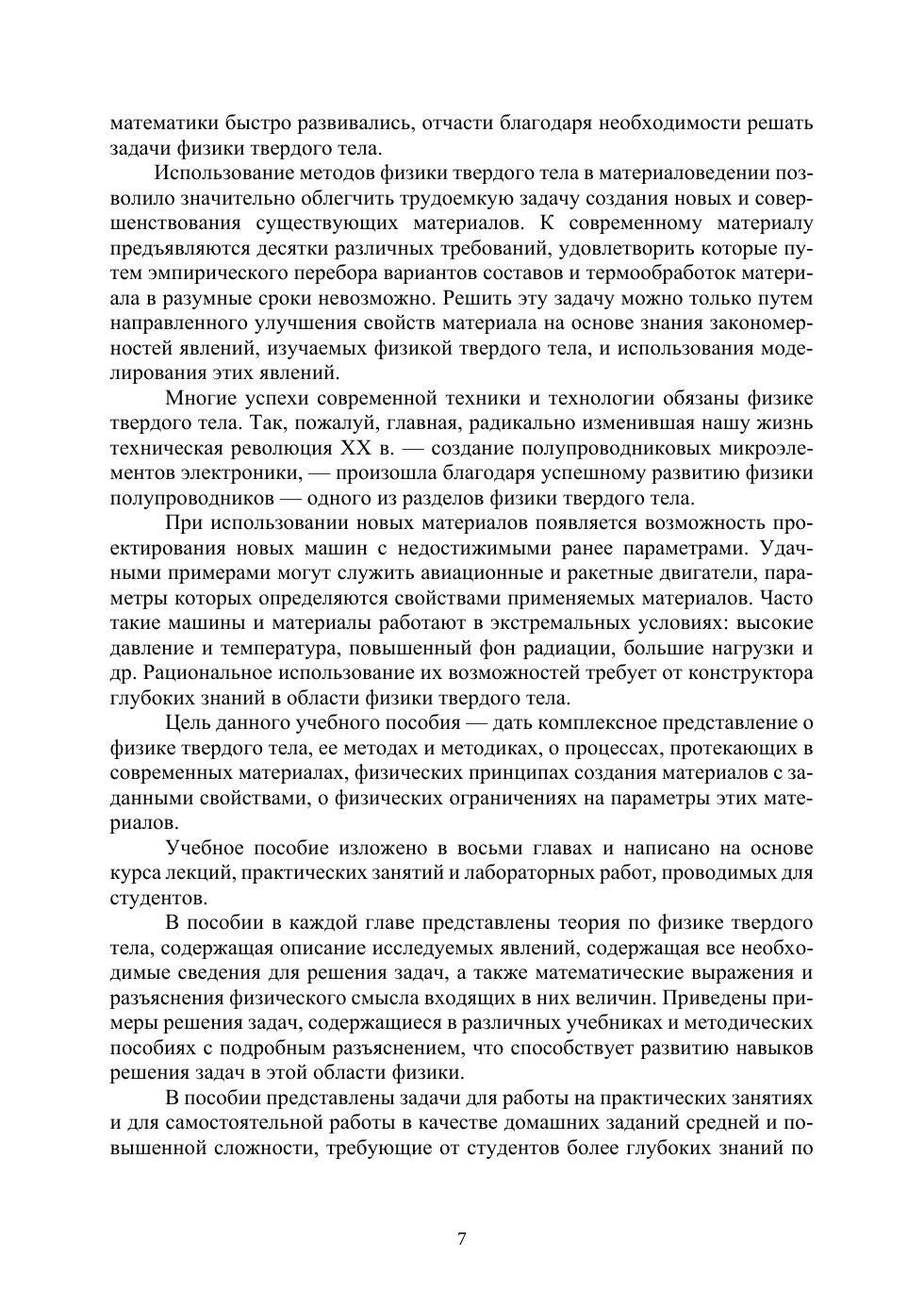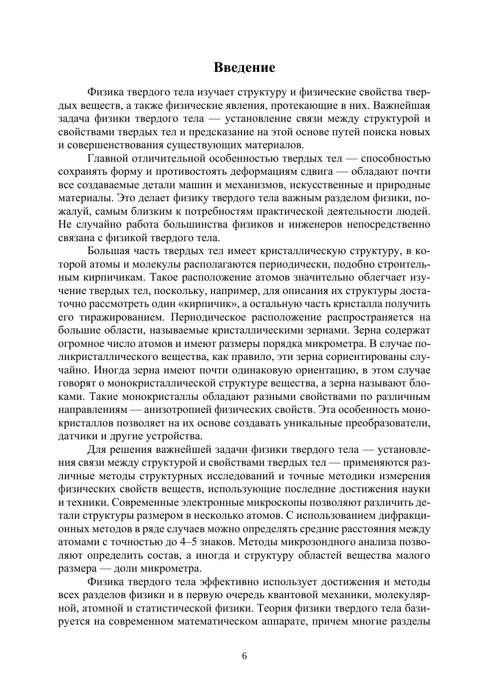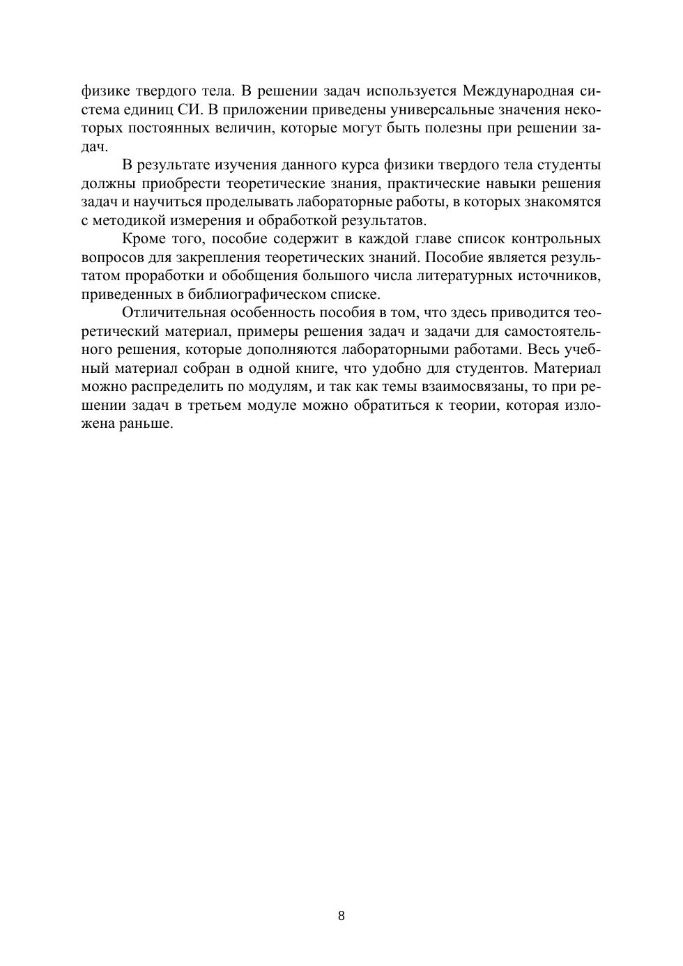 Рассмотрена структура кристаллов, зонная энергетическая структура полупроводников. Наглядно представлены типы связей в кристаллах, колебания решетки и модели описания теплоемкости полупроводников и металлов. Приведены свойства диэлектриков, динамические свойства и рассмотрены сегнетоэлектрические кристаллы. В общих чертах излагается теория Ферми газа и даются основные экспериментальные факты по сверхпроводимости и применение сверхпроводников. Рассматриваются полупроводники с собственной и примесной проводимостью, магнитные свойства. Приведены примеры решения задач, задачи для самостоятельного решения и виртуальные лабораторные работы. Весь курс физики можно разбить на три модуля.
