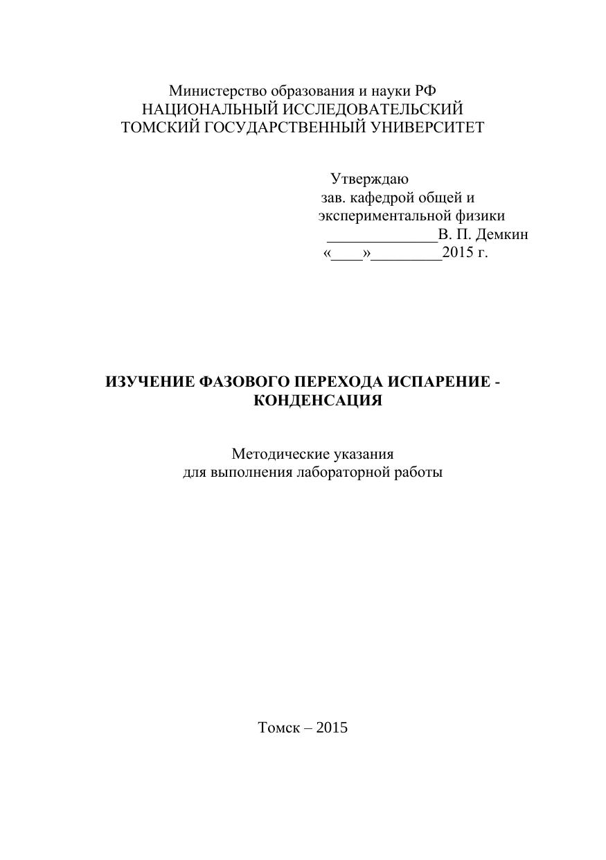 Изучение фазового перехода испарение - конденсация. Методические указания для выполнения лабораторной работы